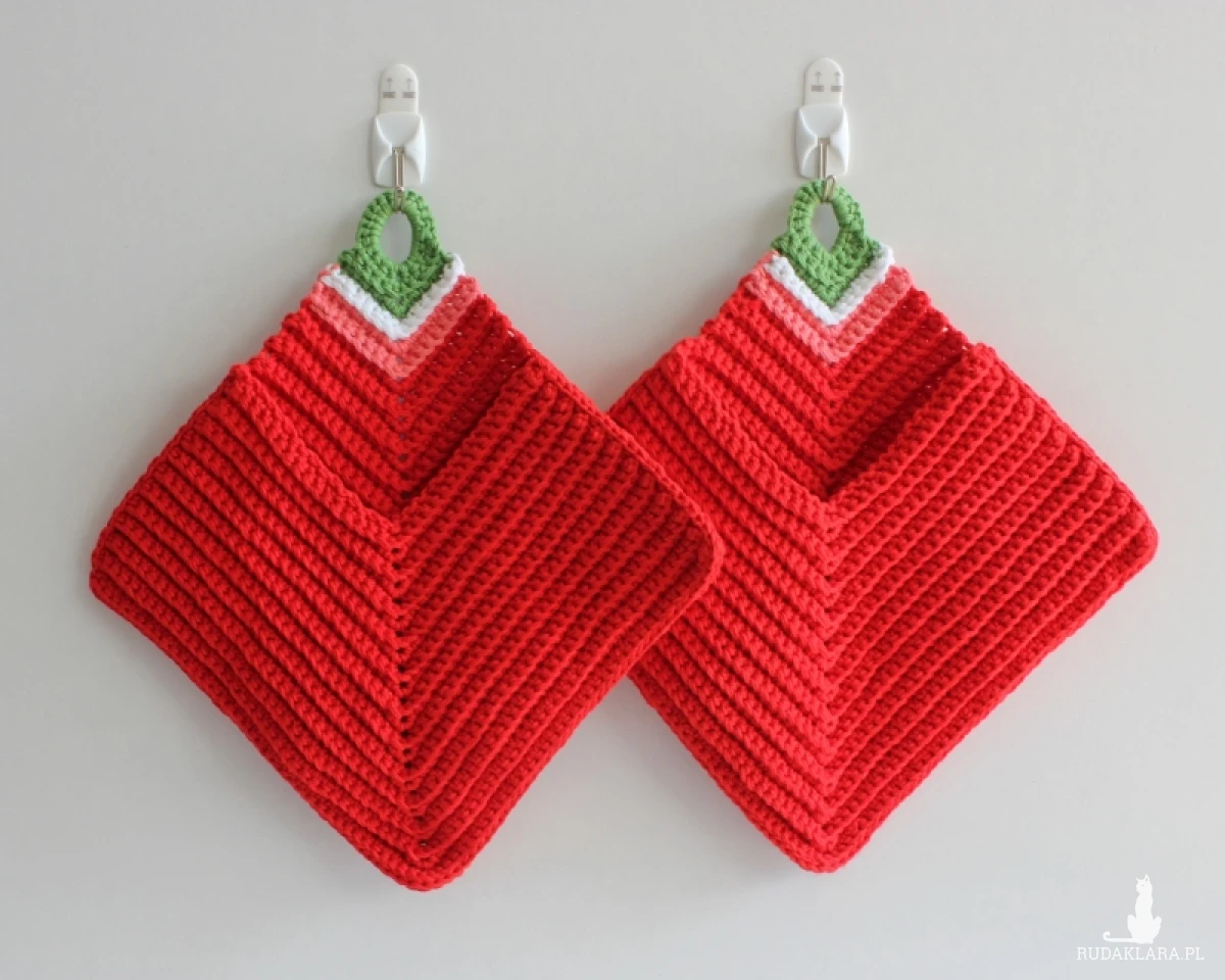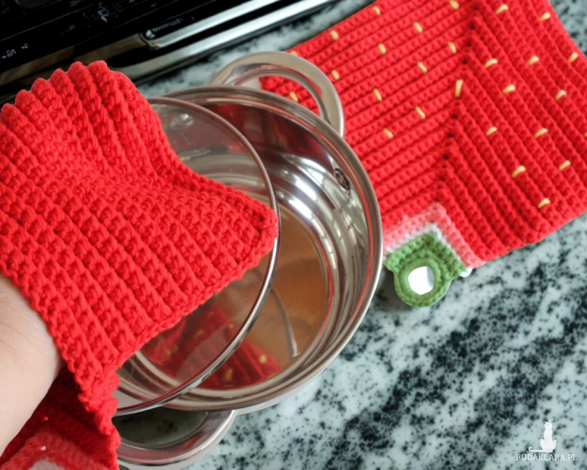 Ten produkt rękodzielniczy to połączenie dwóch funkcji: łapki kuchennej i rękawicy.