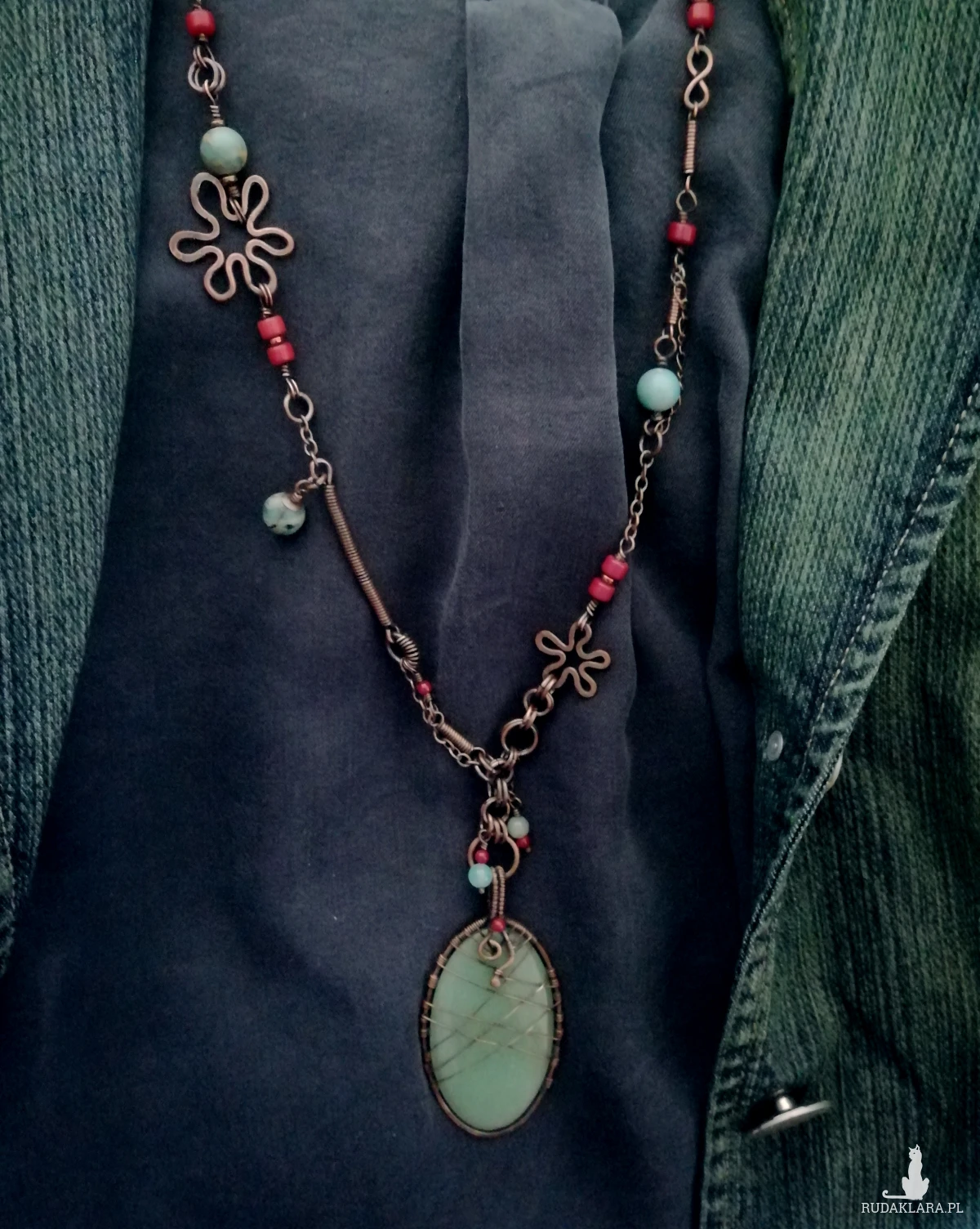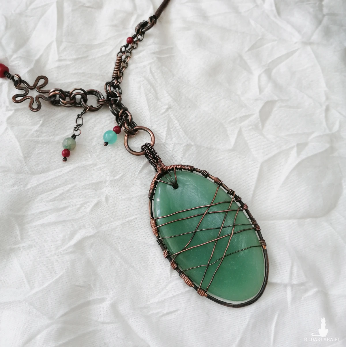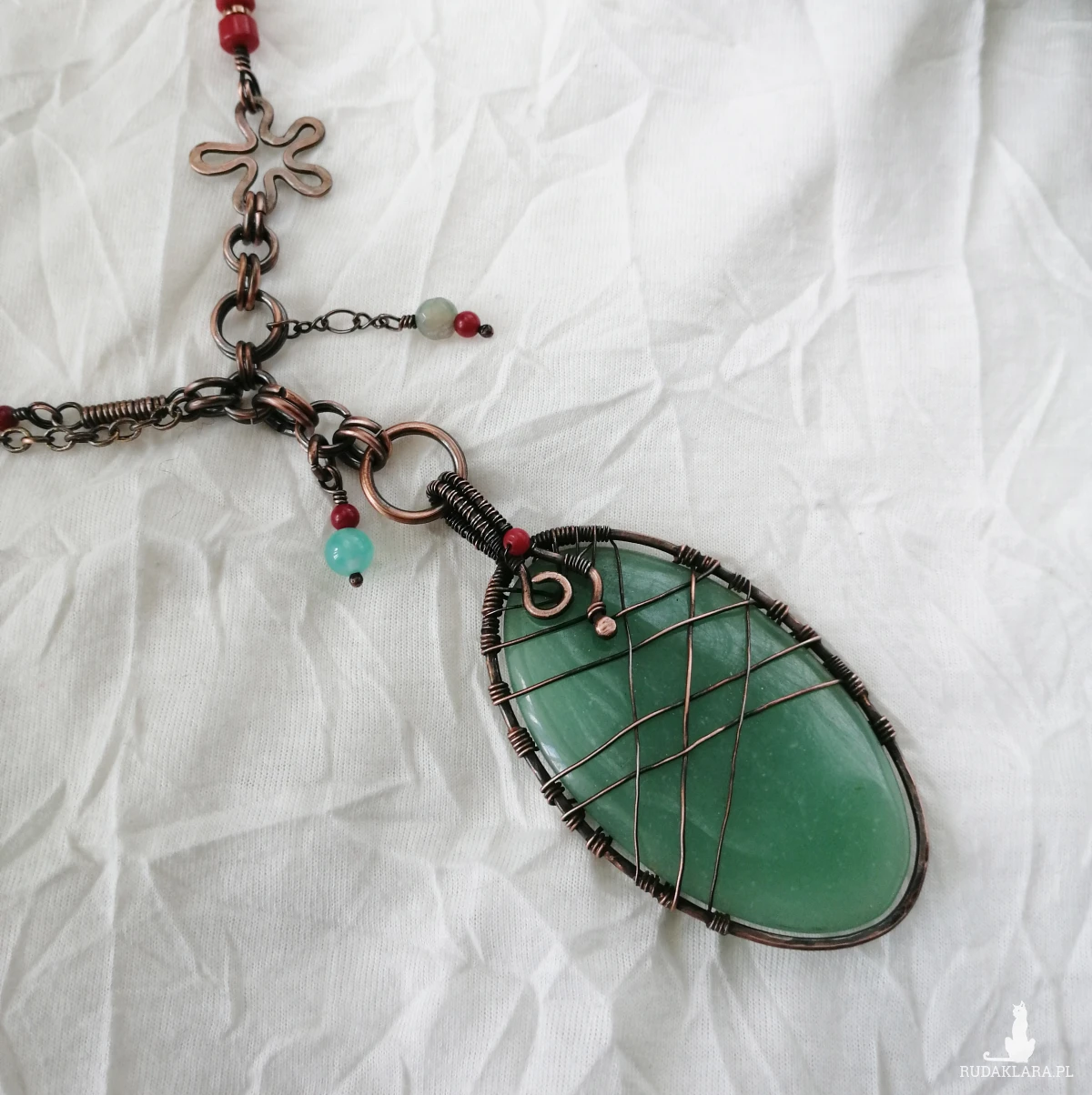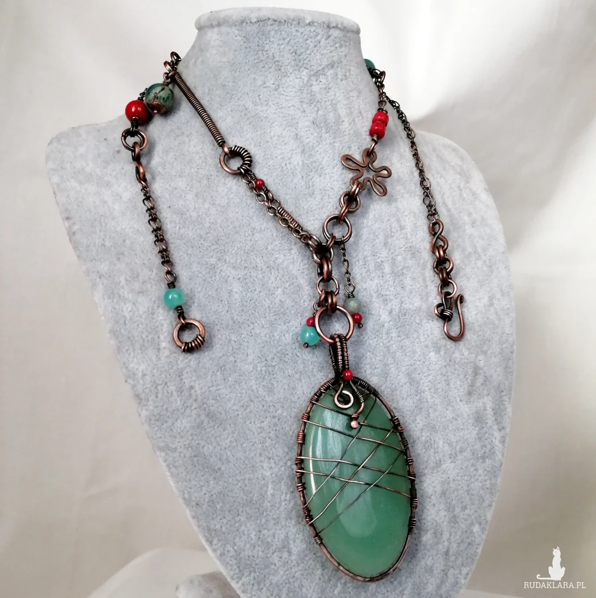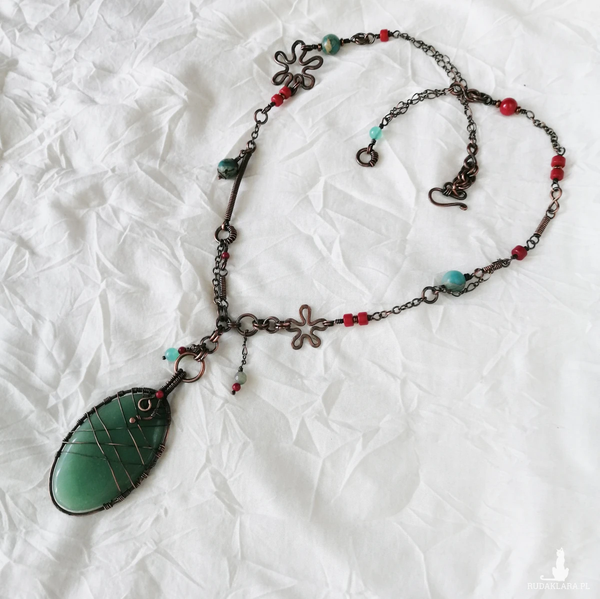 Naszyjnik boho wykonany z miedzi i kolorowych kamieni. W centrum znajduje się awenturyn o rozm. 60/40 mm. Elementy naszyjnika robione ręcznie, dodatkowo przyozdobione kamykami agatu (błękitny), jaspisu (niebieski w plamki), hematytu (małe dyski pomiędzy czerwonym koralem).