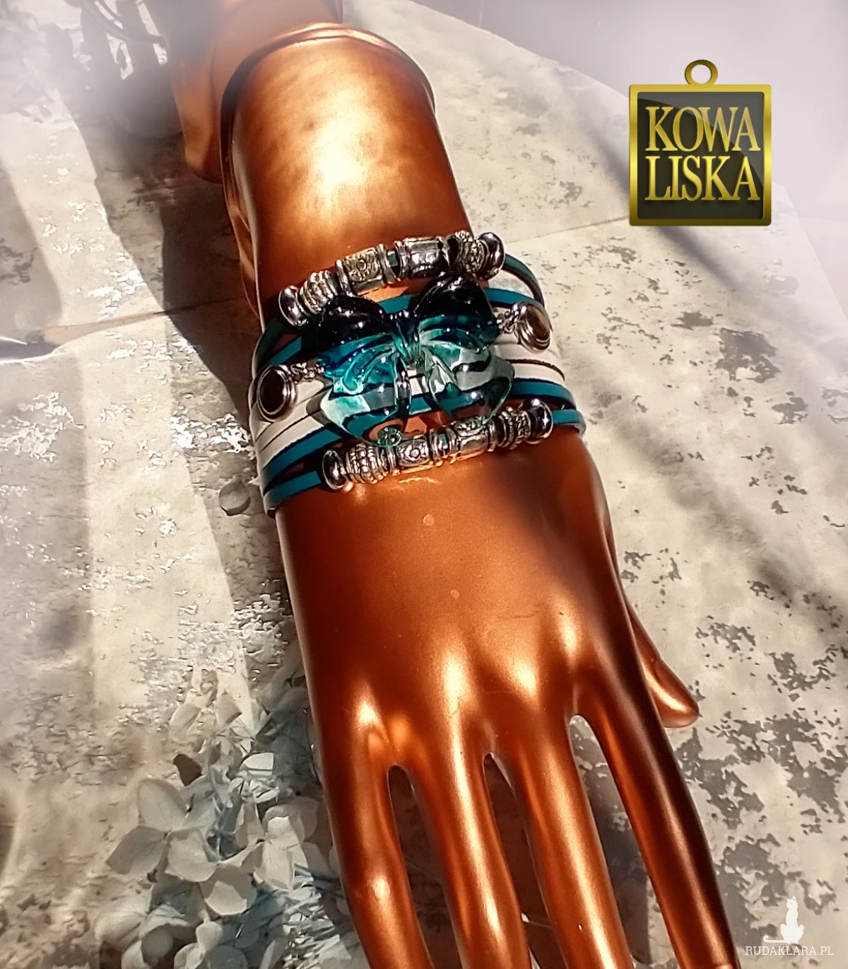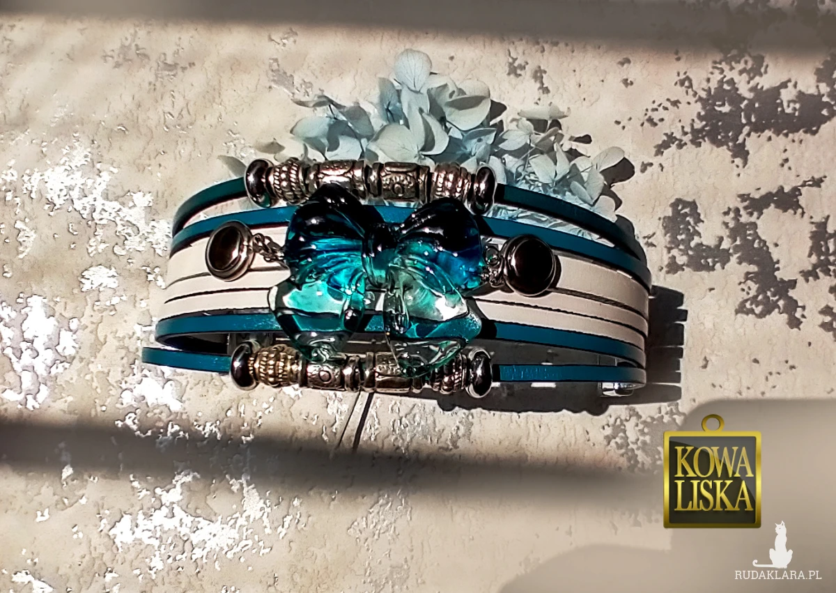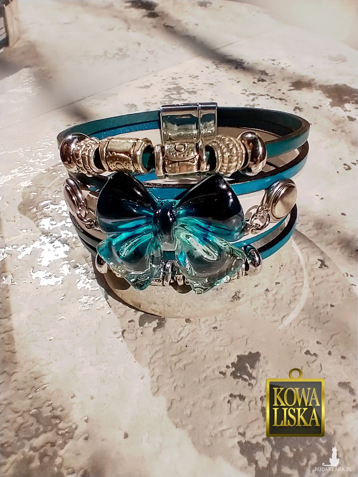 Piękna, żywiczna kokarda w przejrzystych odcieniach turkusu, zamontowana nitami na rzemiennych paskach, ozdobionych wyrazistymi, metalowymi przekładkami. Przekładki trzymają się w jednym miejscu dzięki stoperom, ale da się je dowolnie przesuwać.