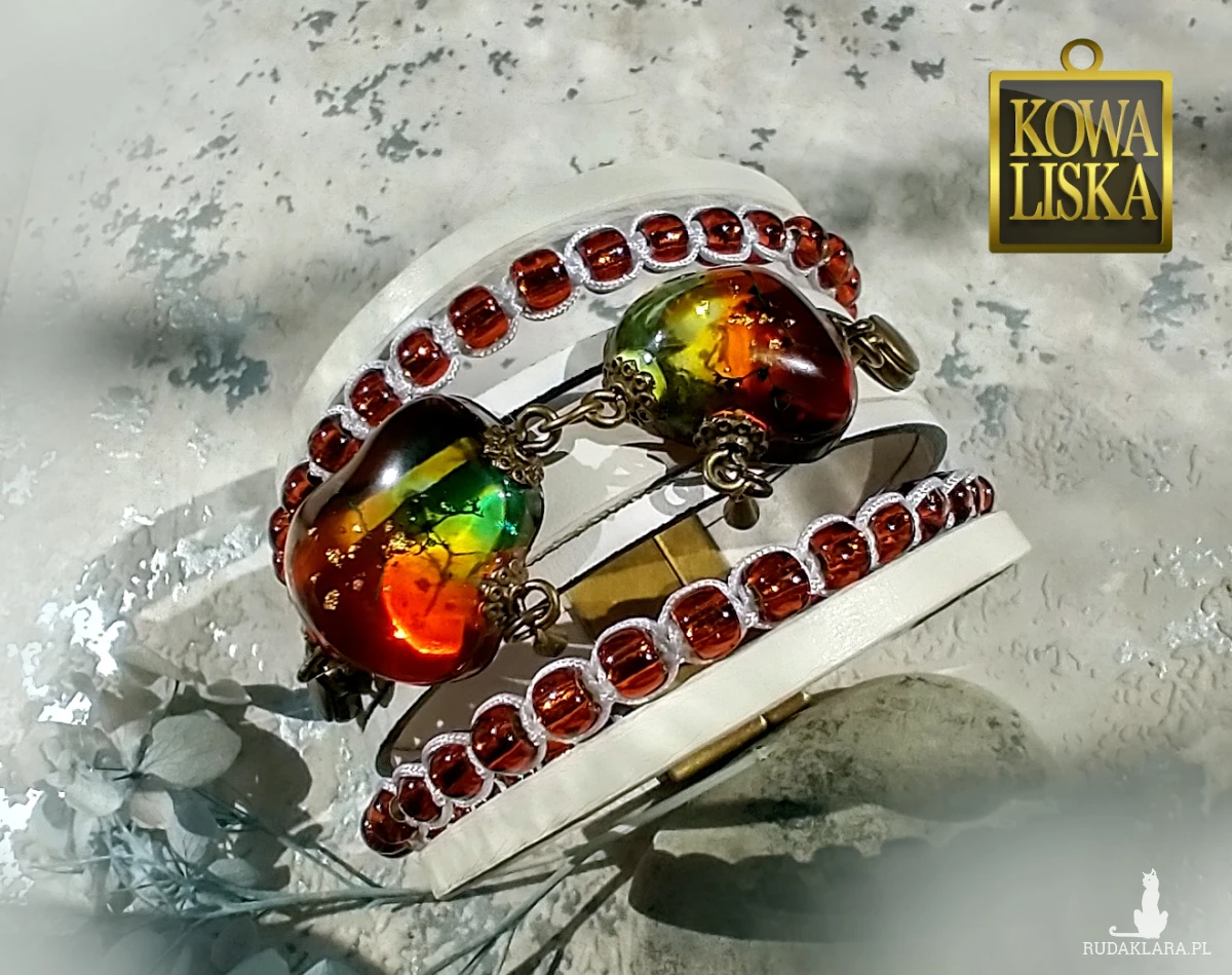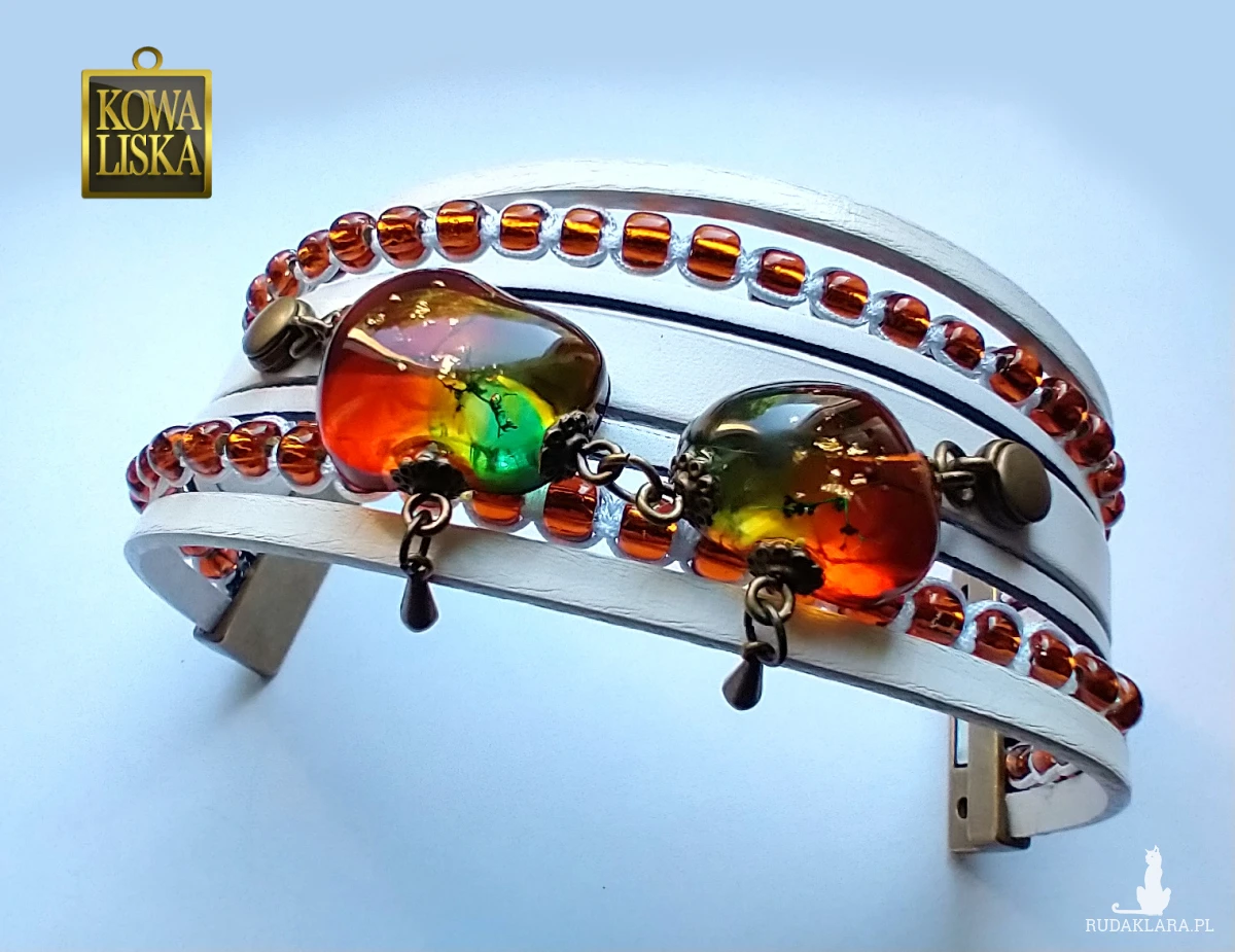 Efektowna bransoleta, której centralnym elementem są duże, bursztynowe "kamienie" z żywicy, zamontowane na skórzanych pasach.
