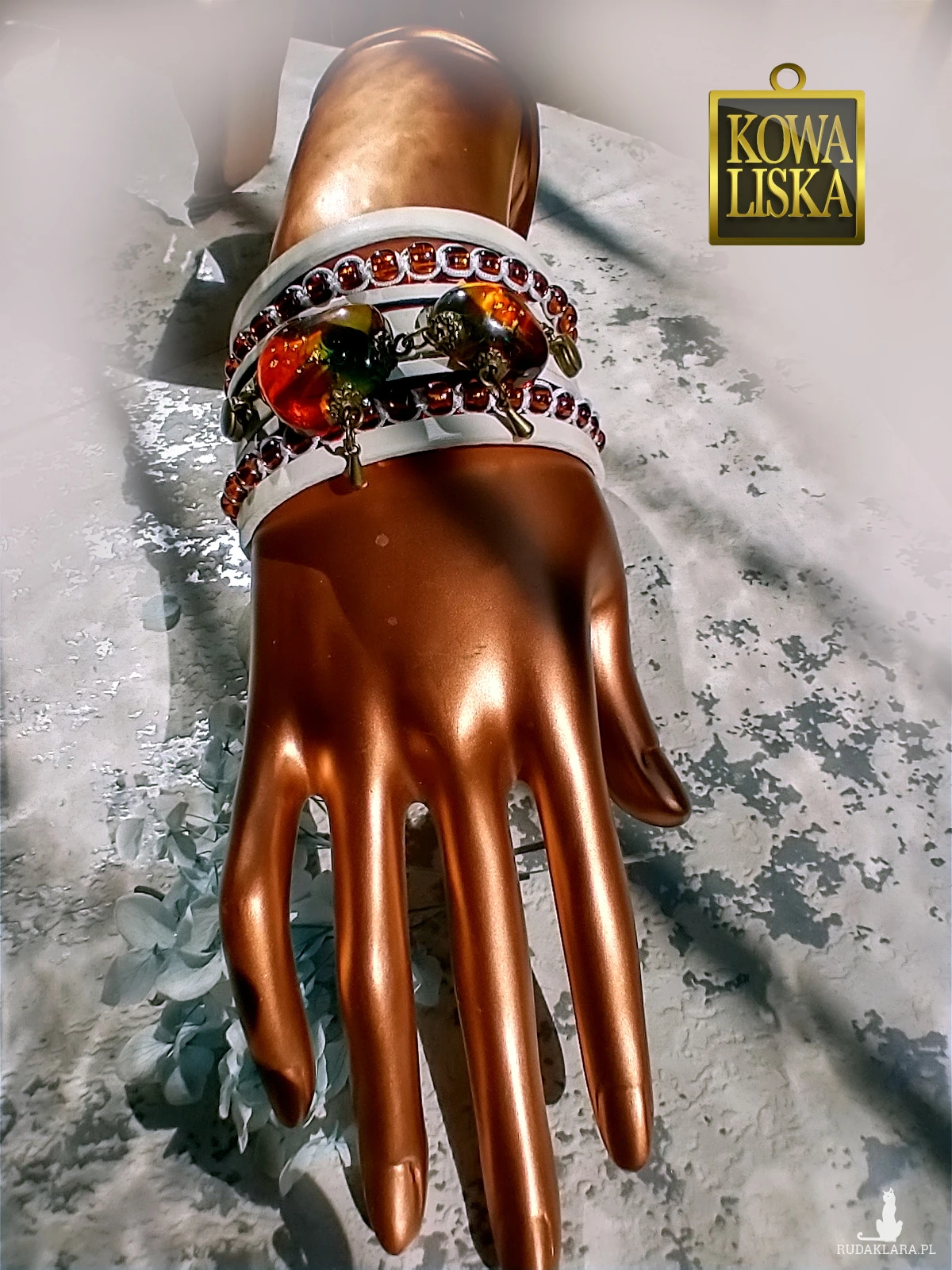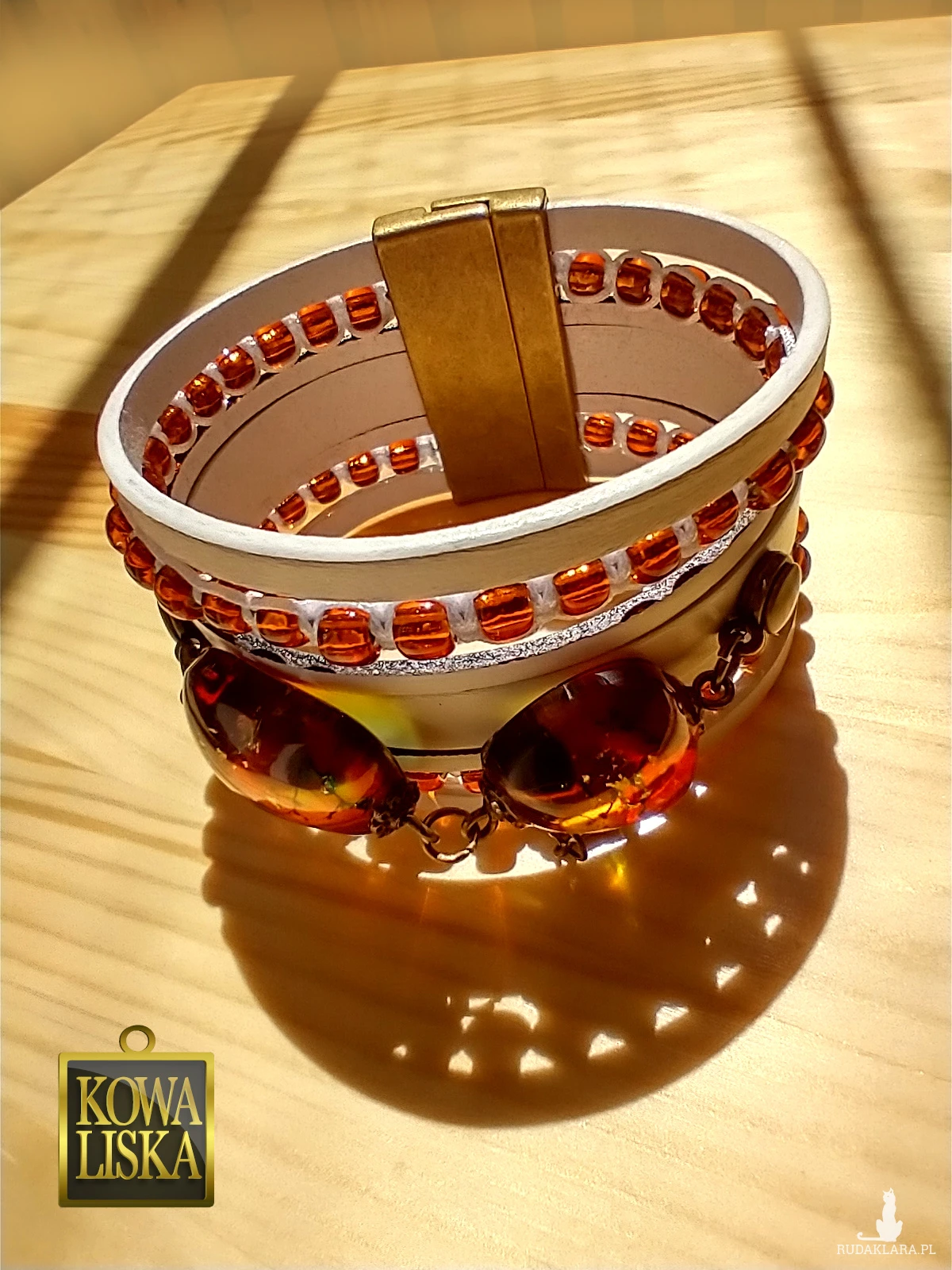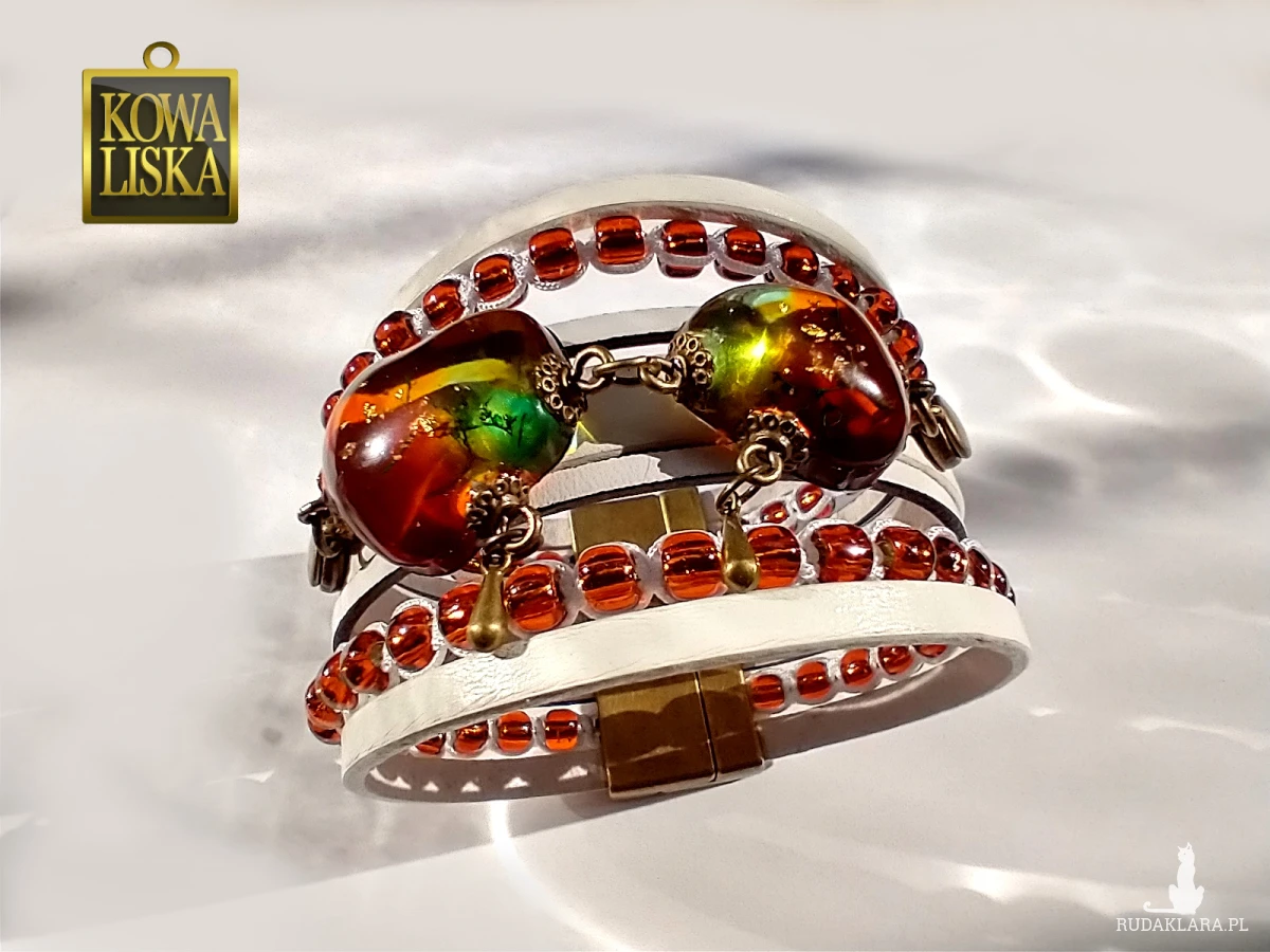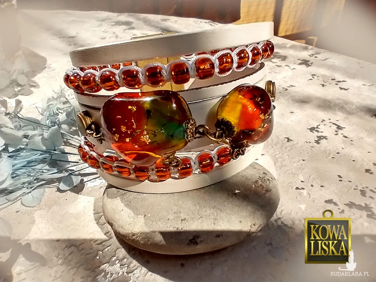 Ciężka i szeroka, bardzo dobrze leży i pięknie odbija światło, jest widoczna z daleka. Słońce wydobywa z niej ciepły, słoneczny blask, a wplecione bursztynowe koraliki potęgują efekt. Idealna na lato.