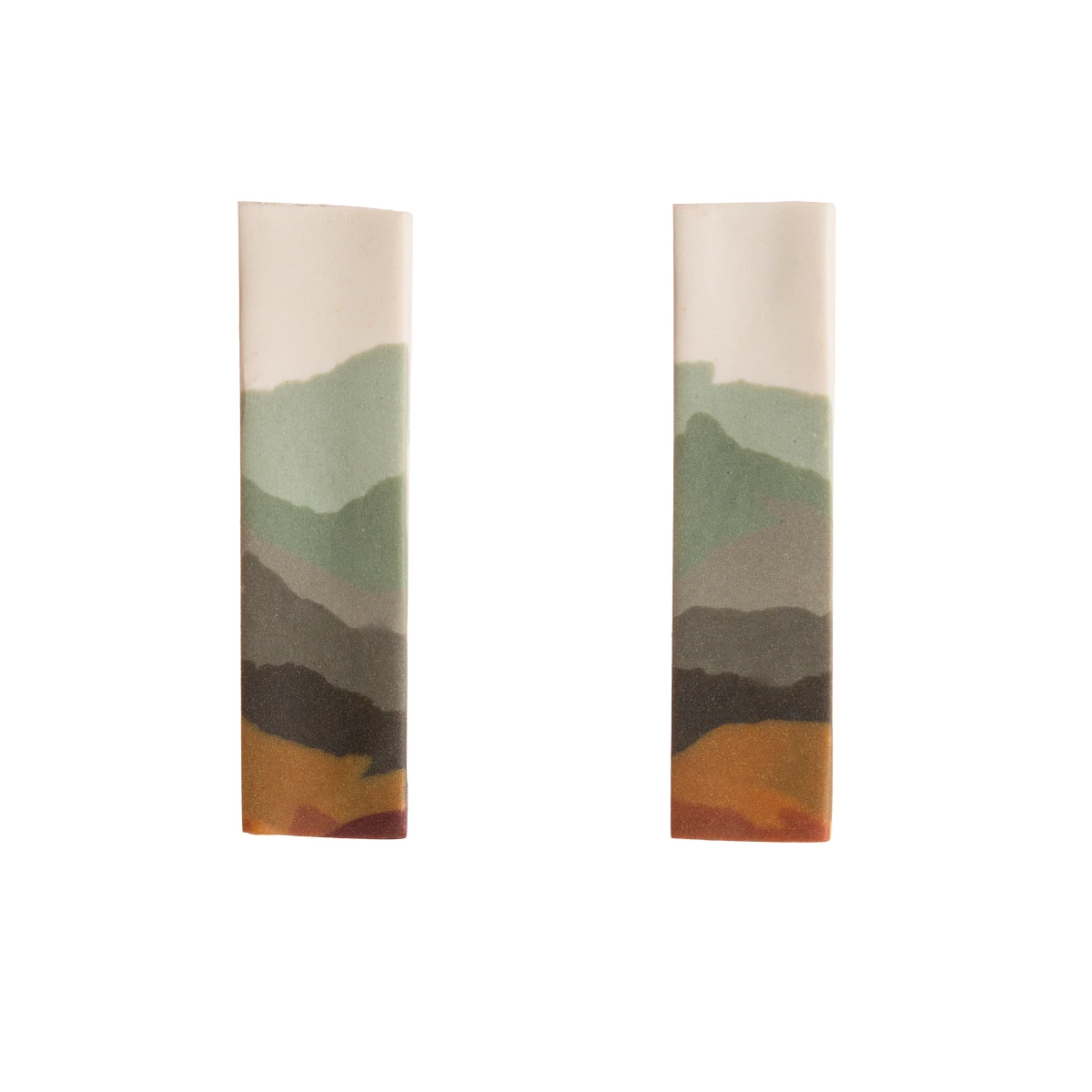 Ręcznie wykonane kolczyki. Prostokątne sztyfty z unikatowymi wzorami nawiązującymi do krajobrazu. Kompozycja stopniowo przechodzących, stonowanych kolorów - tzw. "barw ziemi". Kolczyki są lekkie, niemal niewyczuwalne przy noszeniu, a hipoalergiczne materiały gwarantują komfort użytkowania przez cały dzień.
