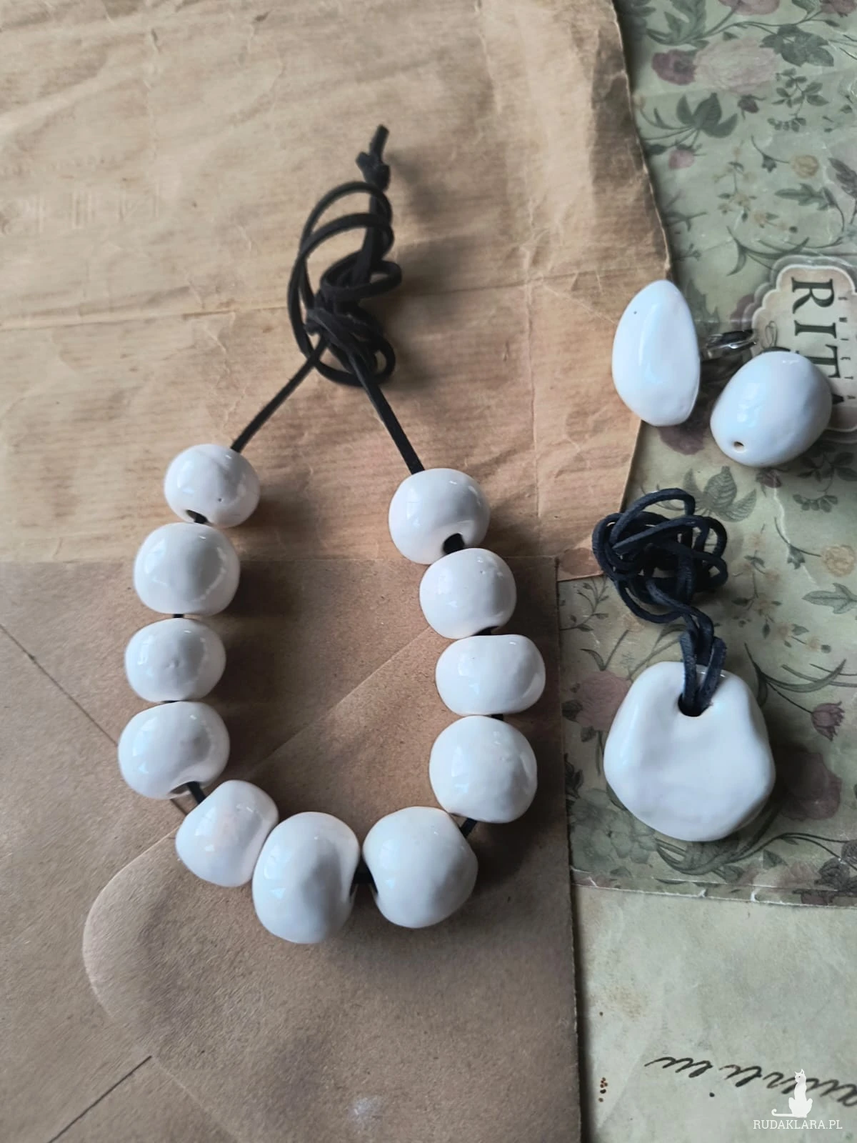 Komplet biżuterii ceramicznej złożony z korali, wisiorka i 2 par pierścionków wykonanych z gliny szamotowej, wypalonych na biskwit a następnie szkliwionych w temperaturze 1260 stopni C. Średnica pierścionków ok 2,5-3 cm. Serdecznie polecam Paniom poszukującym nietuzinkowej biżuterii.