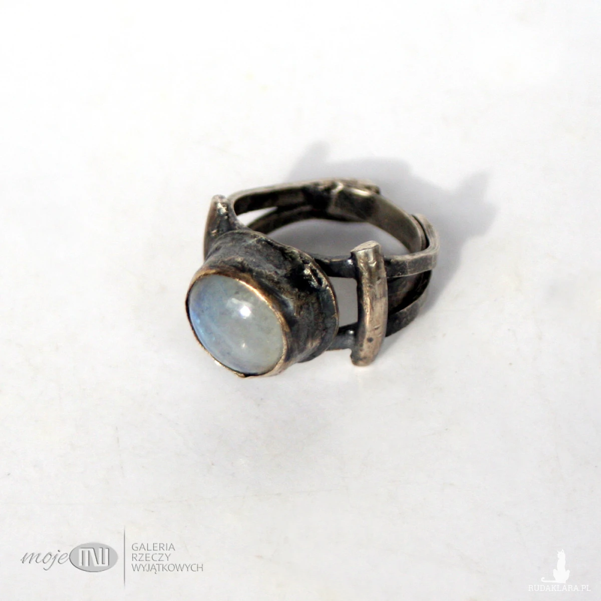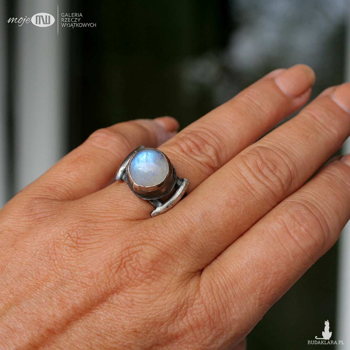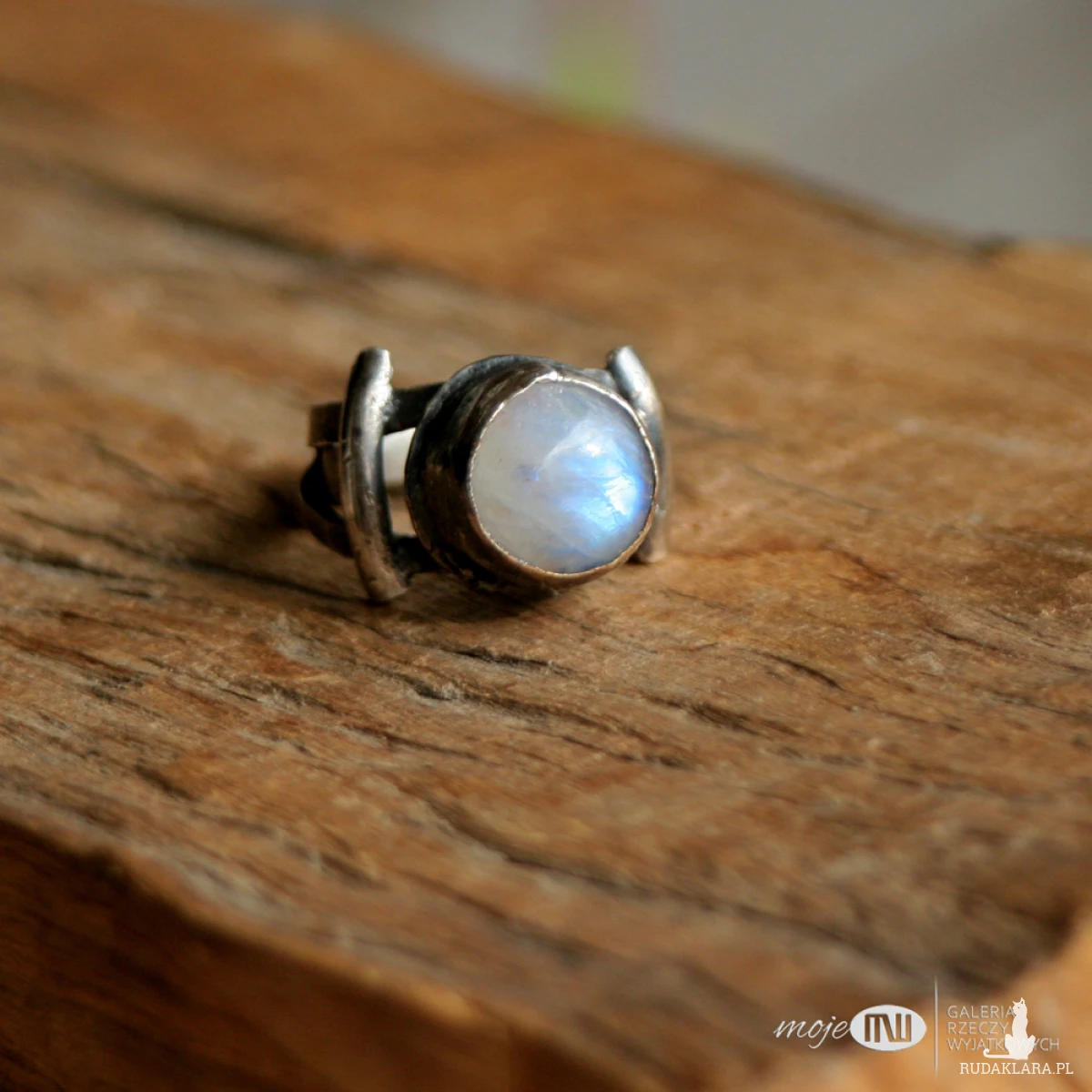 Duży, okrągły kamień księżycowy z piękną błękitną emanacją oprawiony jest w srebro próby min. 925. Srebro jest oksydowane i przecierane. Pierścionek jest rustykalny i efektowny.