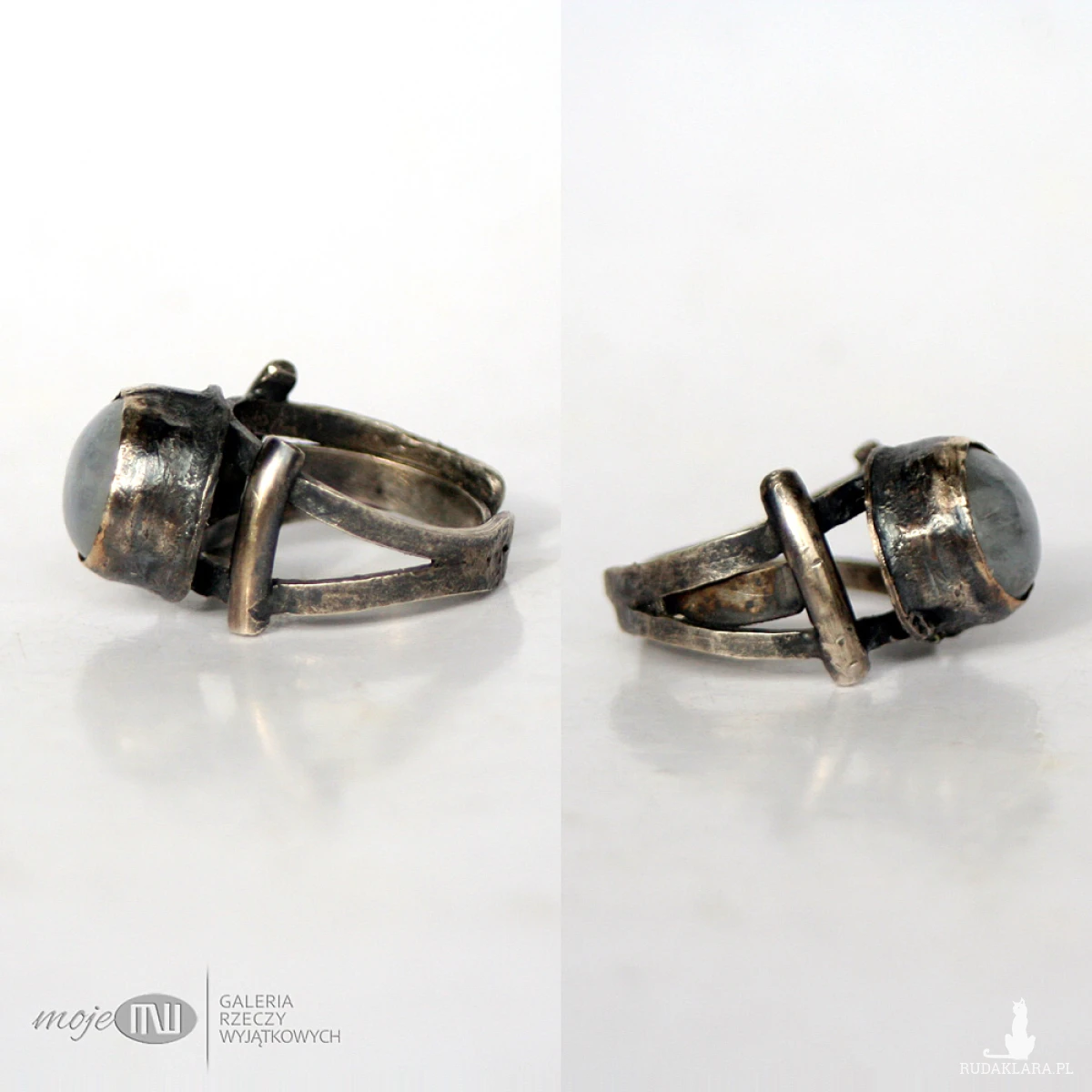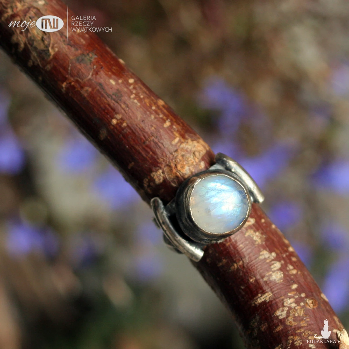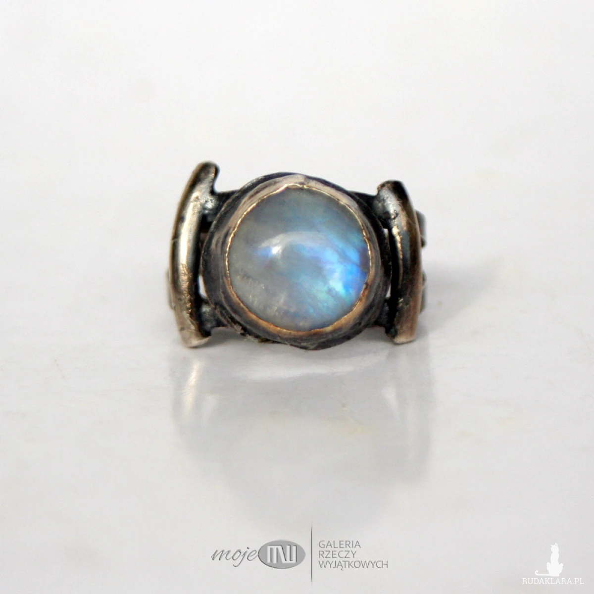 Duży, okrągły kamień księżycowy z piękną błękitną emanacją oprawiony jest w srebro próby min. 925. Srebro jest oksydowane i przecierane. Pierścionek jest rustykalny i efektowny.