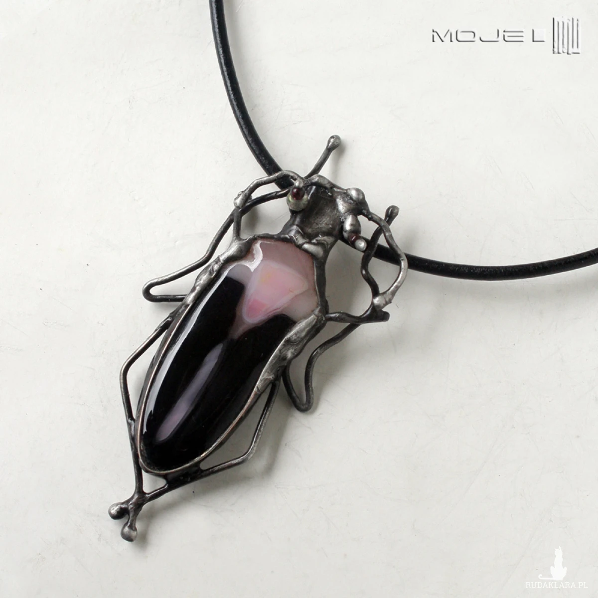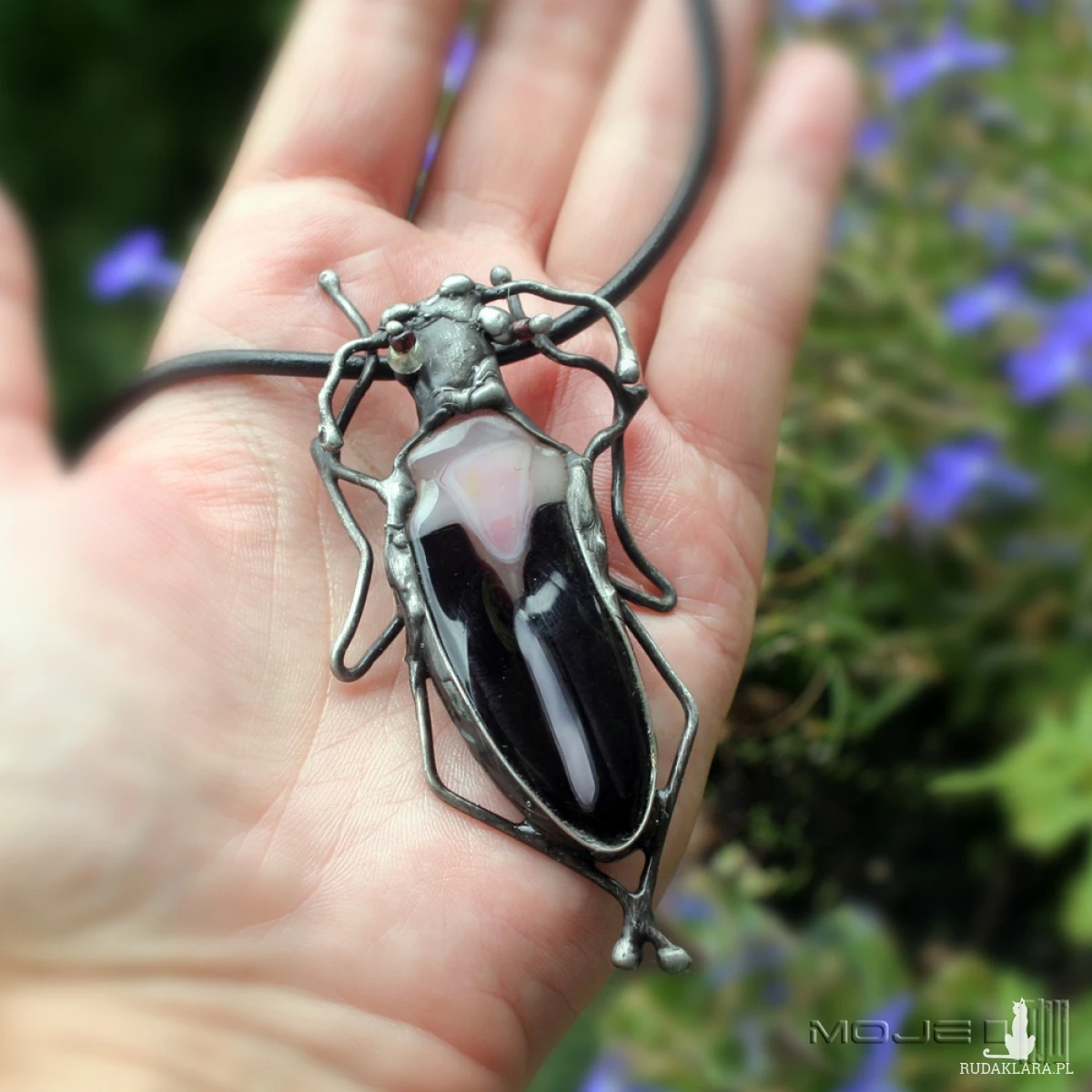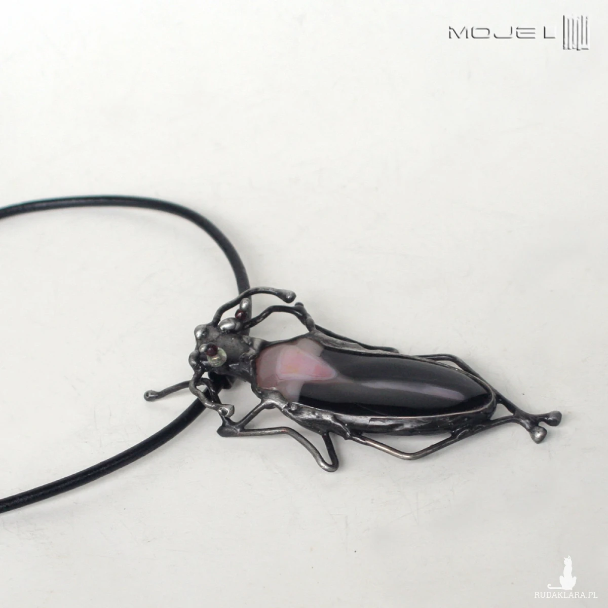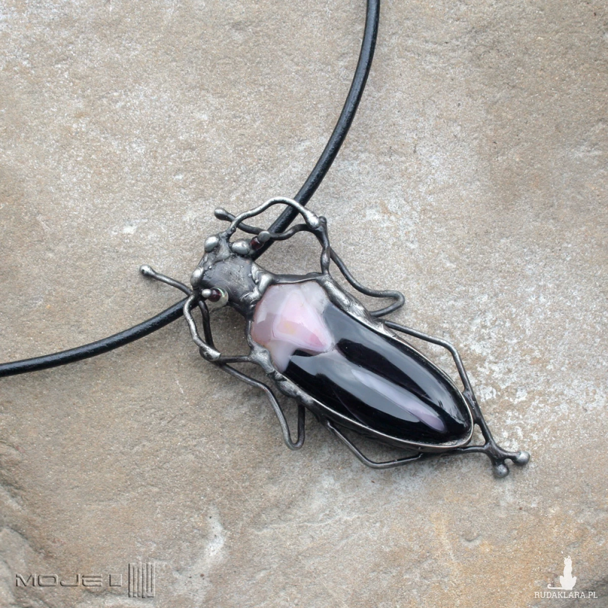 Różowo-śliwkowy żuk - wisior wytopiłam z nieprzejrzystego szkła w temperaturze kilkuset stopni metodą fusingu.
