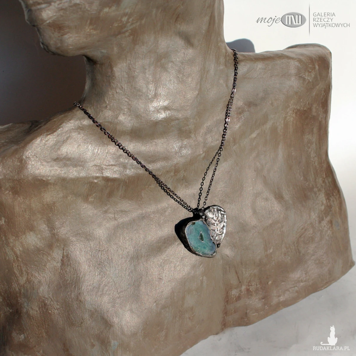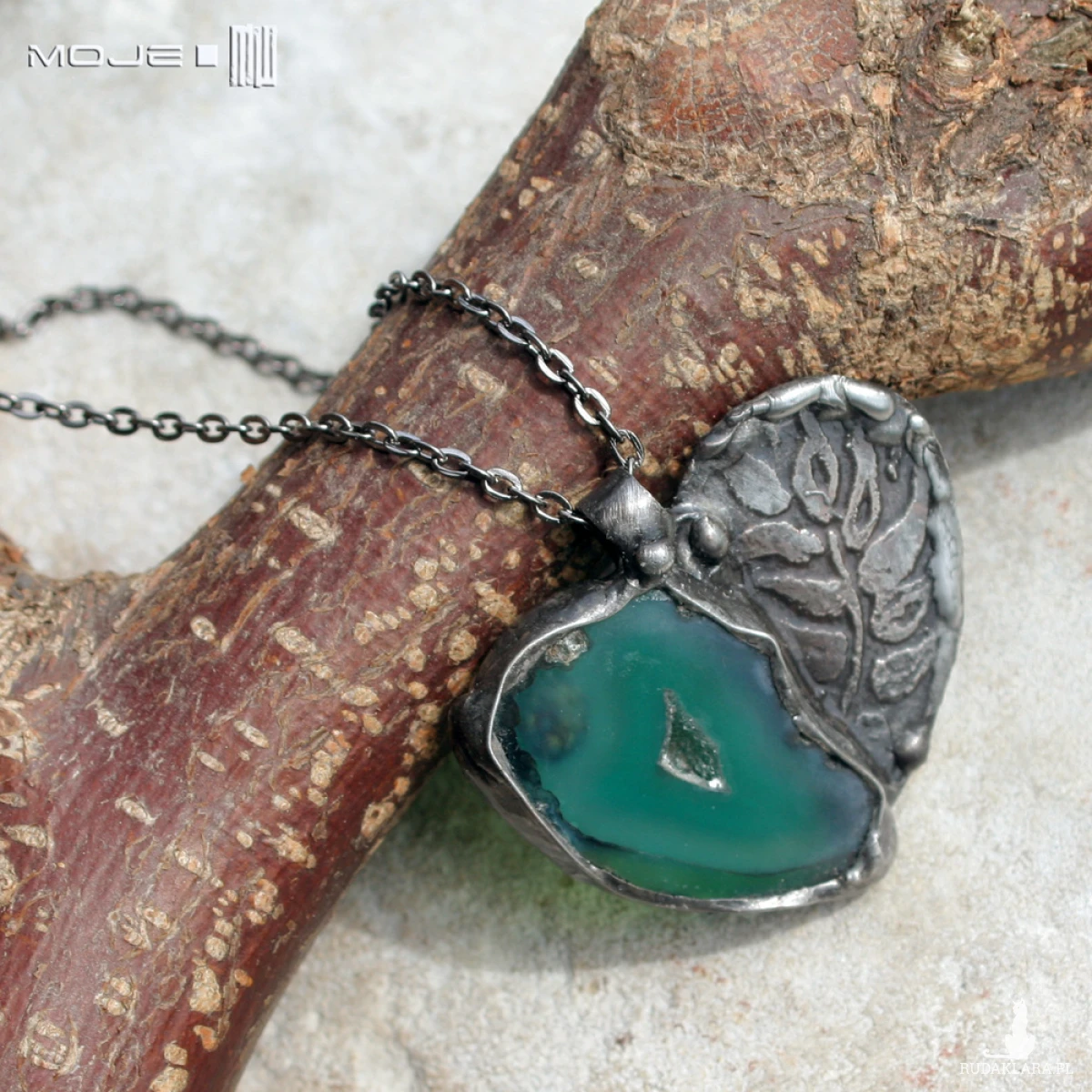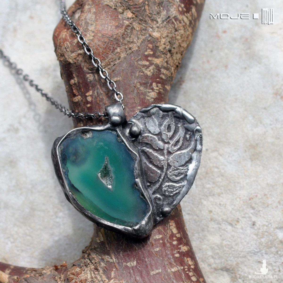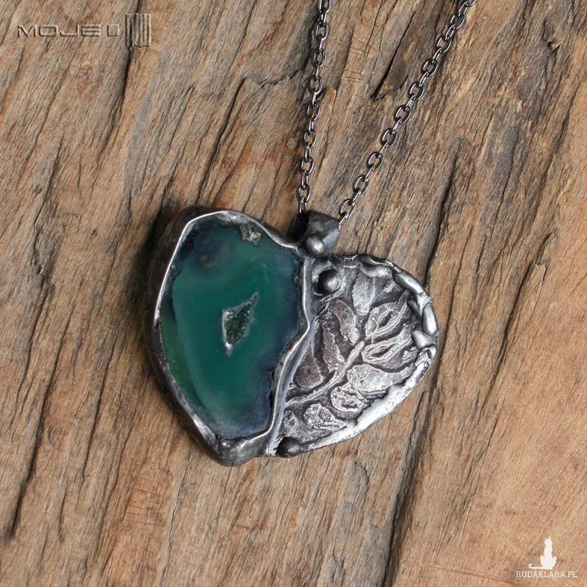Wisior w kształcie serca uformowany z plastra agatu w pięknym zielonym kolorze i miedzi. Trawiony florystyczny wzór urozmaica powierzchnię metalu. Wisior zawieszony jest na łańcuszku w kolorze grafitowym. Zazwyczaj dodaję łańcuszek o długości ok. 60-70 cm, ale klient może podać długość, która go interesuje.
