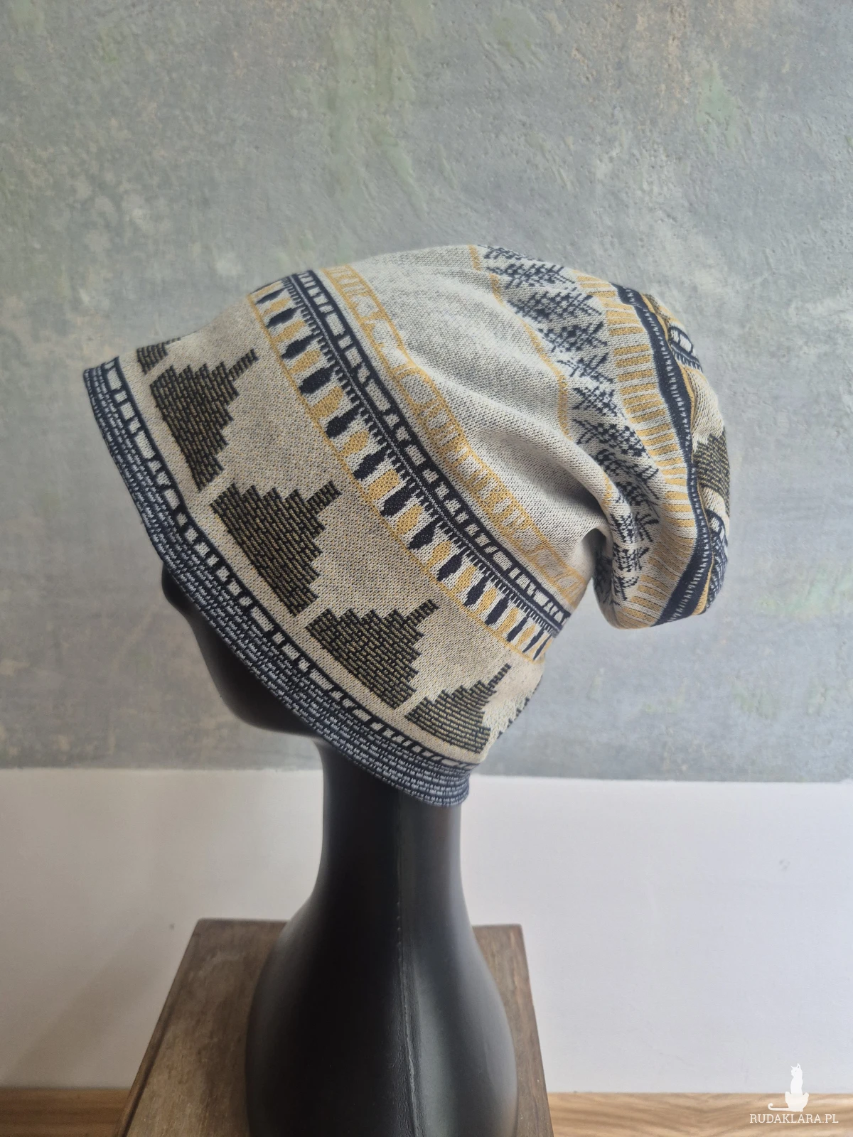 Czapka kobieca etno smerfetka fantastyczny materiał na podszewce rozmiar uniwersalny świetna na codzienne noszenie na rower na brak fryzury na poprawę nastroju nad morze Box 44