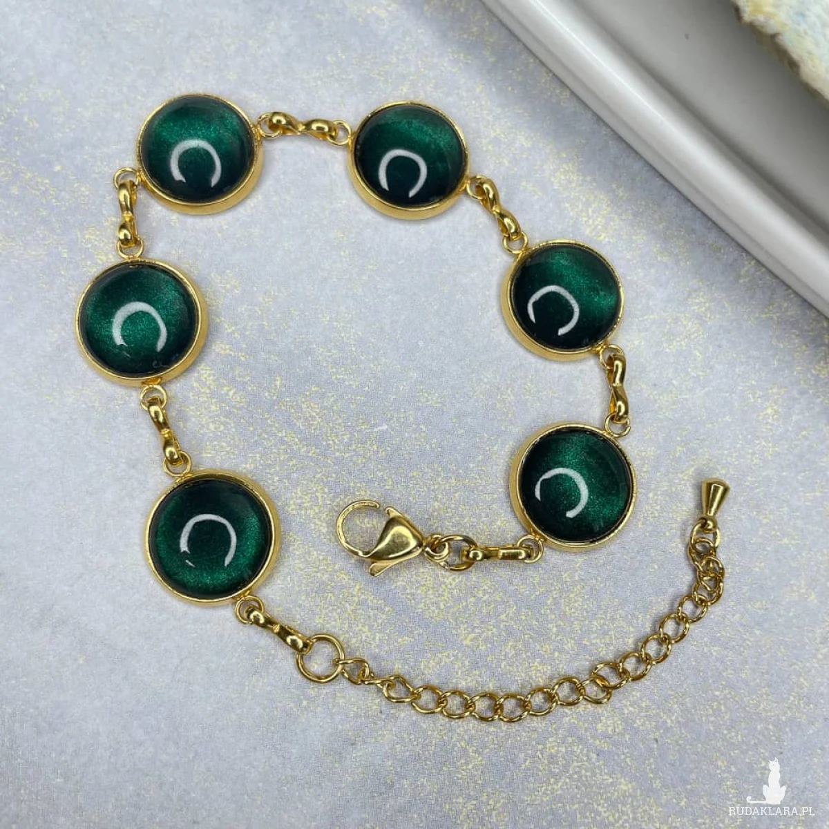 Ta pełna blasku bransoletka jest częścią kolekcji “W blasku perłowego księżyca”. Bransoletka wykonana jest z ręcznie malowanych kaboszonów umieszczonych w bazach ze stali szlachetnej. Szklane elementy zachwycają subtelnym, opalizującym blaskiem, który jest niczym odbicie księżyca na tafli wody. Bransoletka mieni się w świetle, przyciągając wzrok i dodając elegancji każdej stylizacji. Ten dodatek jest idealny dla osób ceniących sobie wyrafinowaną i ponadczasową biżuterię. Materiał: stal szlachetna, malowane ręcznie szkło Wykończenie: połysk Długość bransoletki: ok 17 cm + przedłużka 5cm Średnica kaboszonu: 12 mm SKU: e45/68 Jak dobierać komplety? Kolory na zdjęciach mogą się różnić ze względów technicznych. Aby dobrać identyczny odcień, zwróć uwagę na numer SKU produktu. Pierwsza część to numer modelu, a numery po “/” to kolor, np. /17 oznacza morski perłowy. Produkty z tym samym SKU po "/" mają identyczny kolor. Dzięki temu możesz łatwo tworzyć komplety, mając pewność, że biżuteria jest w tym samym odcieniu. Stwórz własny komplet! Jeśli nie ma biżuterii w wybranym modelu lub kolorze którego szukasz, możesz ją zamówić indywidualnie. Wyślij do nas maila z nazwą, numerem modelu i kolorem, a my w miarę możliwości wykonamy biżuterię na zamówienie. Termin realizacji ustalamy indywidualnie. Biżuteria zostanie elegancko zapakowana. W przypadku zakupu kompletu, biżuteria zostanie zapakowana razem. Kolory na zdjęciach mogą delikatnie różnić się od rzeczywistych.