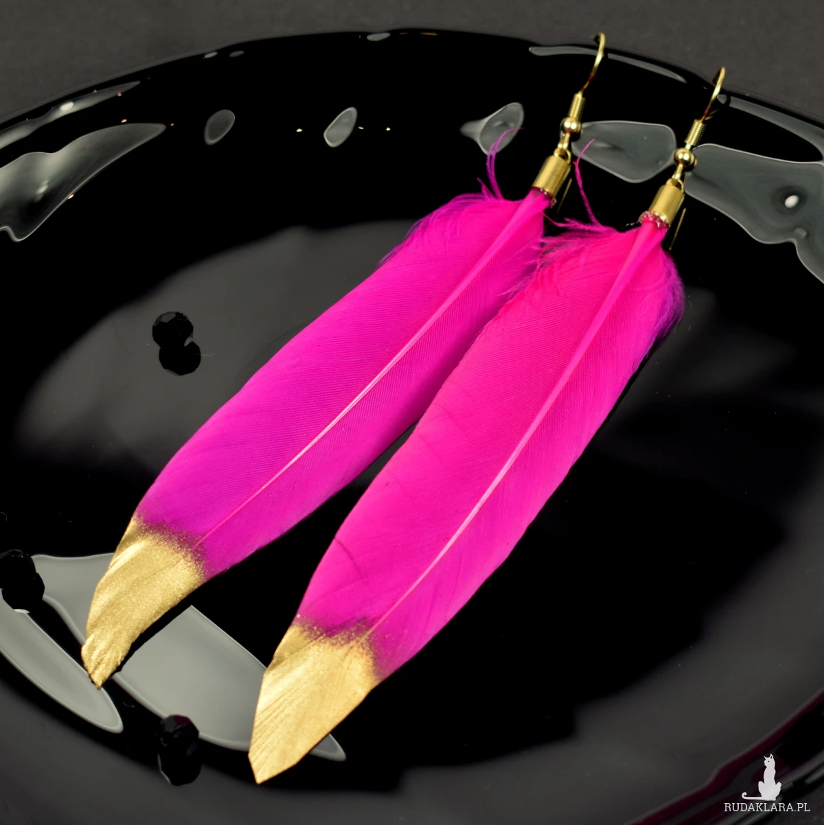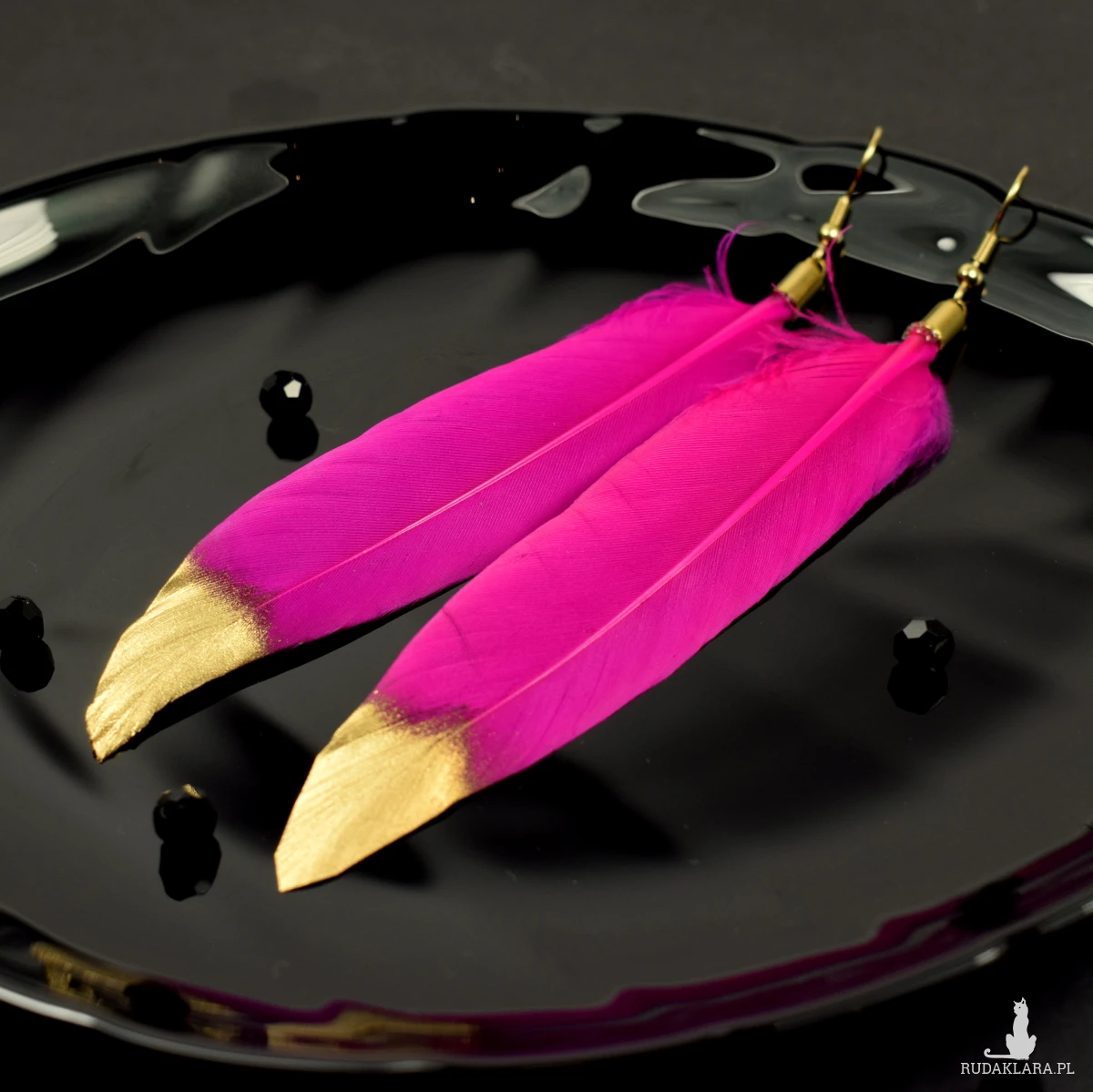 Zjawiskowe kolczyki z delikatnymi piórami w głębokim odcieniu fuksji z