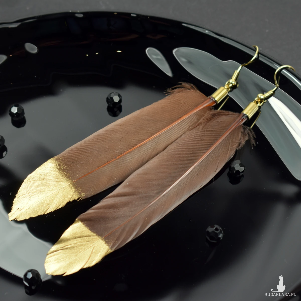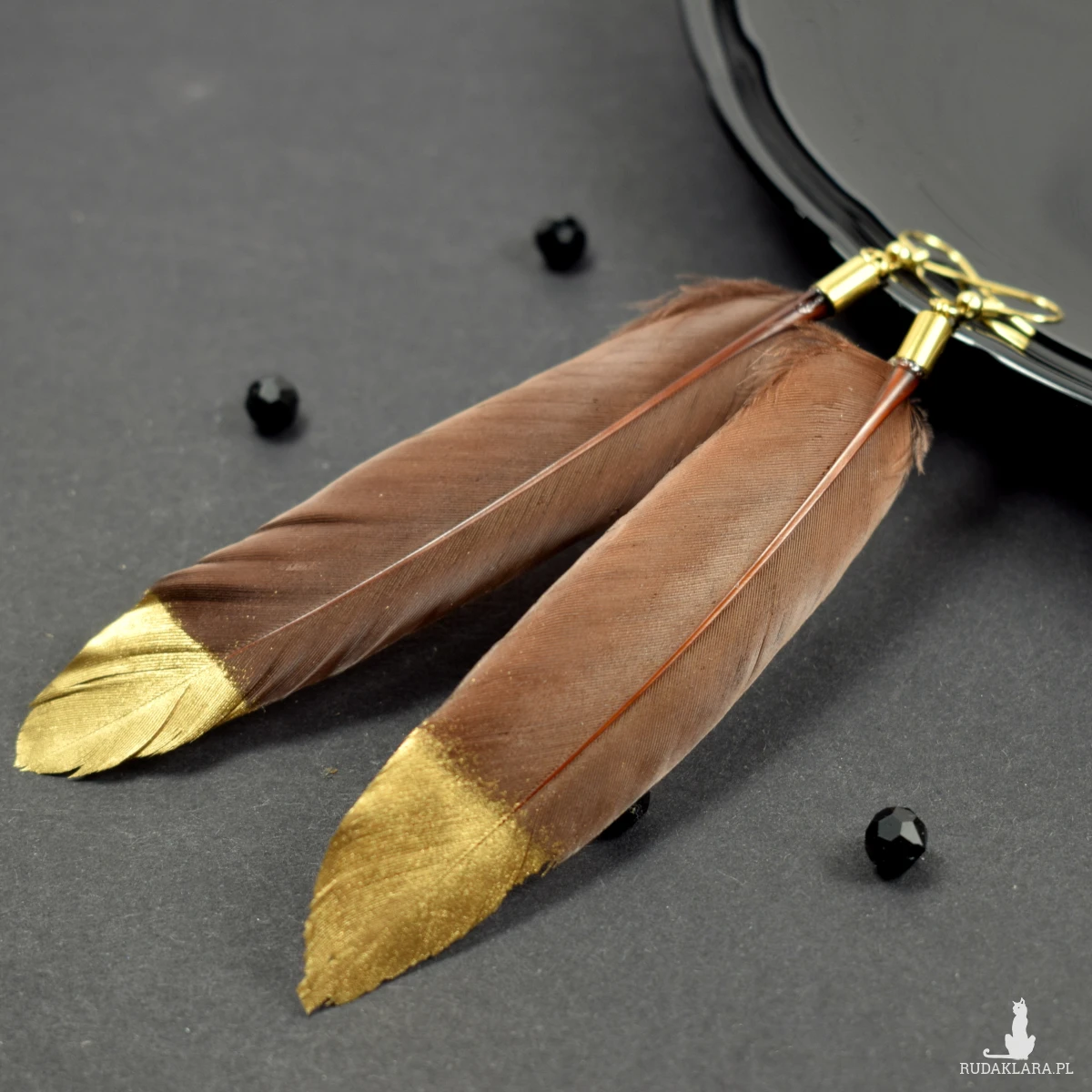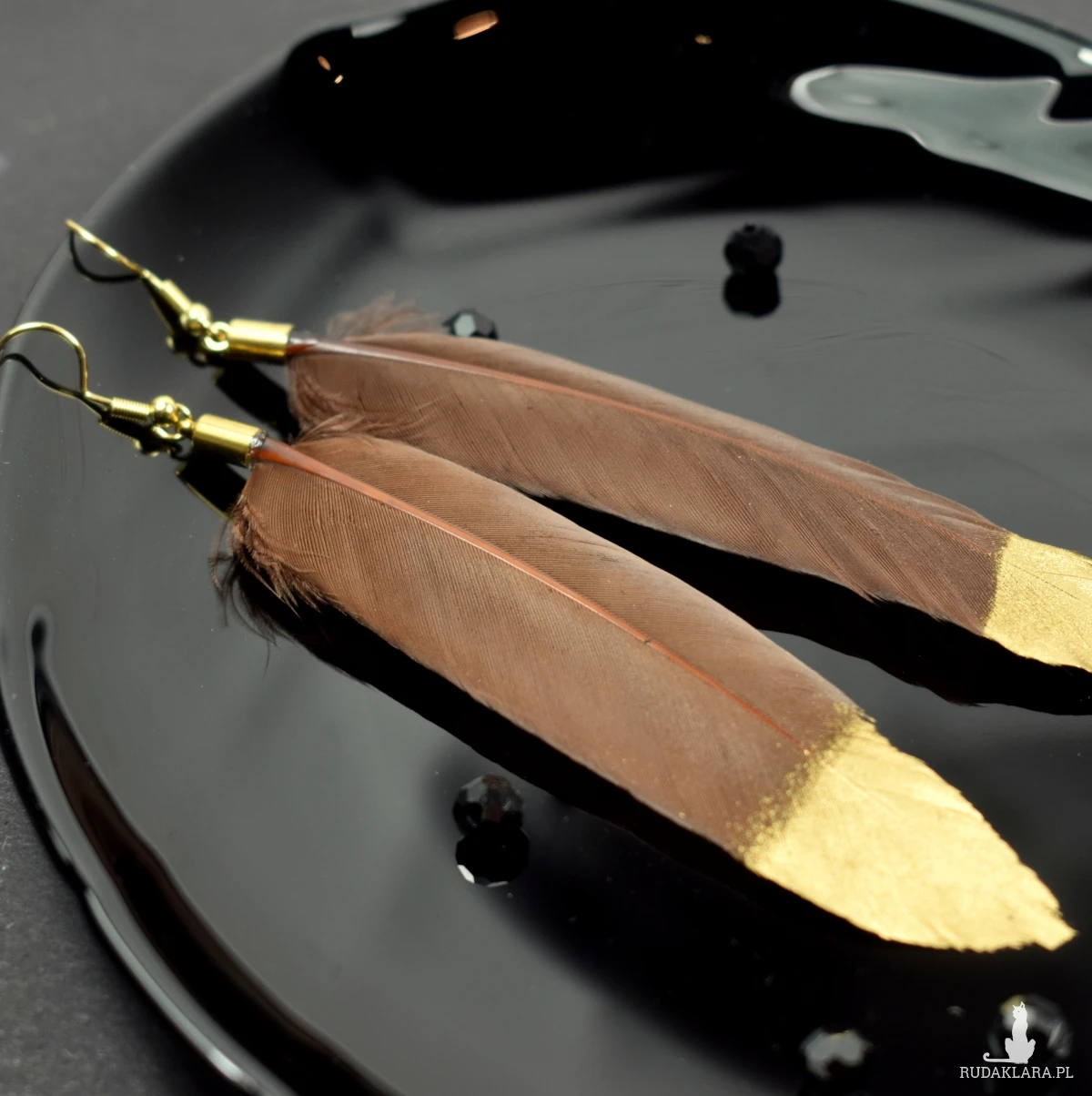 Zjawiskowe kolczyki z delikatnymi piórami w głębokim odcieniu brązu z