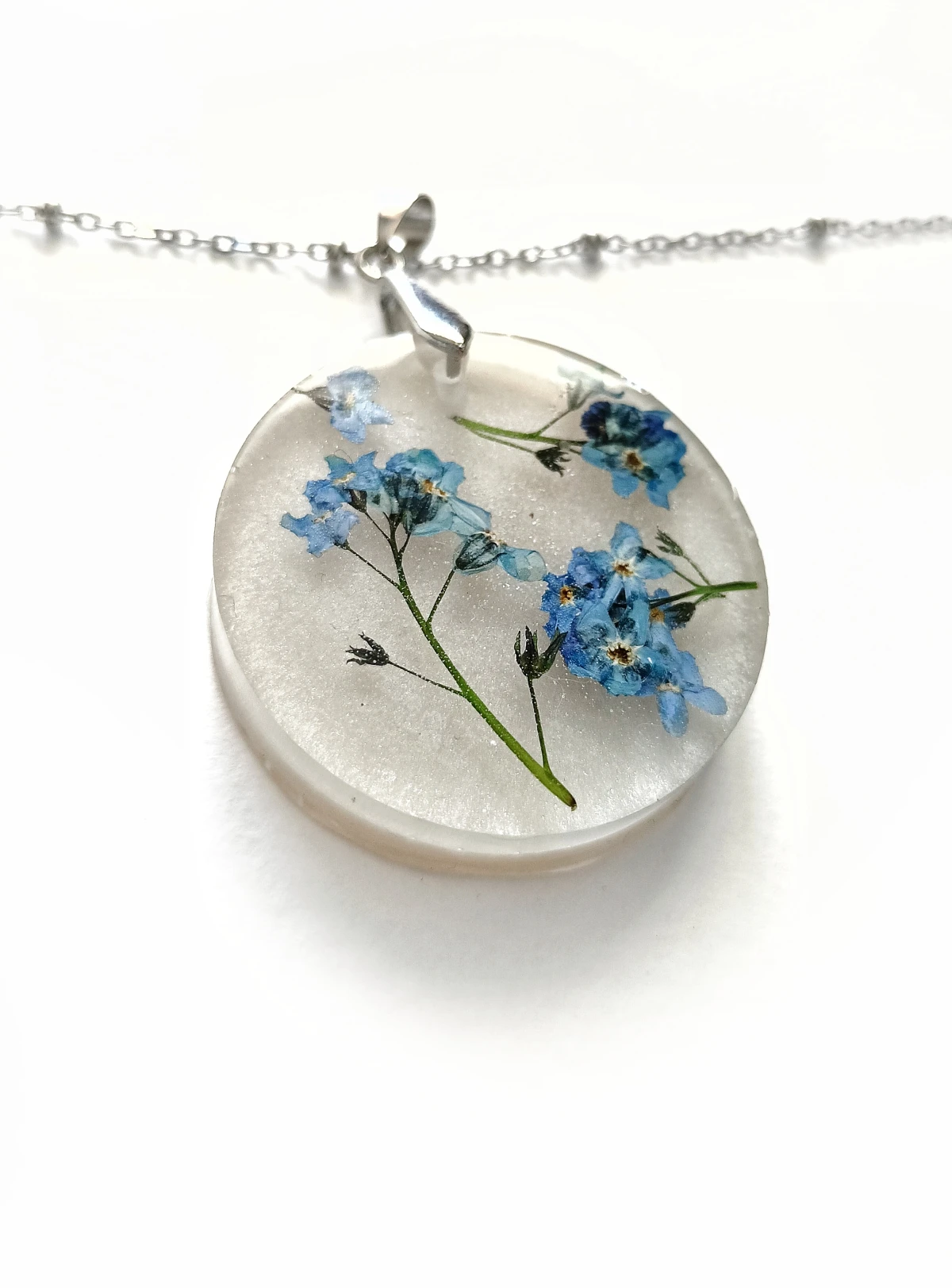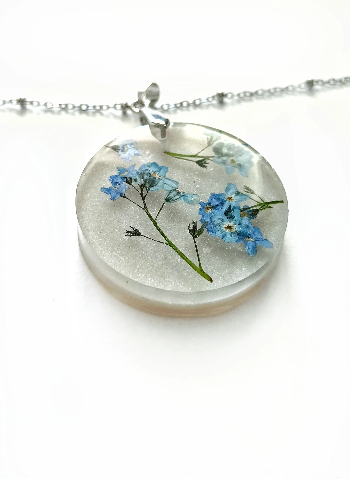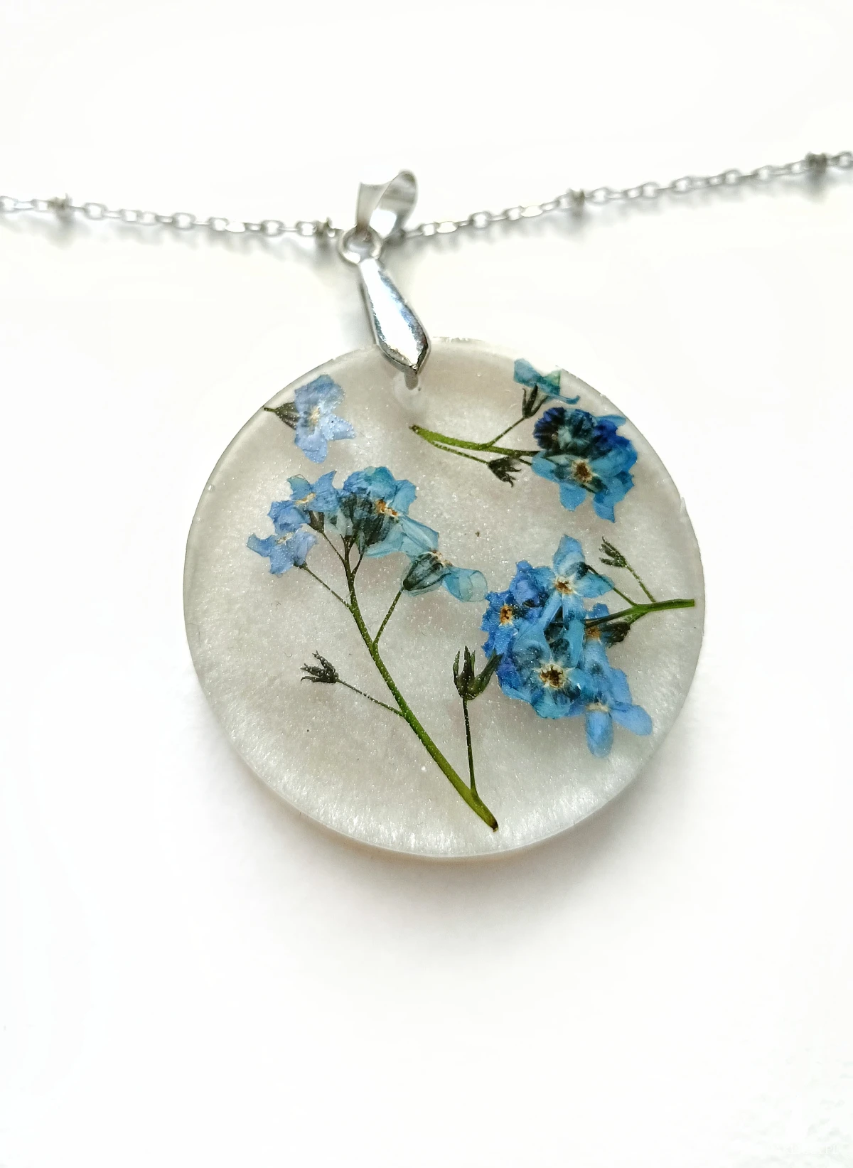 Ten ręcznie wykonany wisiorek z żywicy epoksydowej z zatopionymi prawdziwymi niezapominajkami to lekka, kobieca ozdoba, która idealnie dopełni zarówno codzienne, jak i eleganckie stylizacje.