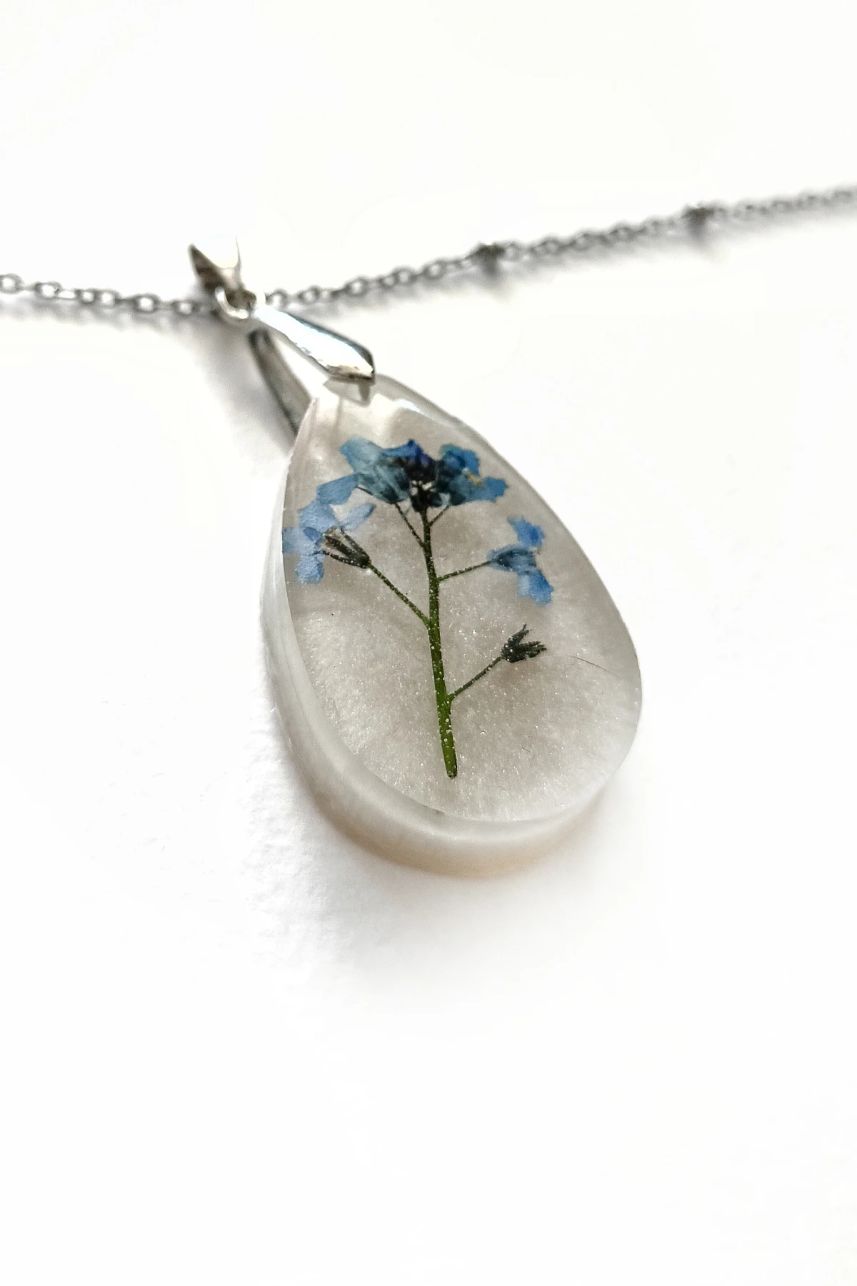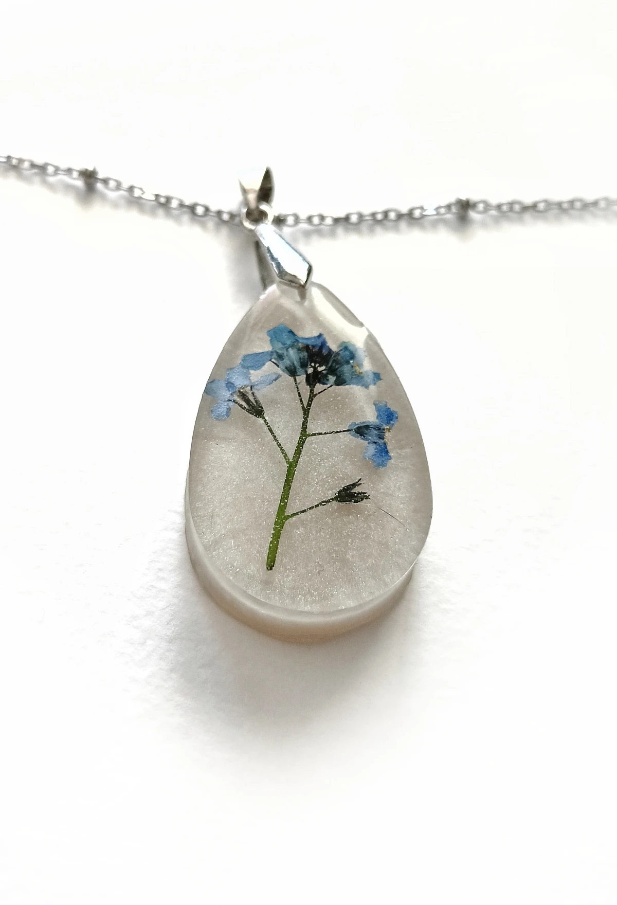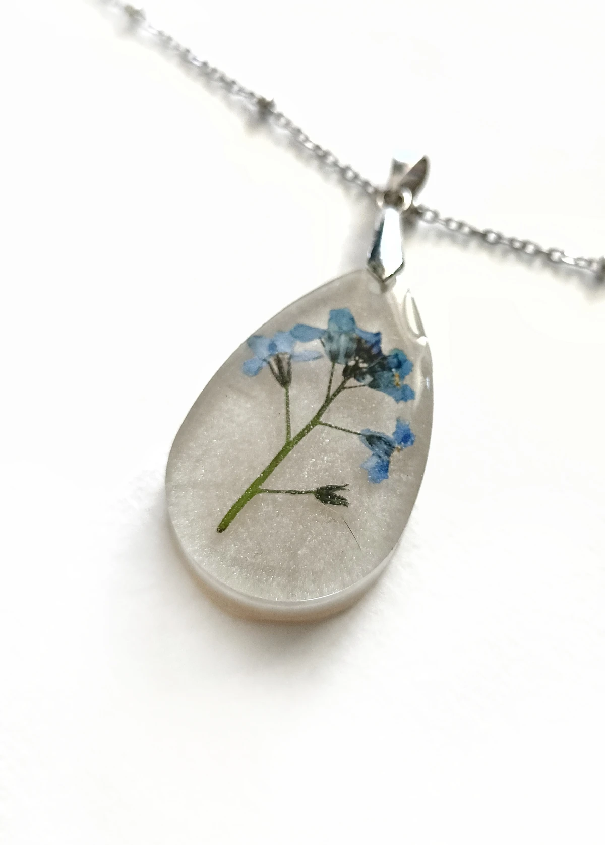 Ten ręcznie wykonany wisiorek z suszonymi niezapominajkami w perłowobiałej kropli żywicy to doskonały wybór dla miłośniczek stylu romantycznego, boho i subtelnych dodatków.