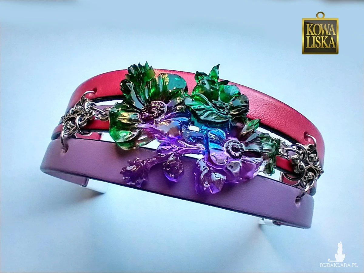 Kwiaty odlane z żywicy zostały zamontowane na szerokich rzemieniach, zebranych wygodnym zapięciem magnetycznym.