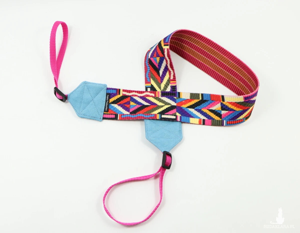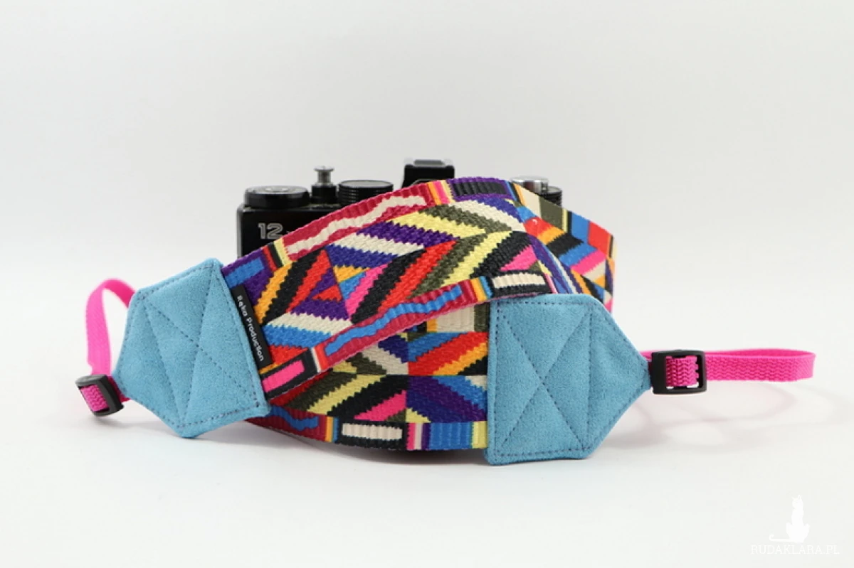 Kolorowy pasek do aparatu uszyty z dwustronnie plecionej taśmy. Końcówki z niebieskiego eko zamszu alkantara. Taśmy mocujące w kolorze różowym. W zestawie znajdują się też dwie czarne przelotki umożliwiające montaż paska. Pasek pasuje do każdego aparatu posiadającego mocowanie o szerokości min. 1cm.