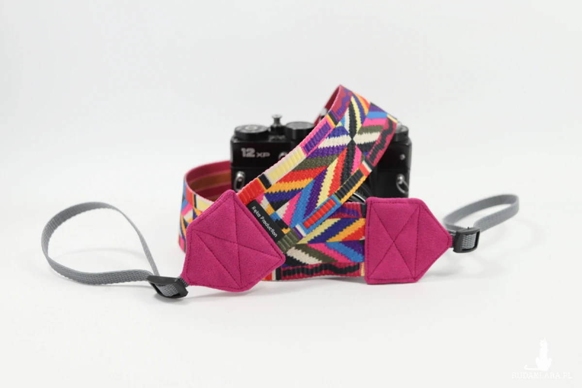 Kolorowy pasek do aparatu uszyty z dwustronnie plecionej taśmy. Końcówki z amarantowego eko zamszu alkantara. Taśmy mocujące w kolorze szarym. W zestawie znajdują się też dwie czarne przelotki umożliwiające montaż paska. Pasek pasuje do każdego aparatu posiadającego mocowanie o szerokości min. 1cm.