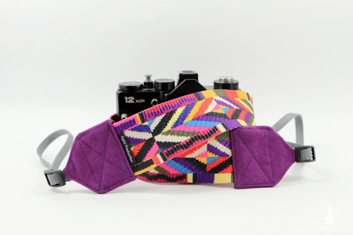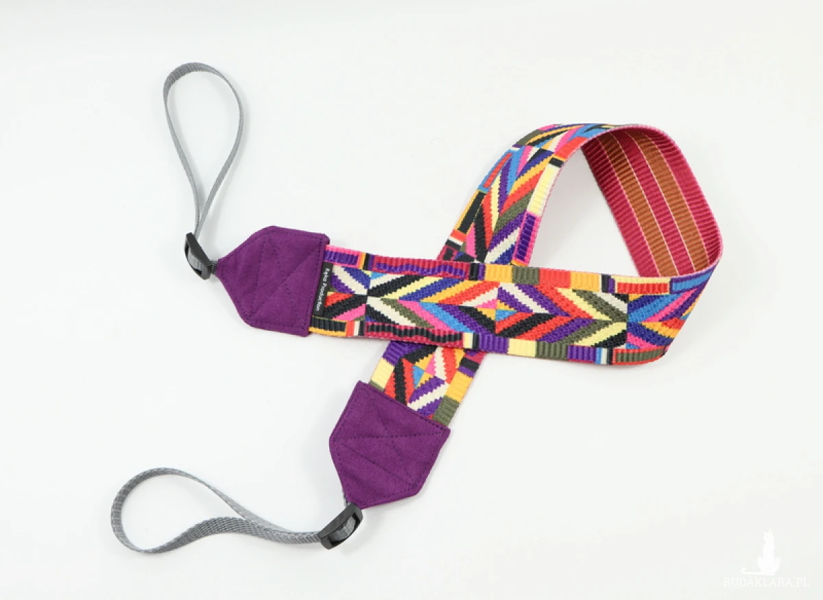 Kolorowy pasek do aparatu uszyty z dwustronnie plecionej taśmy. Końcówki z fioletowego eko zamszu alkantara. Taśmy mocujące w kolorze szarym. W zestawie znajdują się też dwie czarne przelotki umożliwiające montaż paska. Pasek pasuje do każdego aparatu posiadającego mocowanie o szerokości min. 1cm.