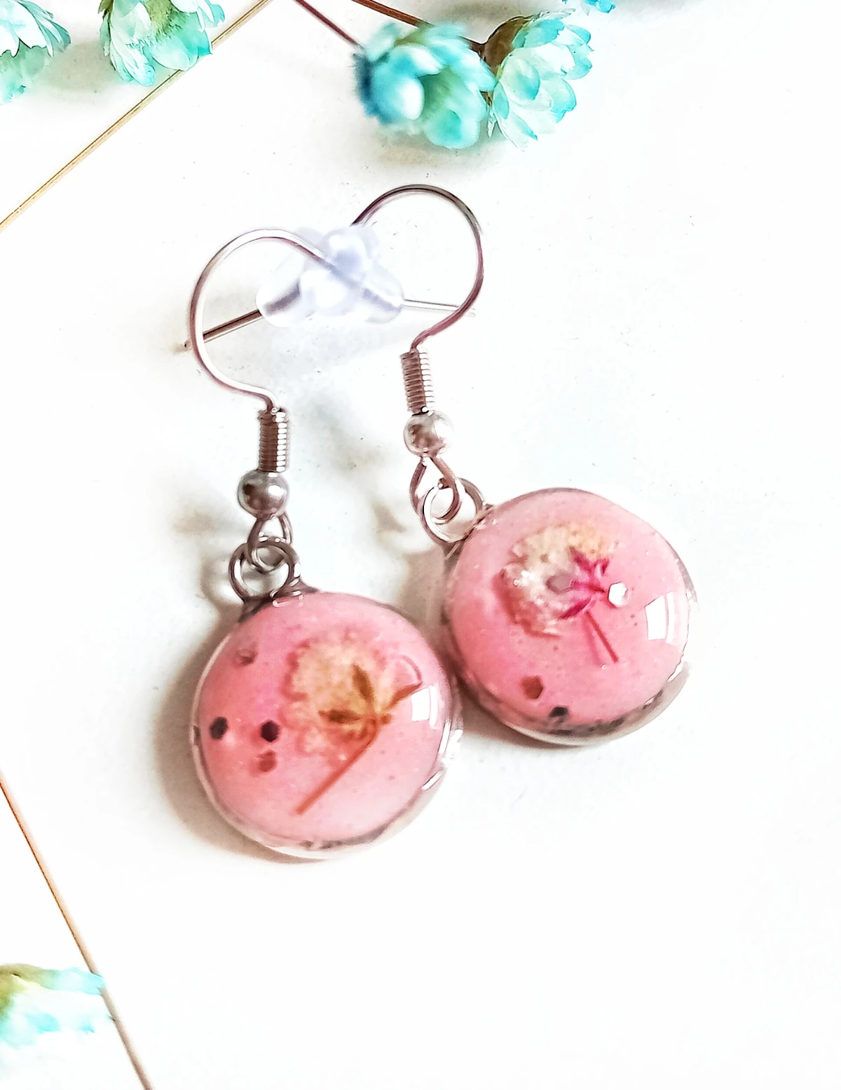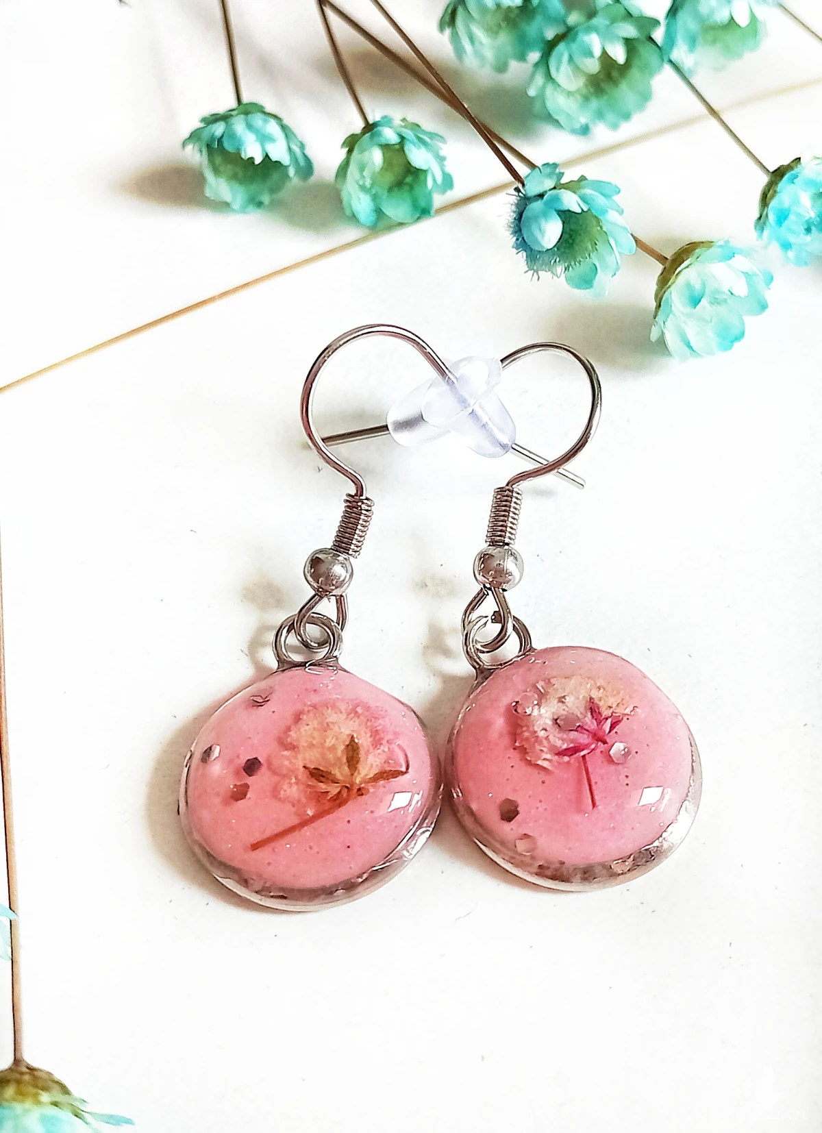 Przedstawiam ręcznie robione kolczyki z żywicy UV z zatopioną suszoną różową gipsówką – każdy egzemplarz to unikat stworzony z sercem i precyzją.