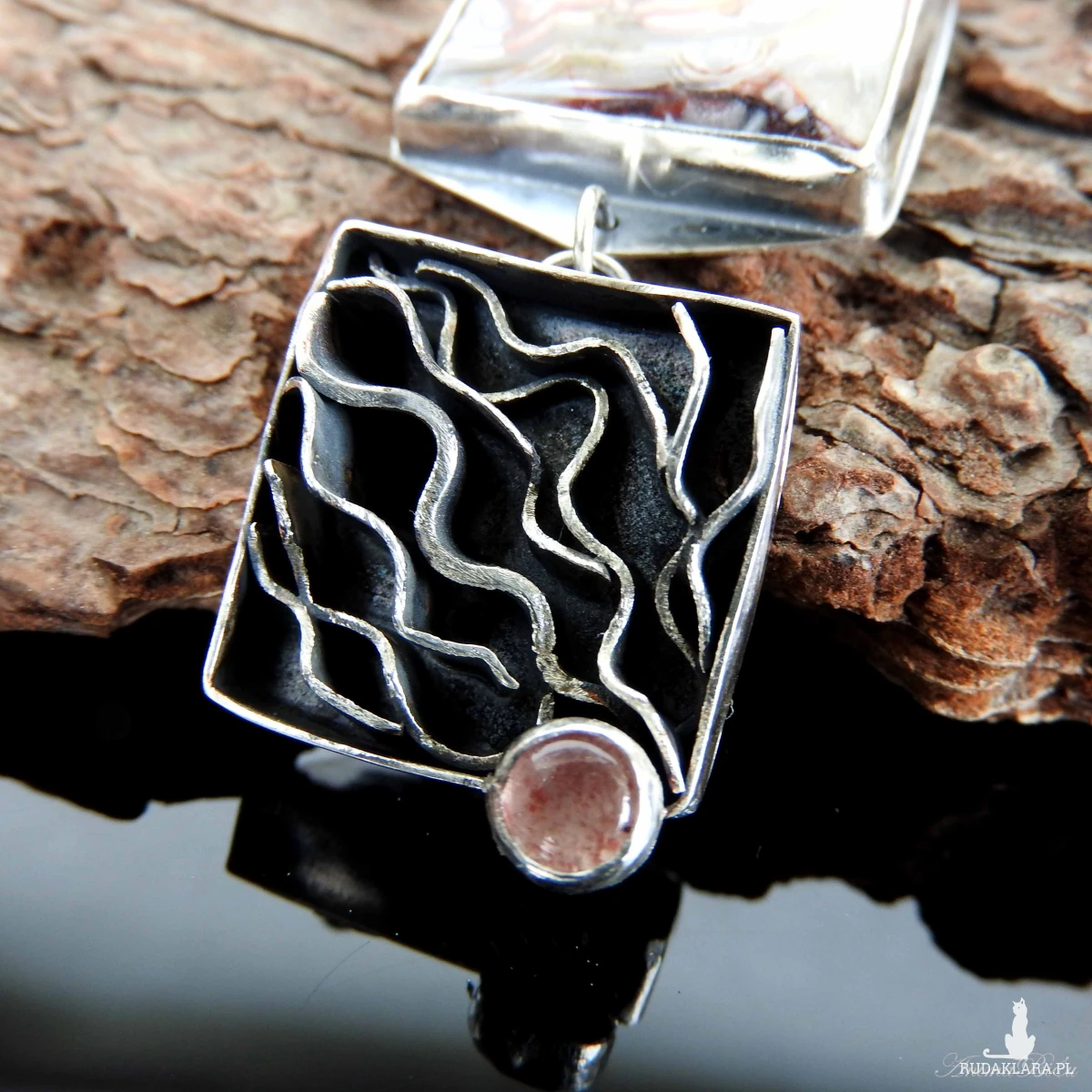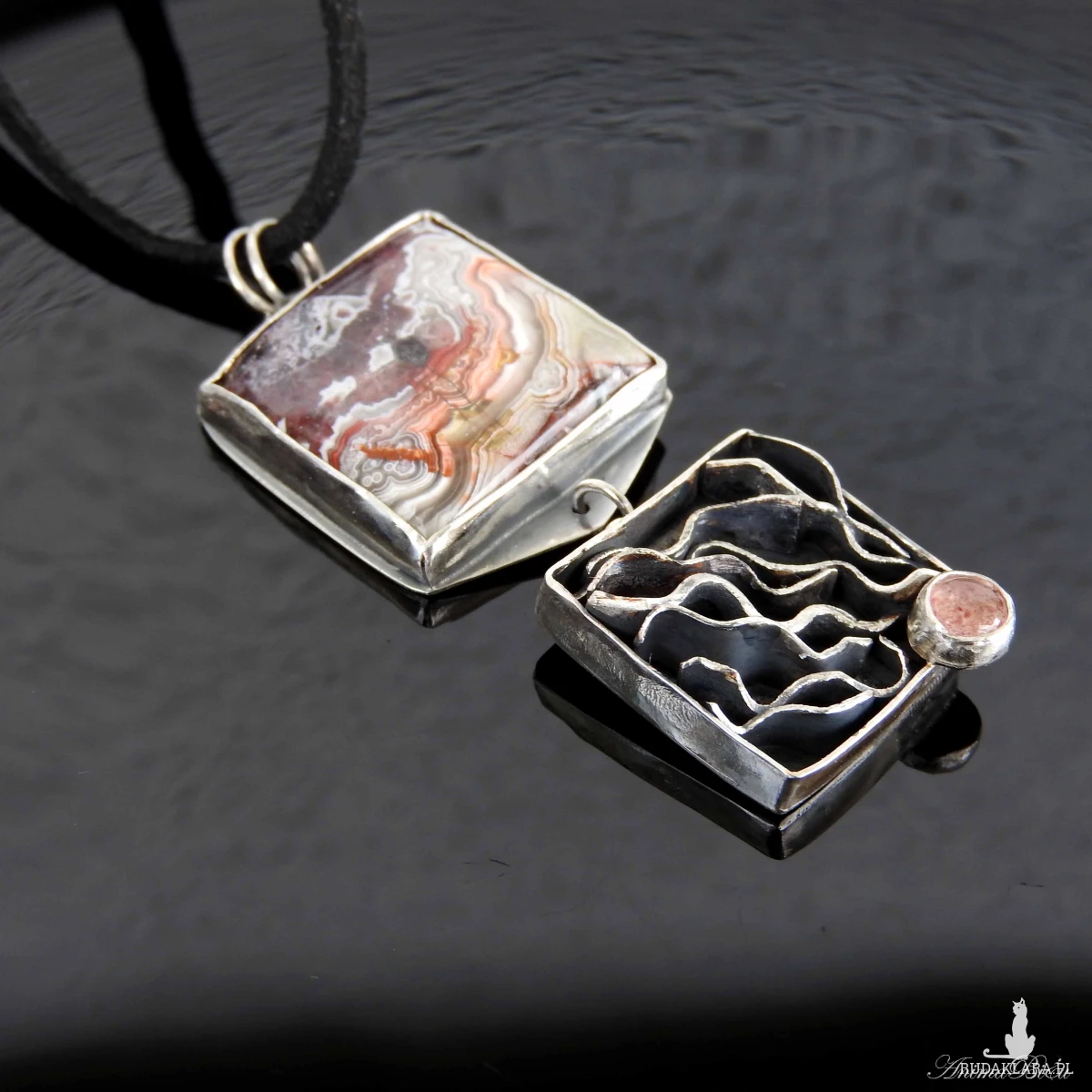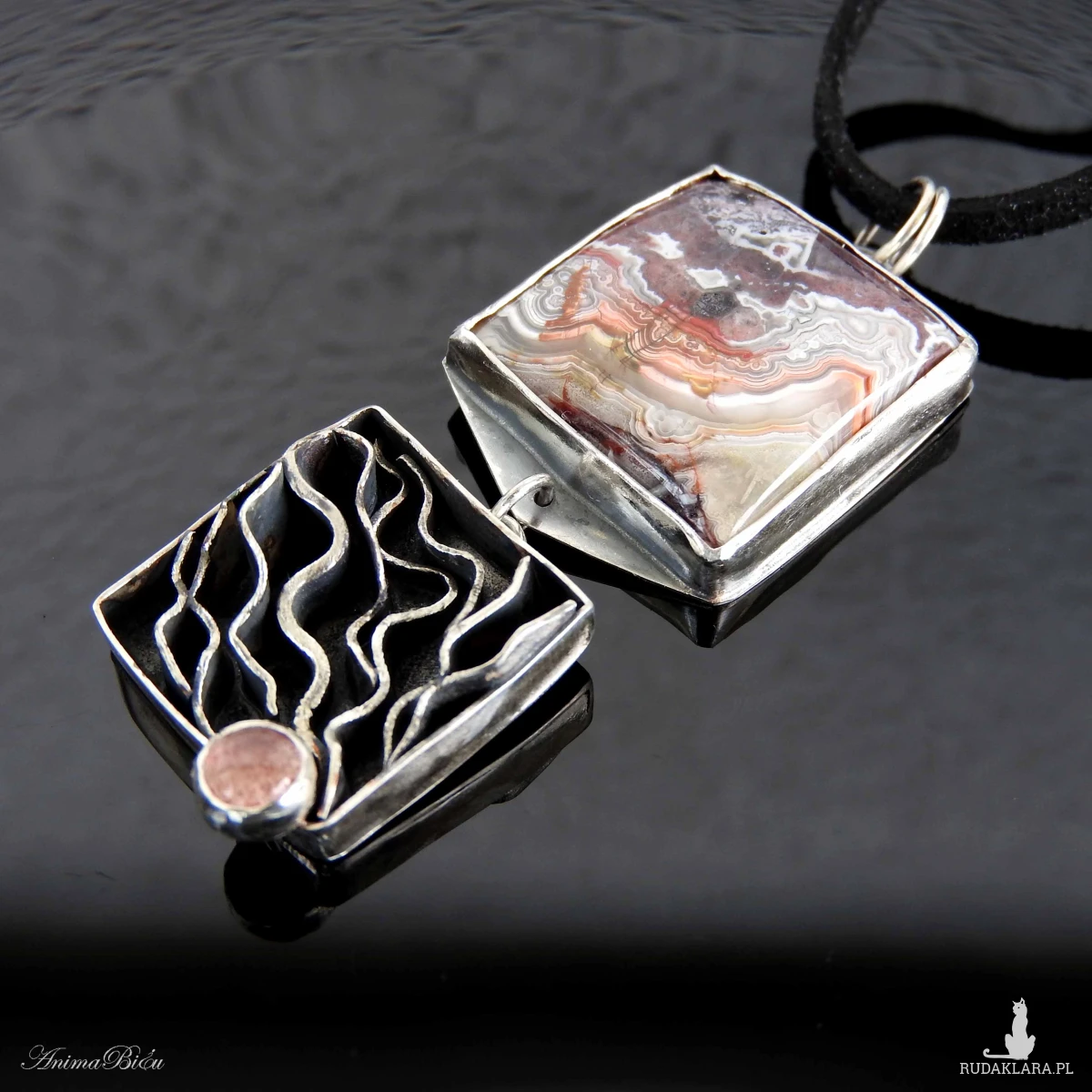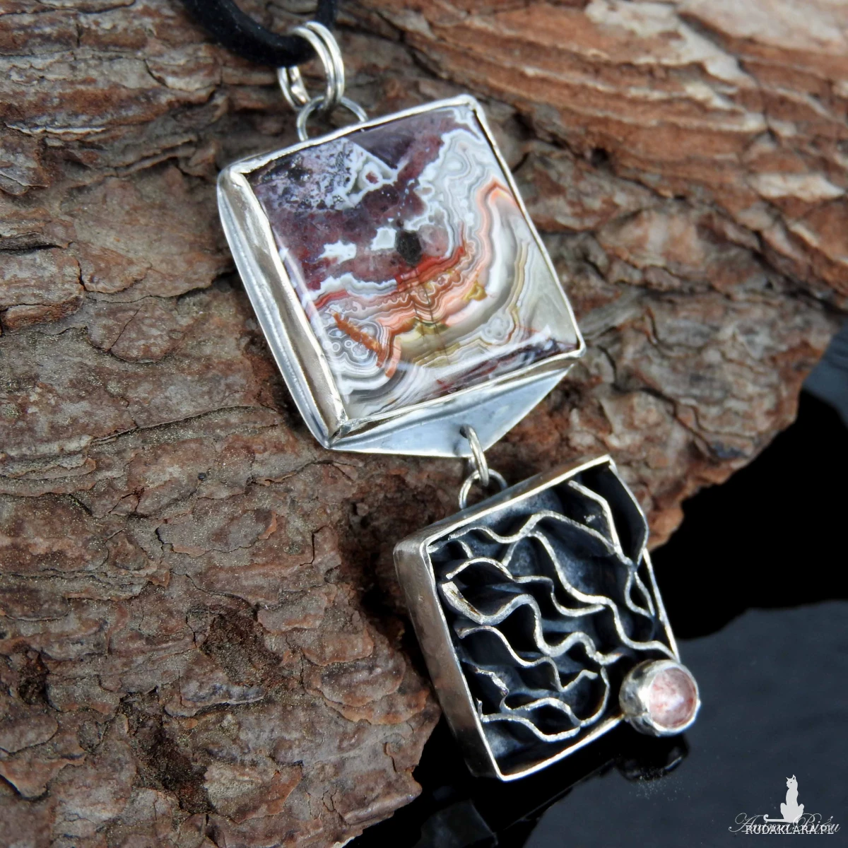 Wisiorek srebrny z agatem crazy lace i kwarcem truskawkowym.