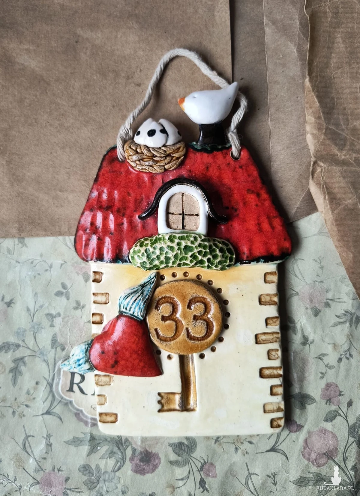 Ceramiczna kamienica do powieszenia na ścianie, wykonana z gliny szamotowej wypalona na biskwit, a następnie szkliwiona w temperaturze ok 1260 stopni C. W starym stylu. Wymiary dużej: 8,5 x 18,5 cm, z numerem domu pośrodku. Serdecznie polecam do ozdoby domu lub jako upominek dla architekta lub osoby pracującej w nieruchomościach:) Bardzo proszę o podanie numeru domu w wiadomości dla artysty.