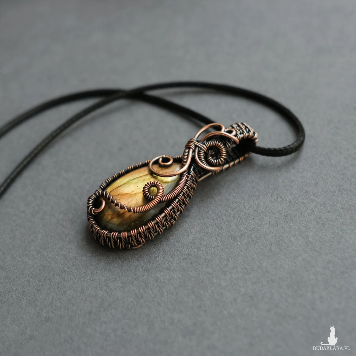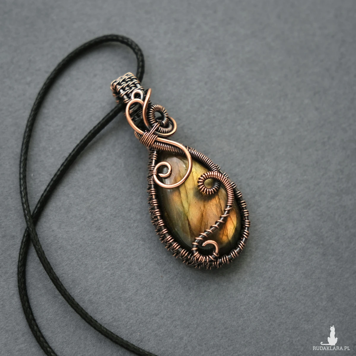 Miedziany wisiorek mieści w sobie kamień labradorytu o pięknej żółto-pomarańczowej iryzacji. Posiada ozdobne boczki i fantazyjne sploty miedzianego drutu. Wisiorek jest unikatem, doda Twojej stylizacji oryginalności :-)