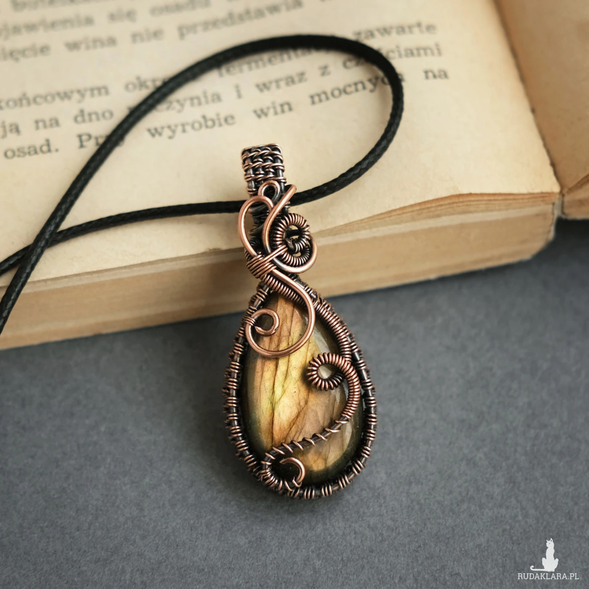 Oprawę wykonałam własnoręcznie pracochłonną techniką wire wrapping. Miedź poddałam oksydacji w celu uszlachetnienia barwy i nadania efektu patyny.