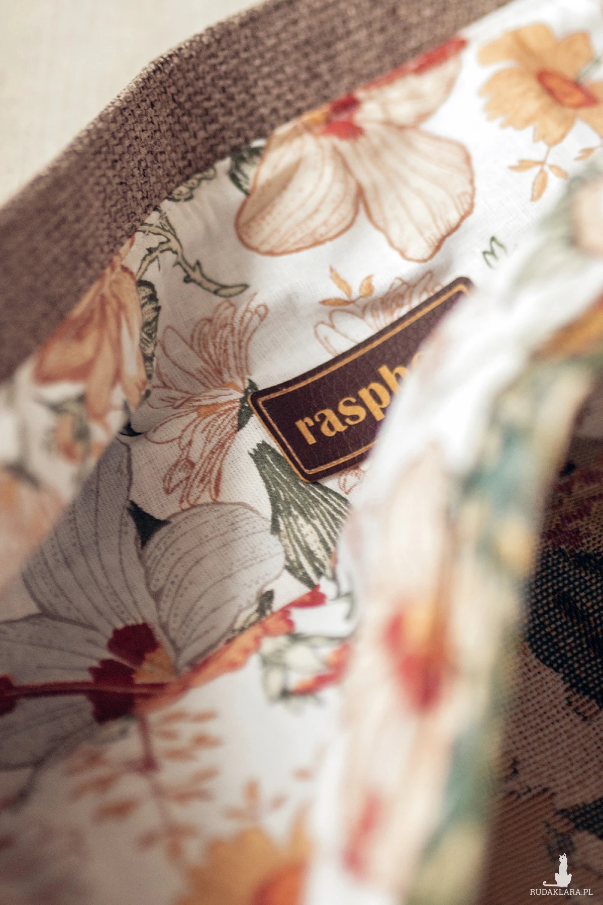 Torebka posiada bawełnianą podszewkę w kwiaty, a w środku kieszeń zapinaną na suwak. Z tyłu torby znajduje się dodatkowa kieszonka zapinana na suwak.