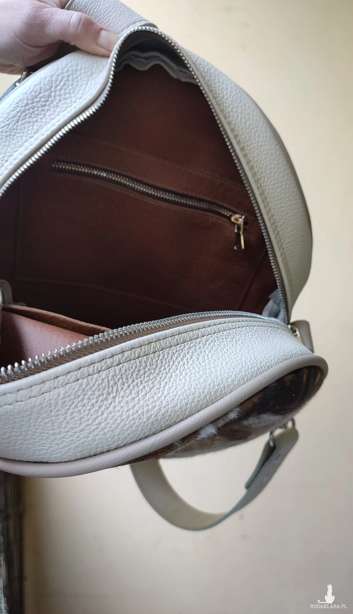 Przód torebki zdobi efektowna, włochata skóra koźlęca z naturalnym, unikalnym wzorem. Tył i boki uszyte zostały z miękkiej, tłoczonej skóry bydlęcej o wyrazistej fakturze. Wnętrze wykończone zostało luksusową, delikatną skórą i wyposażone w dwie praktyczne kieszonki – w tym jedną zapinaną na zamek.