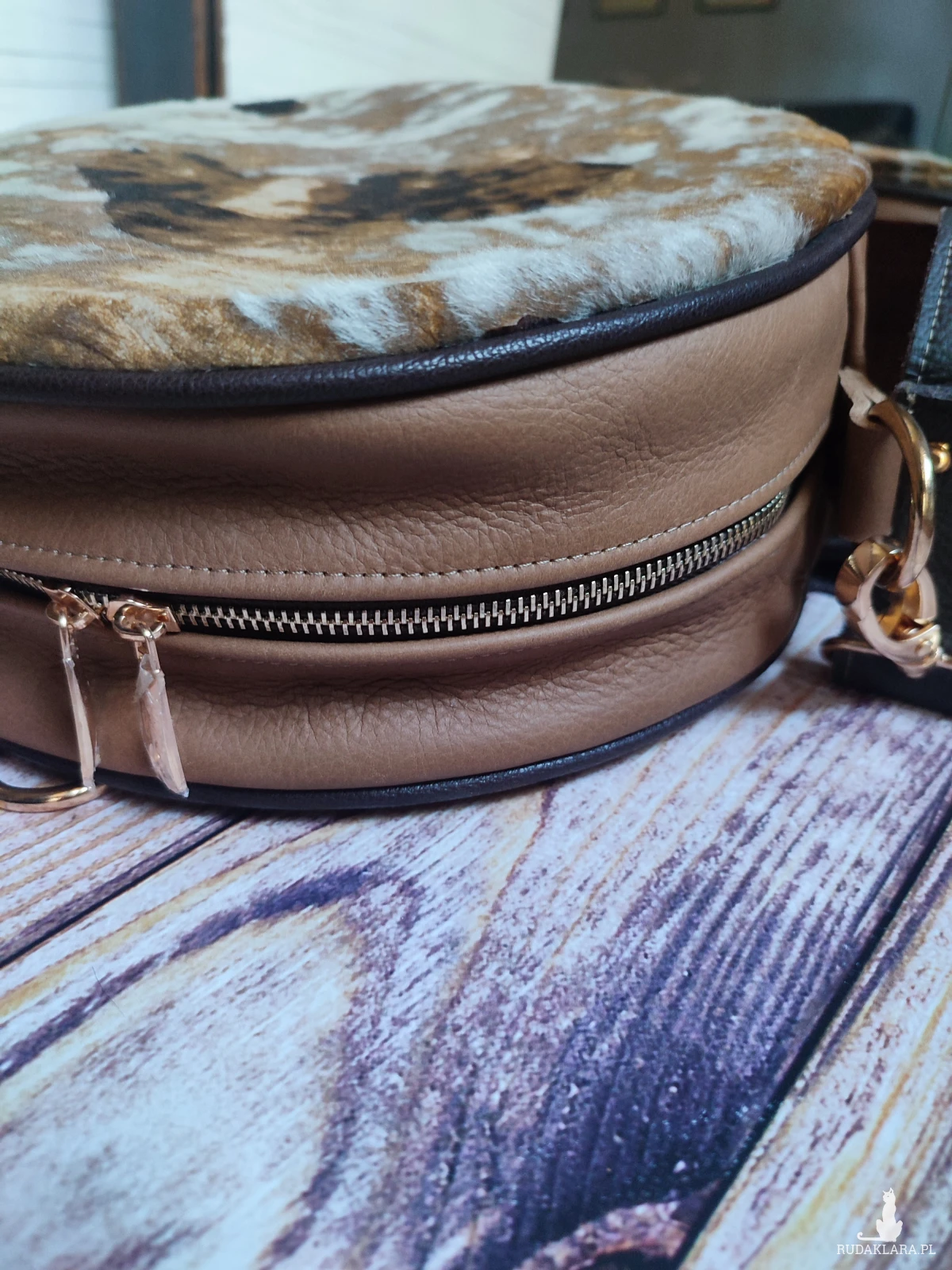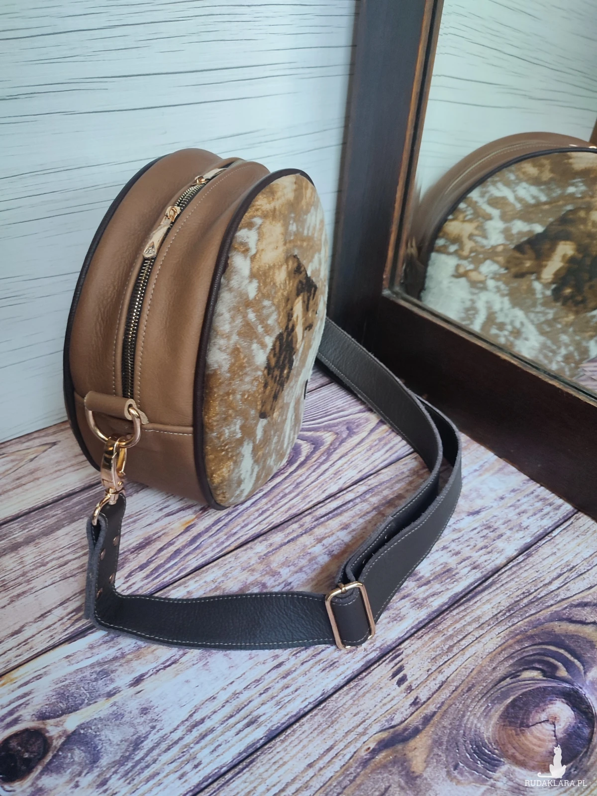 Przód torebki zdobi efektowna, włochata skóra koźlęca z naturalnym, unikalnym wzorem. Tył i boki uszyte zostały z miękkiej, tłoczonej skóry bydlęcej o wyrazistej fakturze. Wnętrze wykończone zostało luksusową, delikatną skórą i wyposażone w dwie praktyczne kieszonki – w tym jedną zapinaną na zamek.