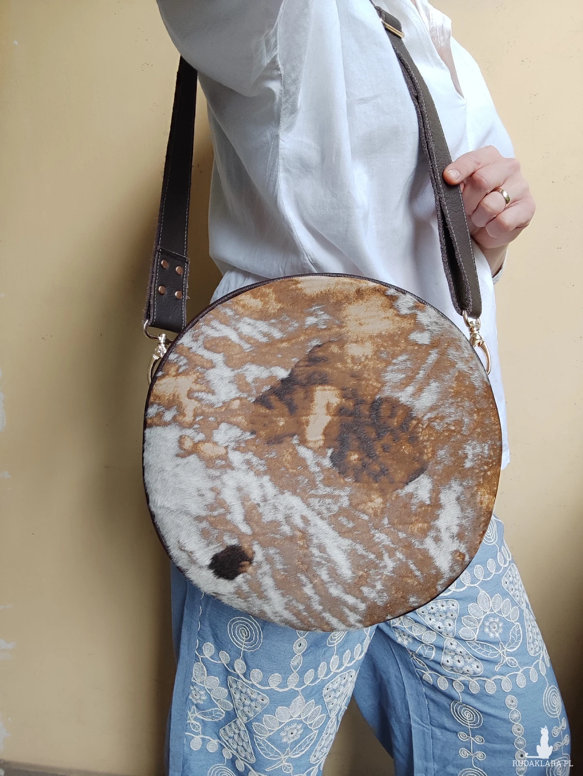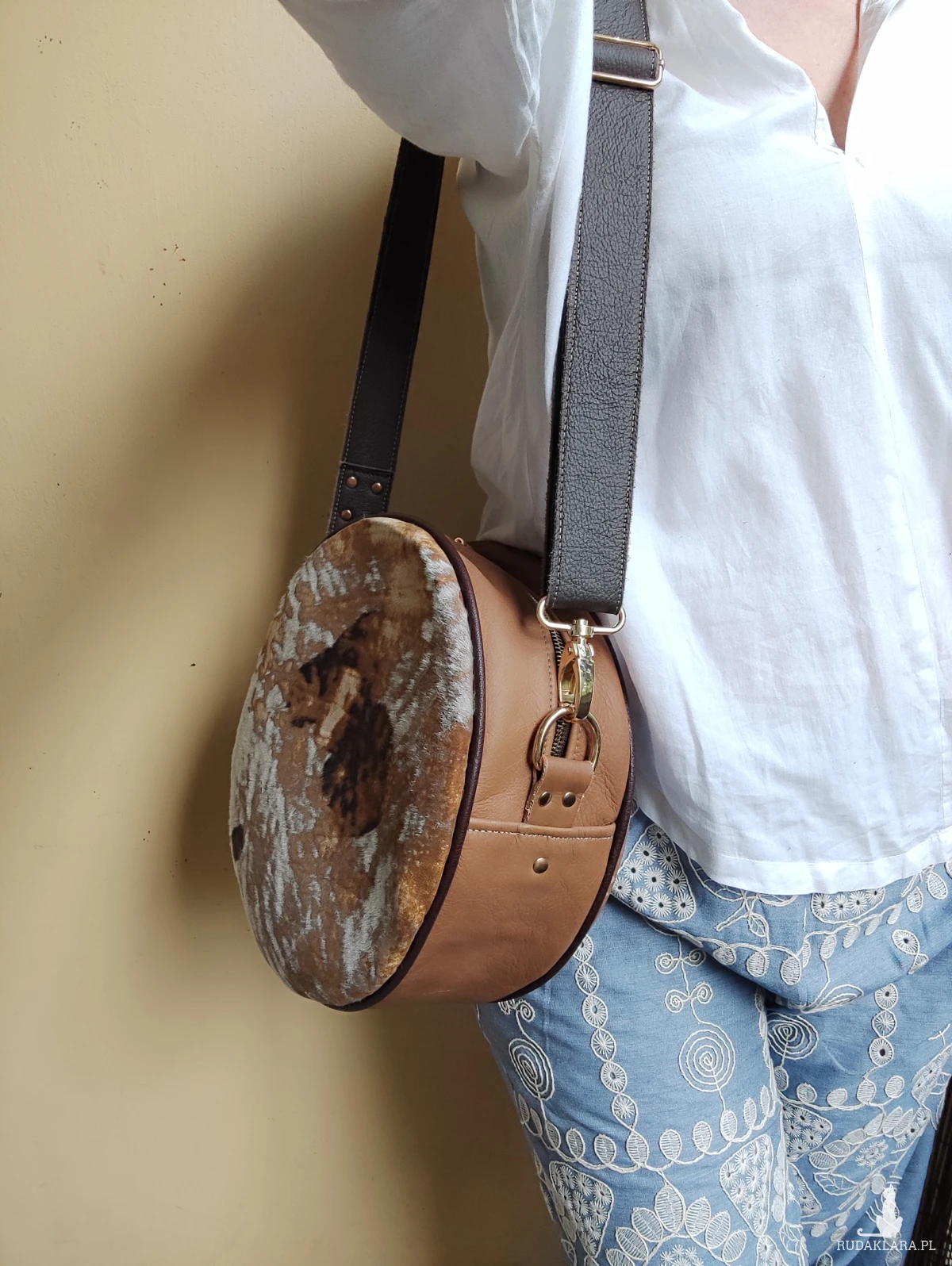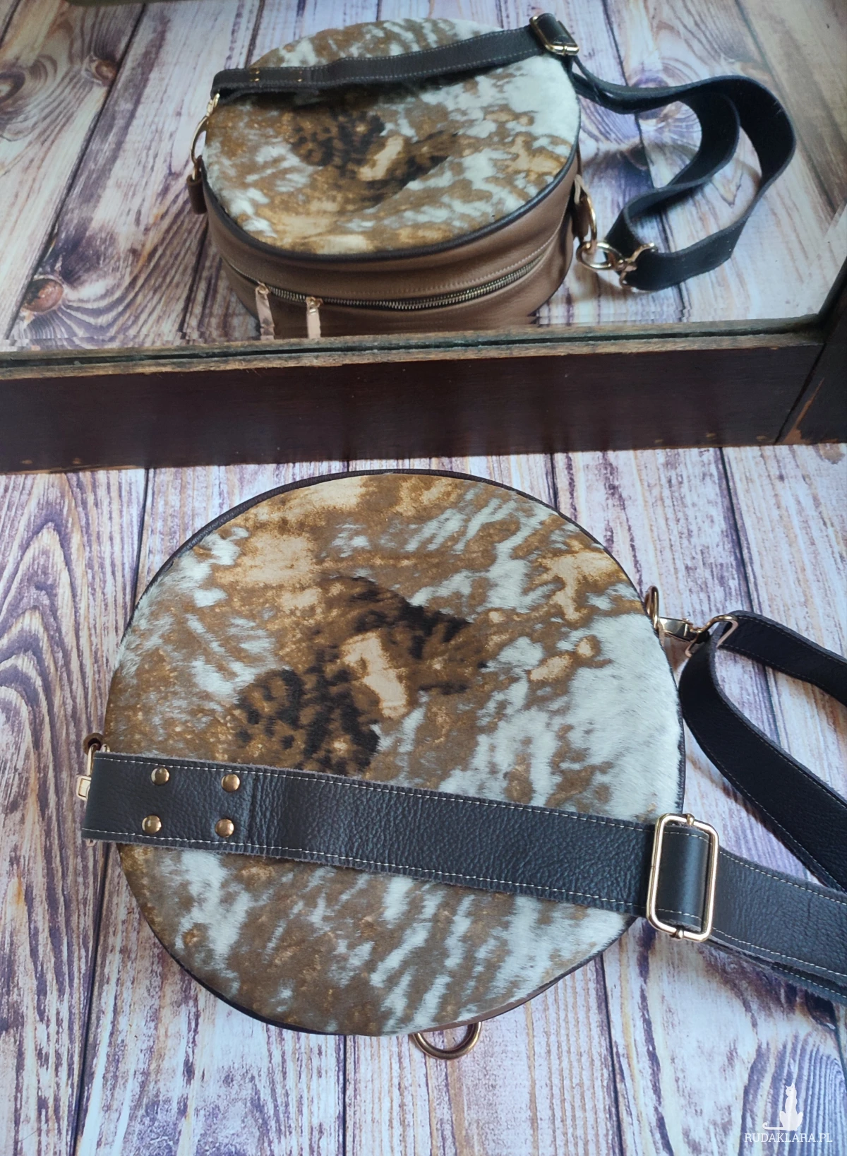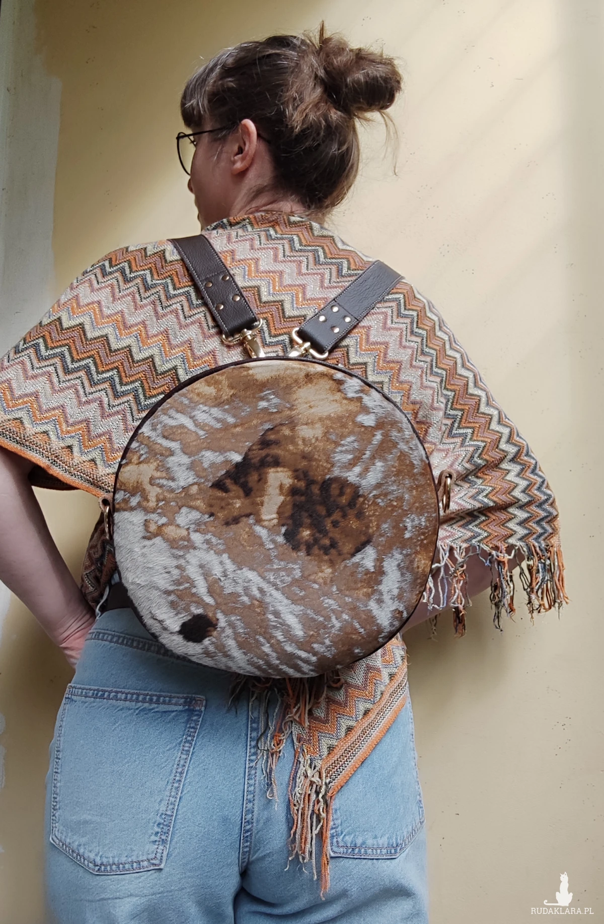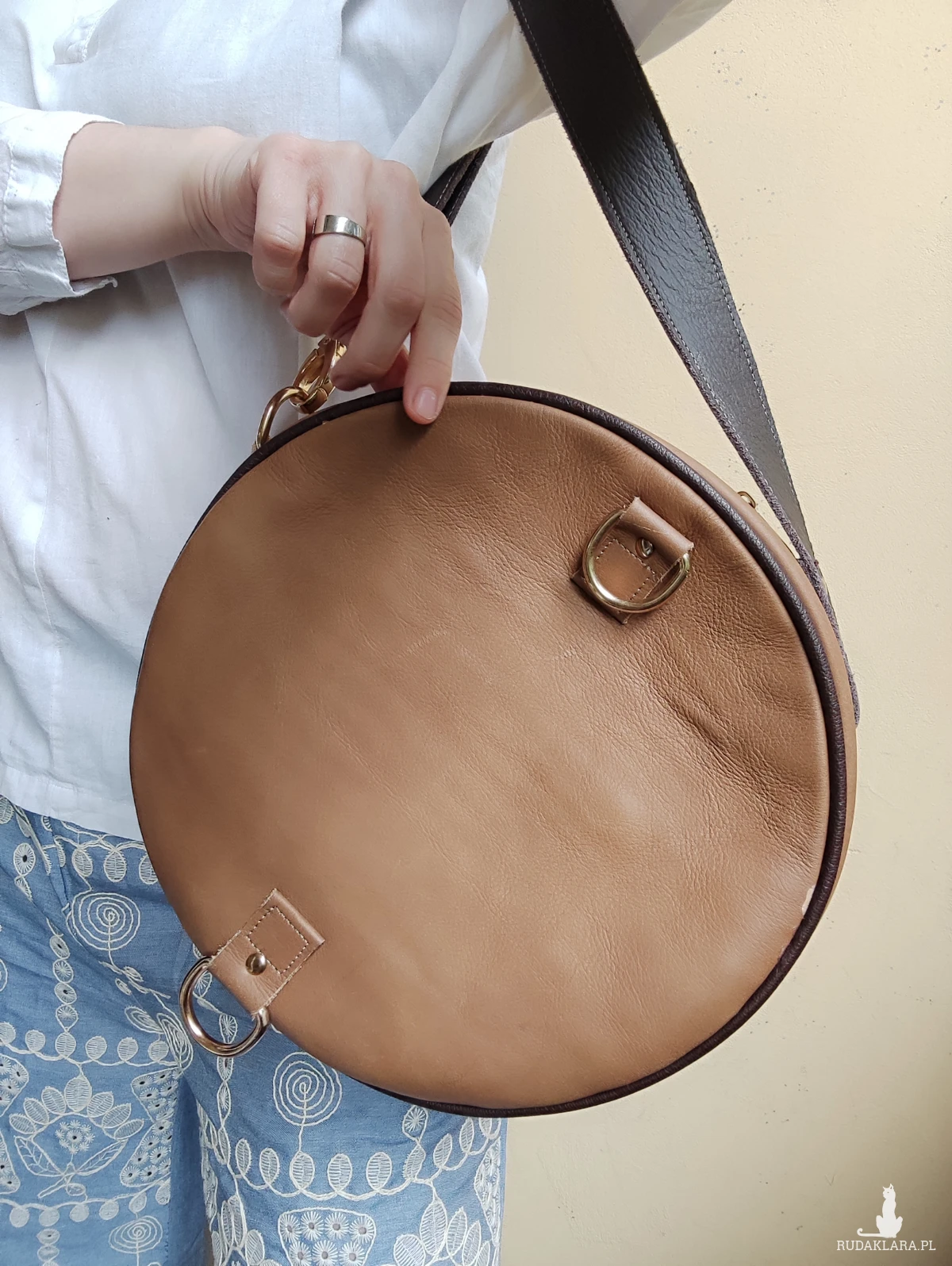 Oryginalna torebka o okrągłym kształcie, wykonana ręcznie w autorskiej pracowni z najwyższej jakości naturalnych skór. Po przepięciu pasków można ją nosić jak plecak. To projekt jedyny w swoim rodzaju – powstał w pojedynczym egzemplarzu, z myślą o osobach, które poszukują niepowtarzalnych dodatków z duszą.