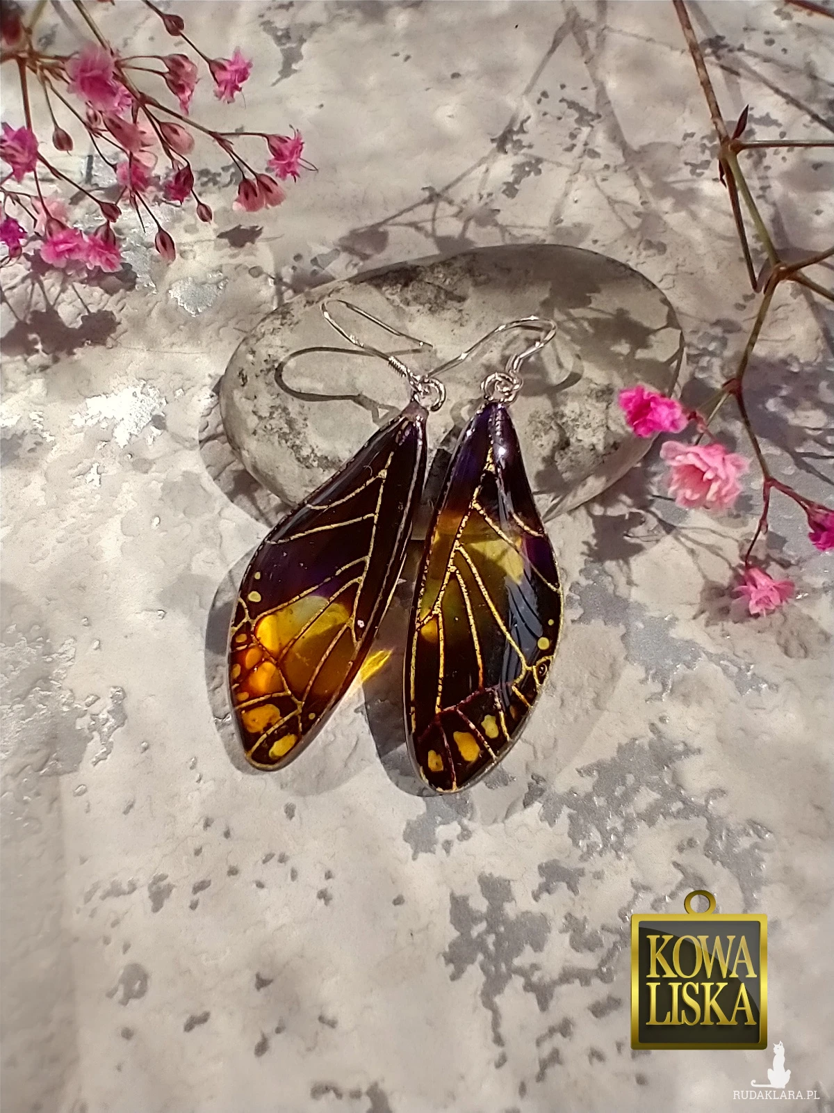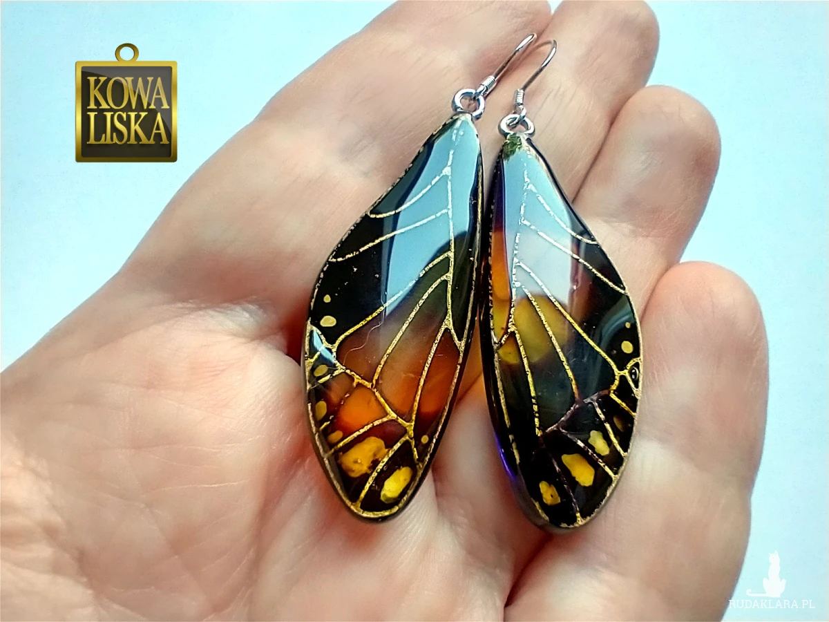 Lśniące fioletowo-bursztynowym blaskiem skrzydła motyla przepięknie podkreślą Twoją urodę, zarówno w ciepłe, słoneczne dni, jak i podczas wieczornego wyjścia. Złote żyłowania mienią się w słońcu... Skuś się...