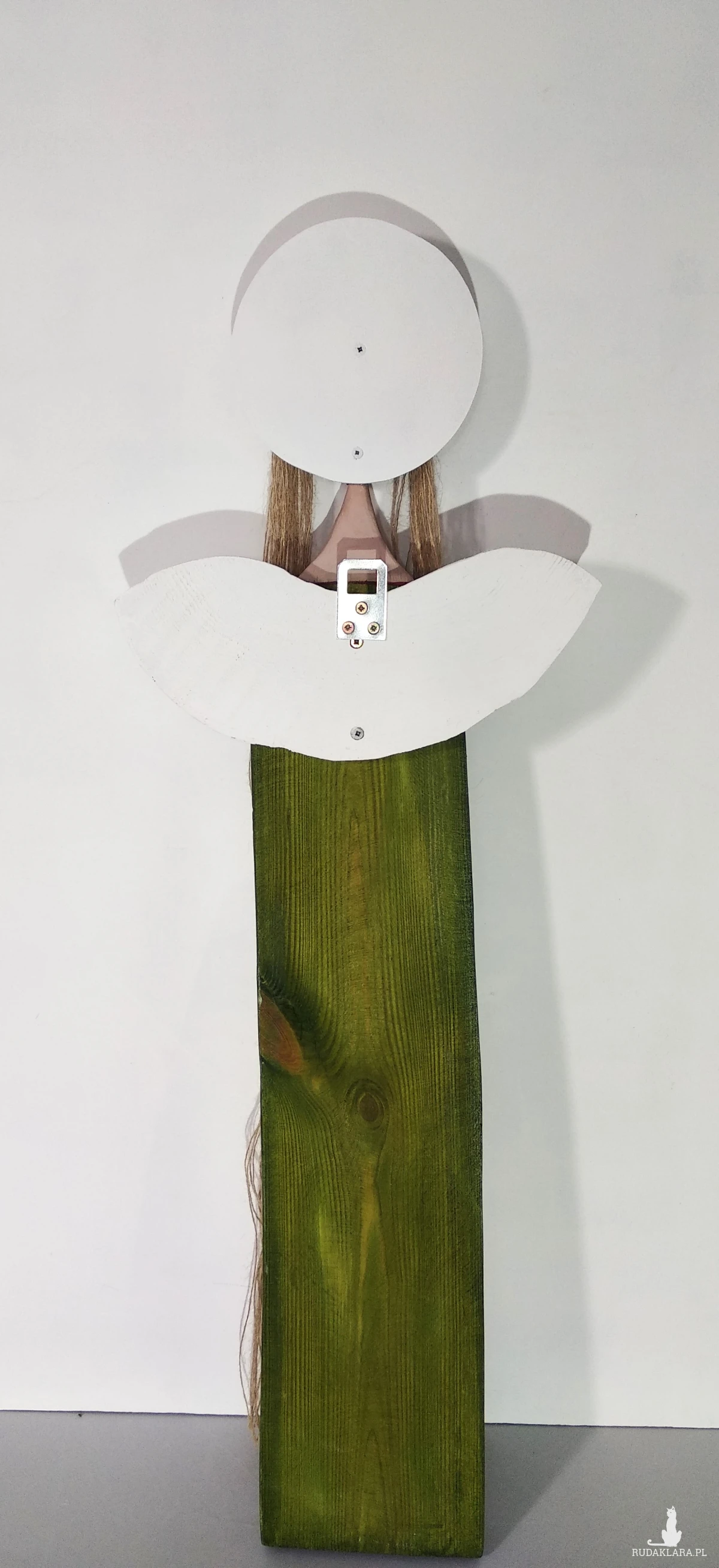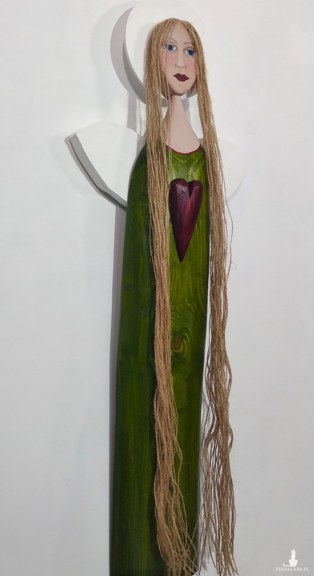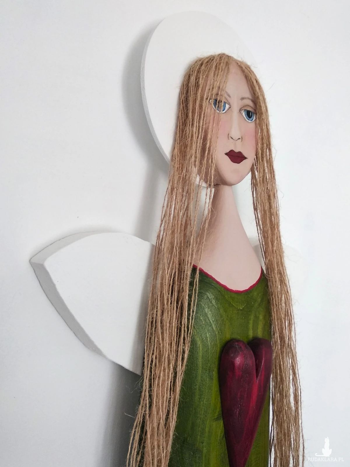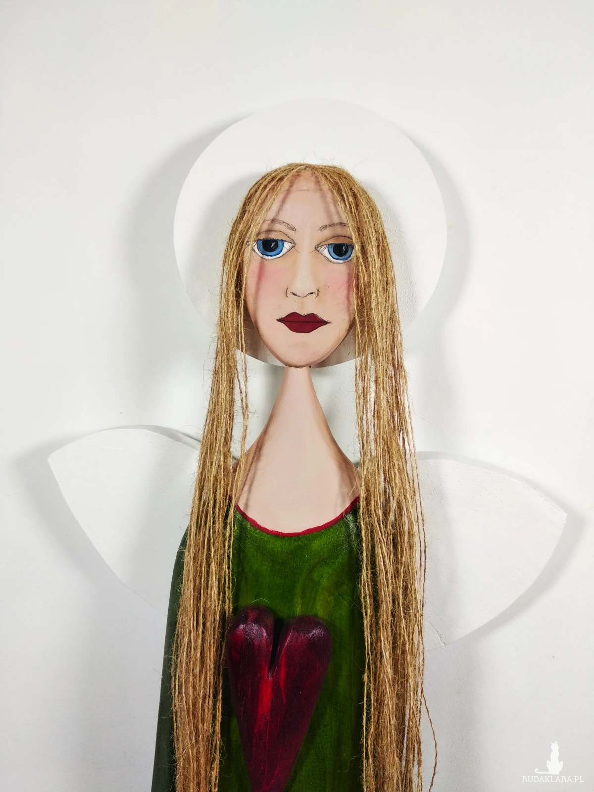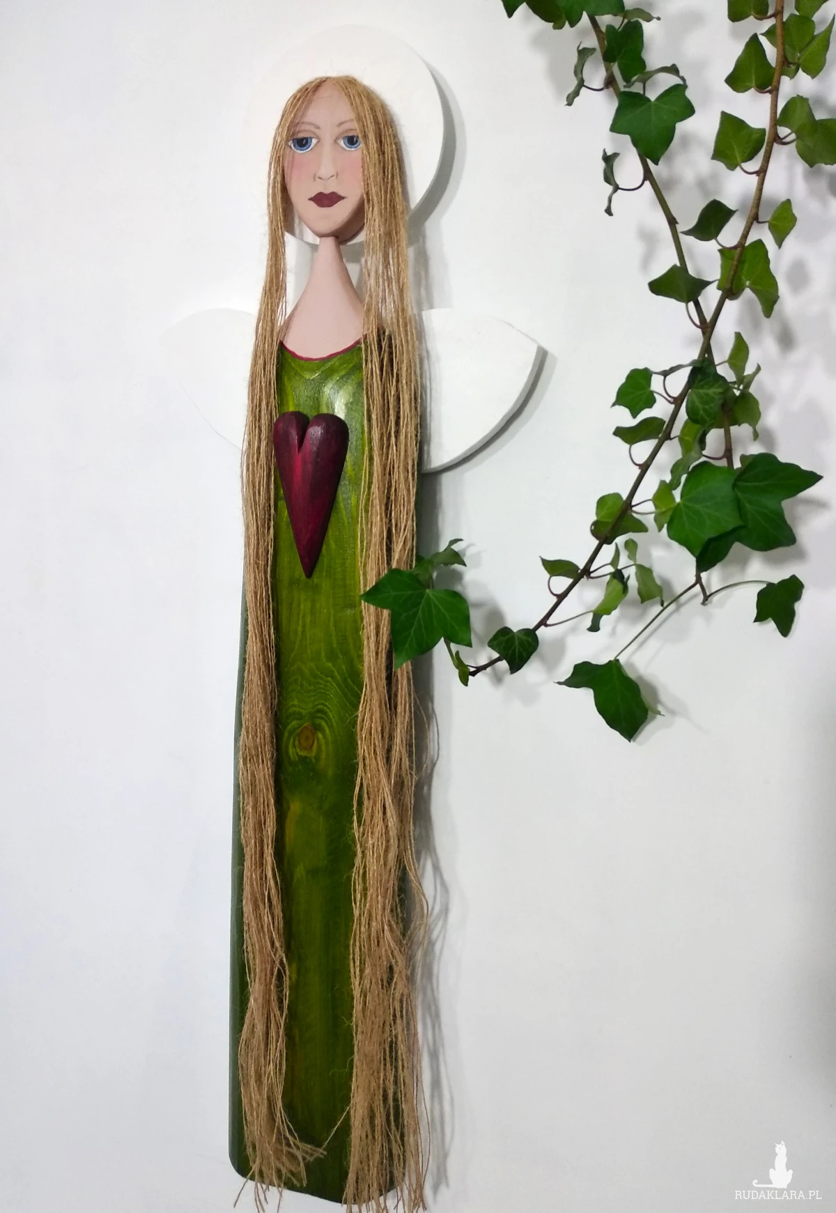 Na jego sukni bije czerwone serce – symbol troski i ciepła. Długie włosy wykonane z naturalnego sznurka. Biel skrzydeł i aureoli kontrastuje z intensywną zielenią, podkreślając harmonię natury i ducha.