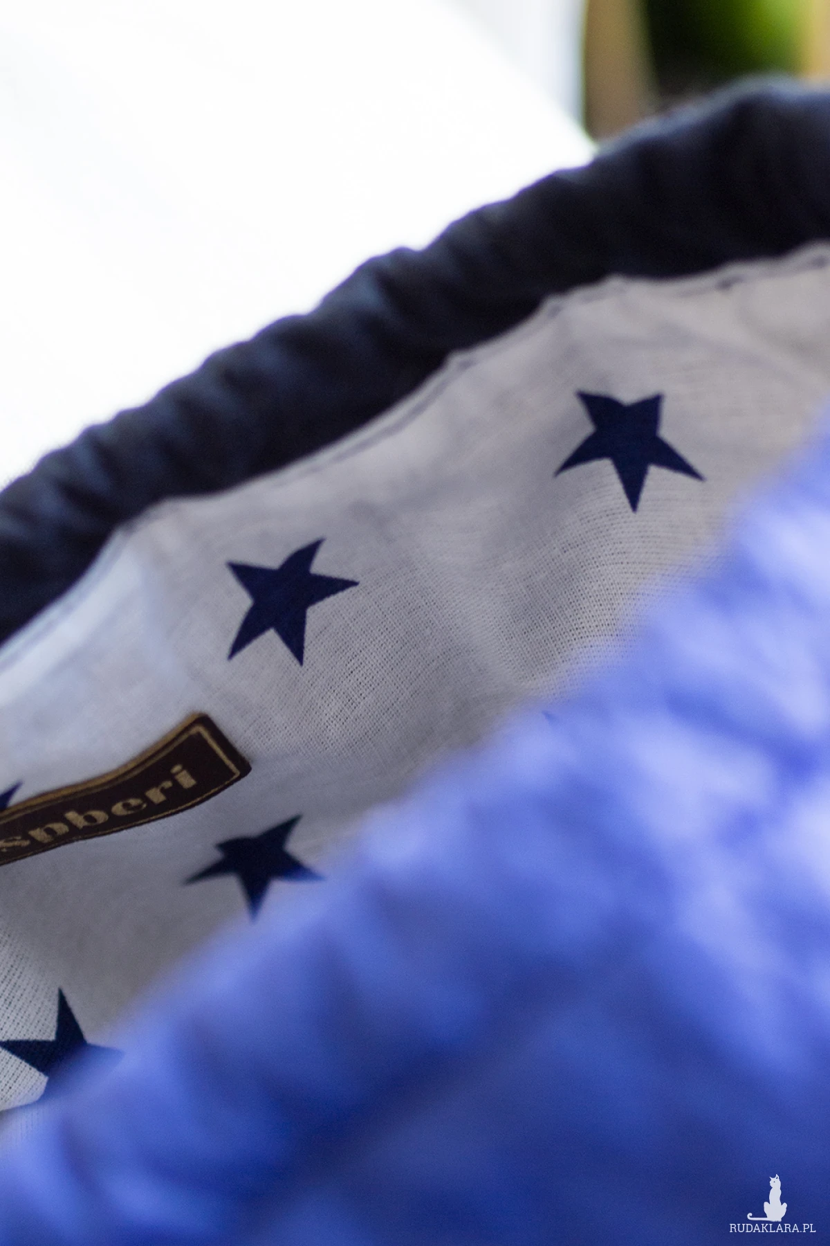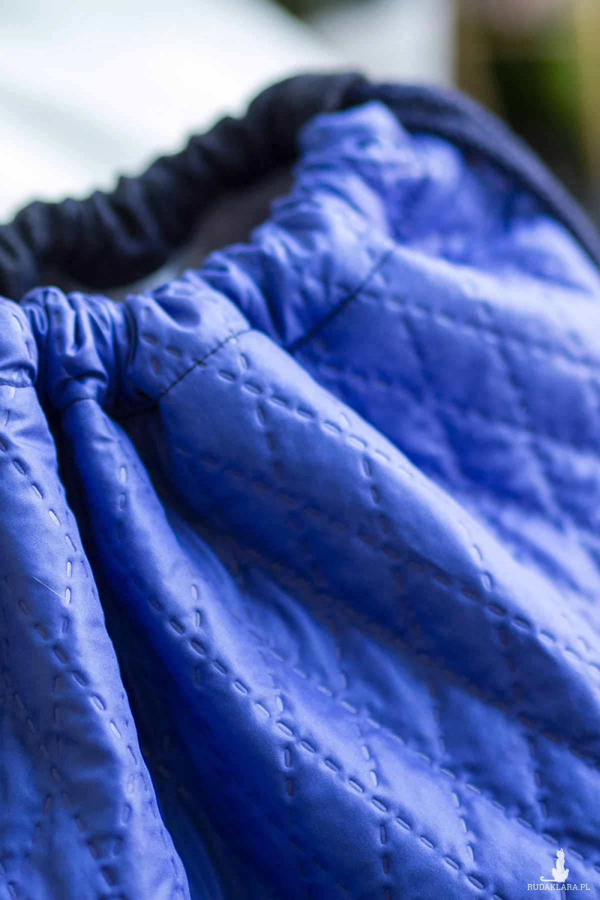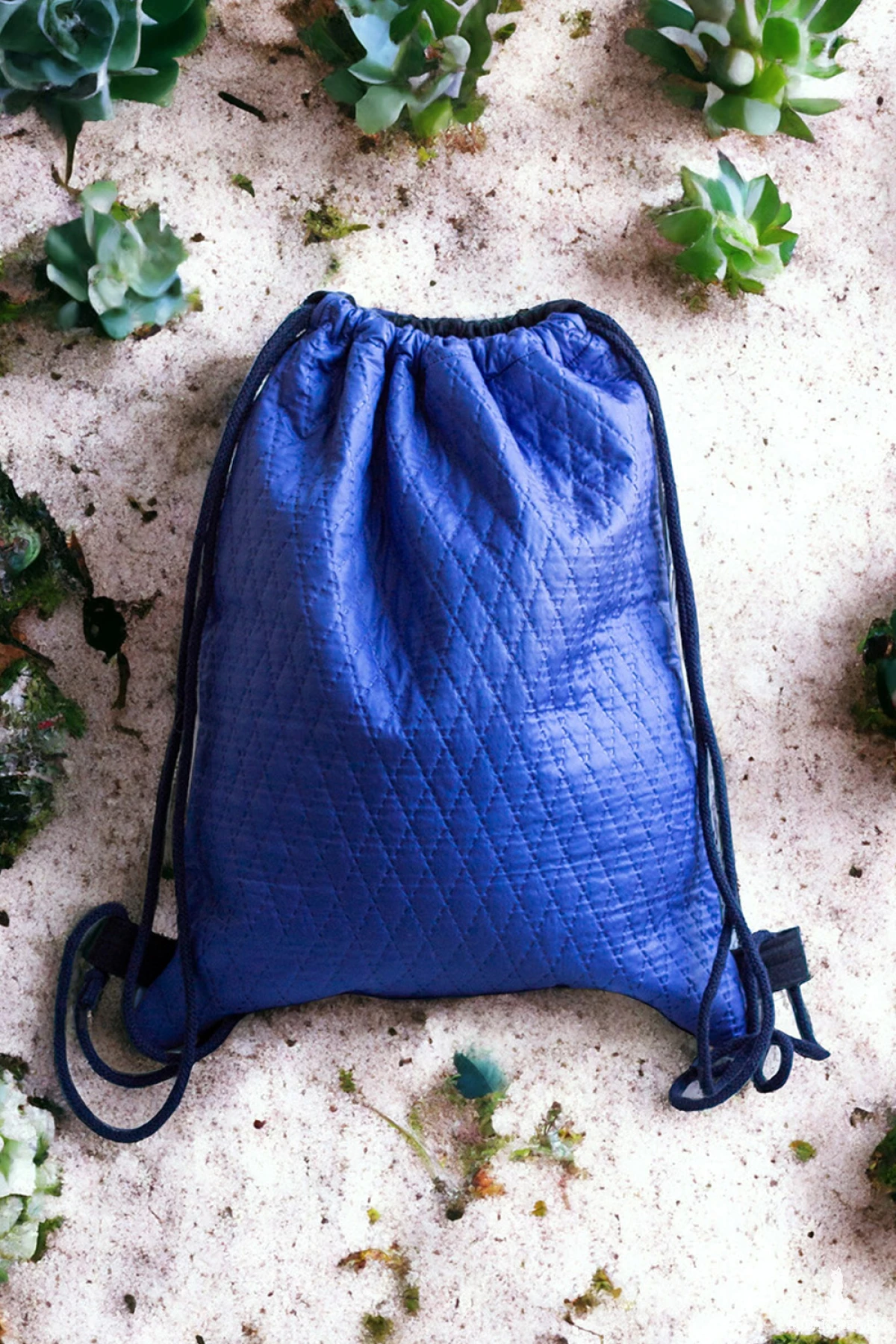Plecak worek wykonany z filcu w kolorze granatowym w połączeniu z pikowaną tkaniną w kolorze niebieskim.