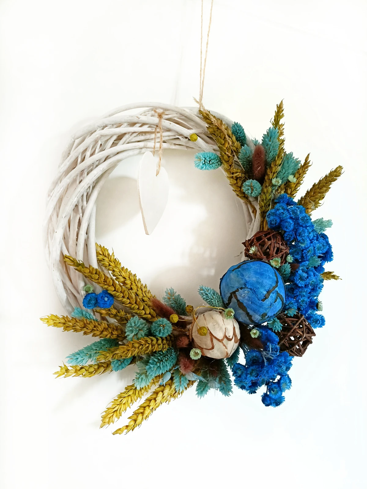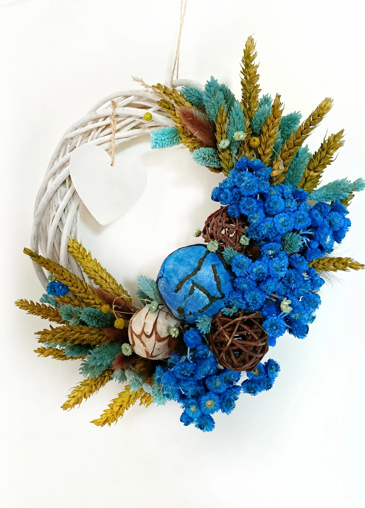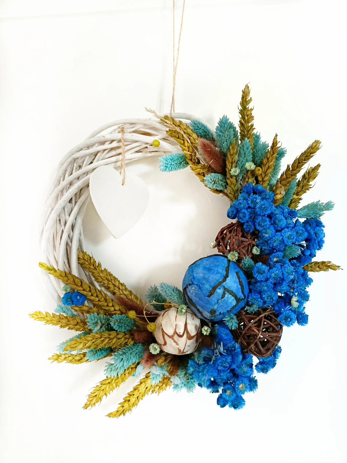 wianek z suszonych kwiatów, wianek handmade, wianek boho, rustykalna dekoracja, dekoracja z suszonych roślin, letni wianek na drzwi, prezent handmade, wianek z naturalnych traw, ozdoba ścienna naturalna, gliniane serce z dedykacją