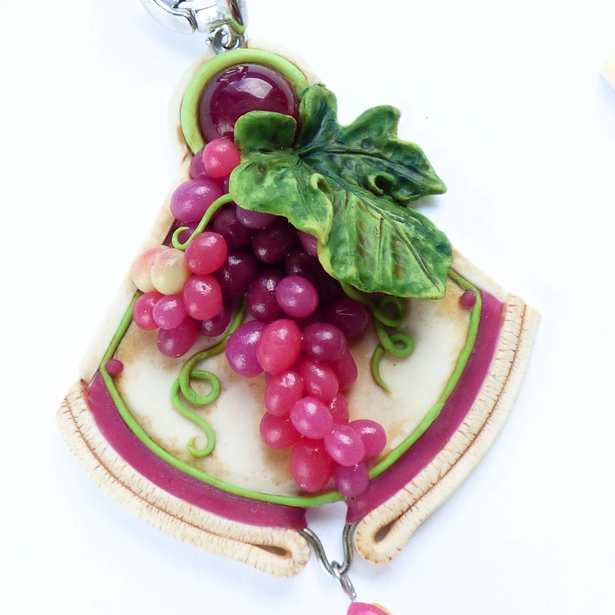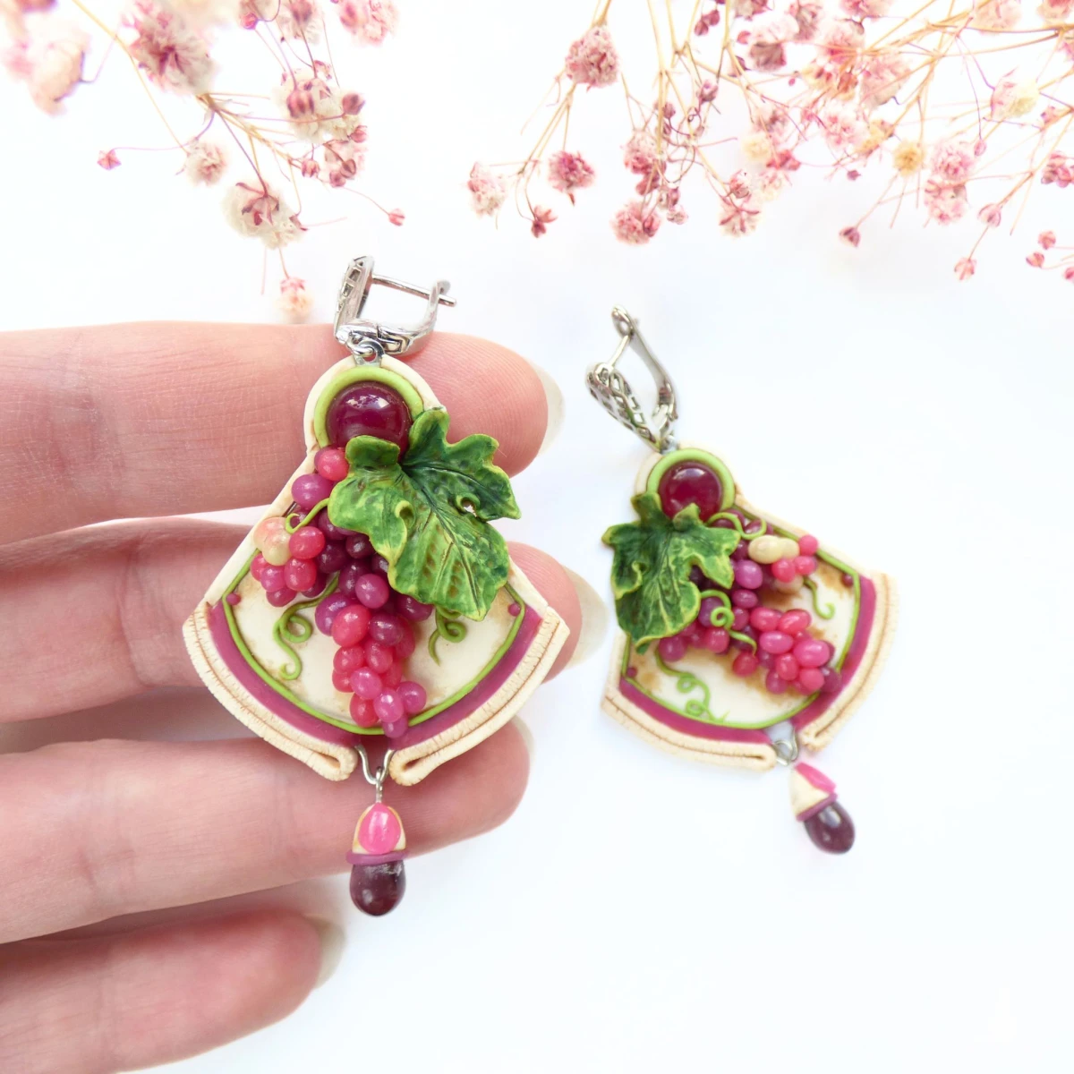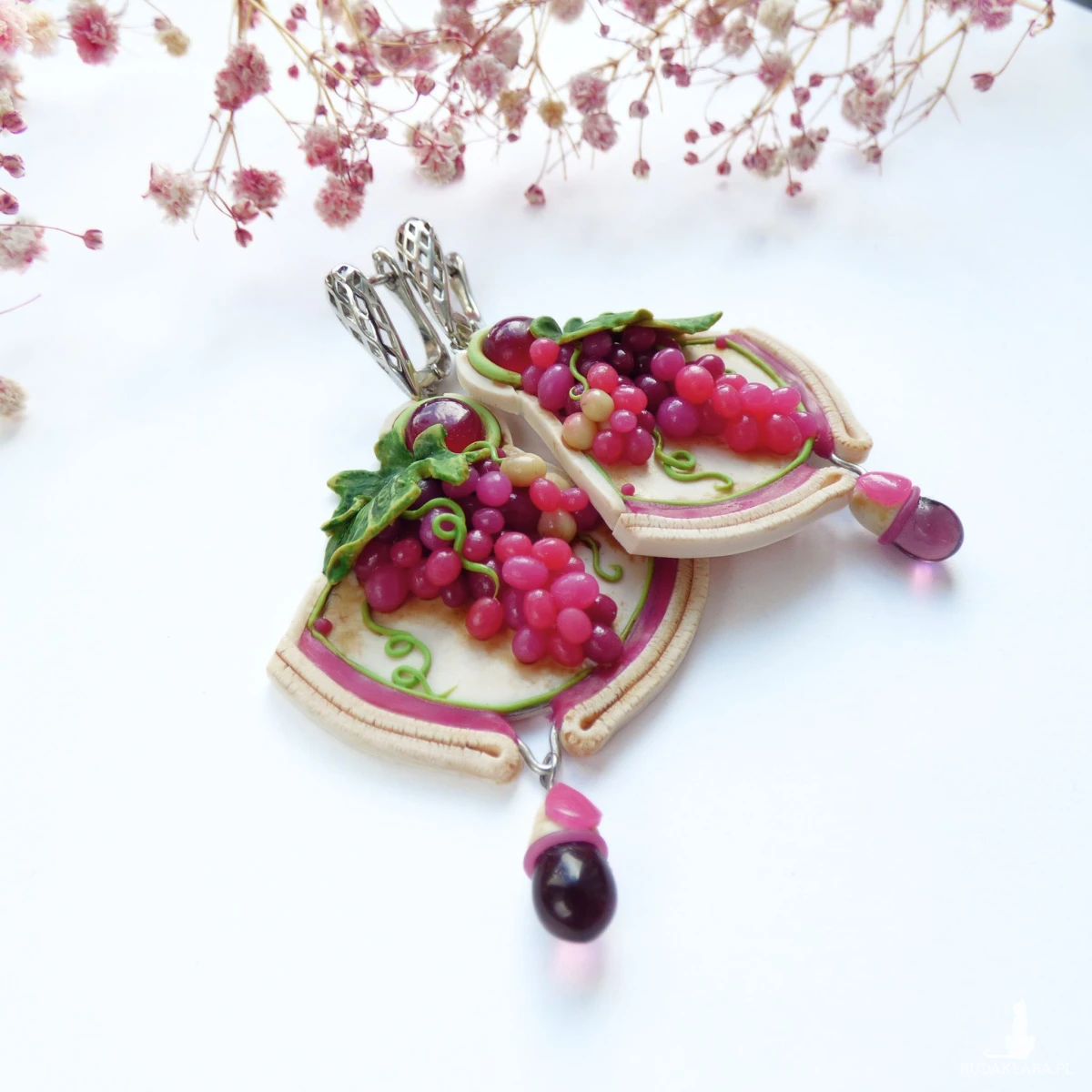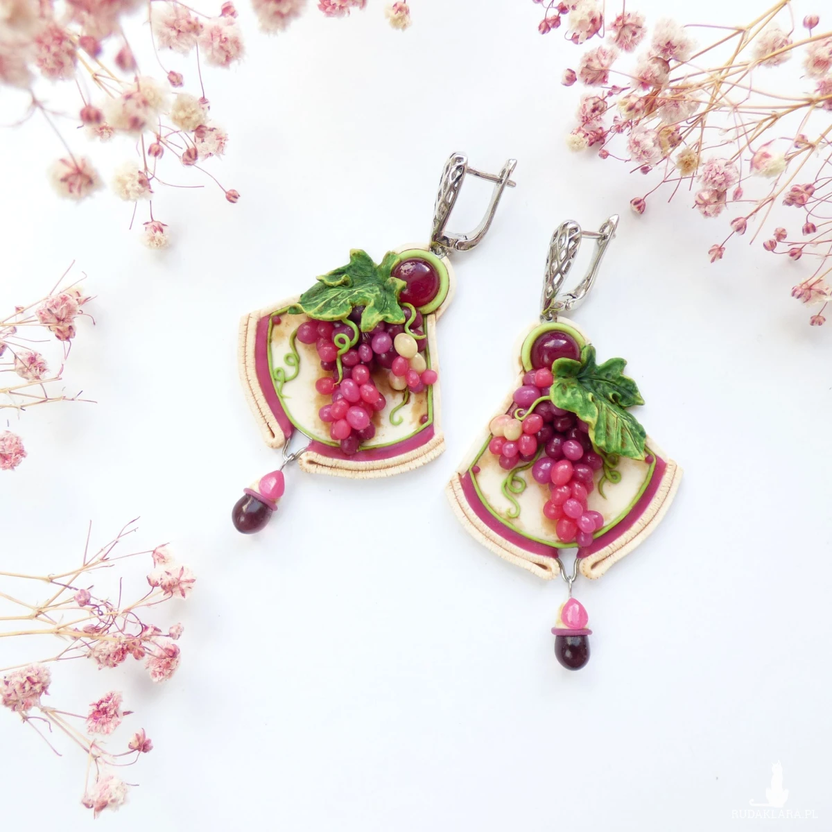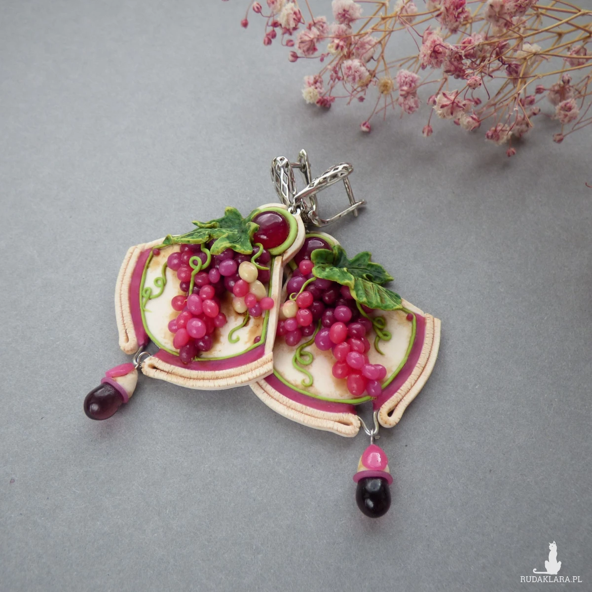 Ta efektowna para kolczyków przedstawia kiście winogron, których poszczególne owoce są na różnych etapach dojrzewania – od bladozielonych, jeszcze niedojrzałych kuleczek, po głęboko bordowe, soczyste owoce gotowe do zbioru. Winogrona w różnych kolorach i wielkościach ukazują piękno przemiany i cykliczności natury. Kompozycja liści, wijących się pędów winorośli oraz subtelnych detali nadaje biżuterii naturalny, artystyczny charakter.
