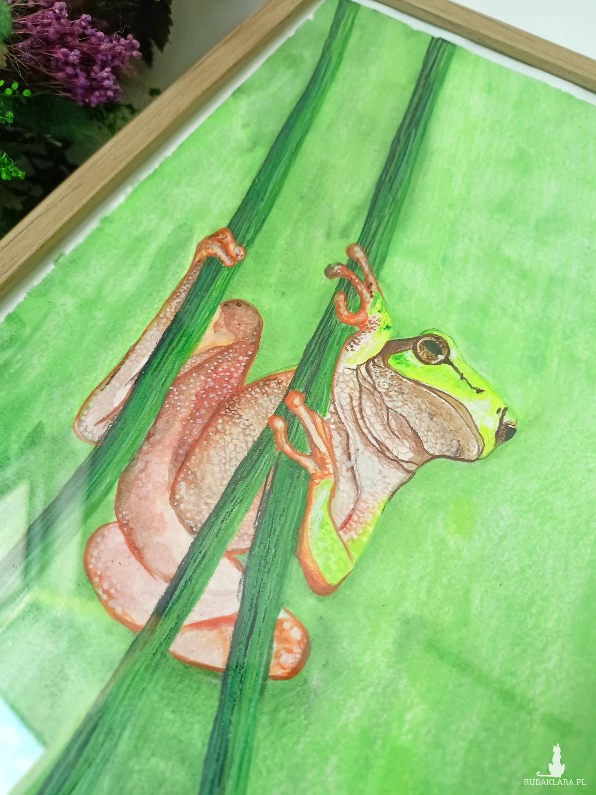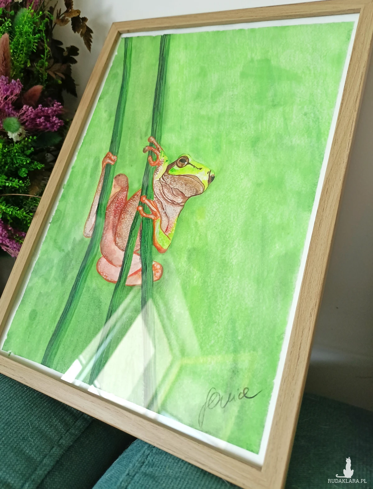 obraz żaba akwarela, rzekotka zielona ilustracja, akwarela ręcznie malowana, dekoracja ścienna z motywem natury, obraz A4 w ramce, rękodzieło akwarela, prezent dla miłośnika zwierząt, żaba do dekoracji, obrazek zielona żaba, sztuka botaniczna, obraz z ramką drewnianą