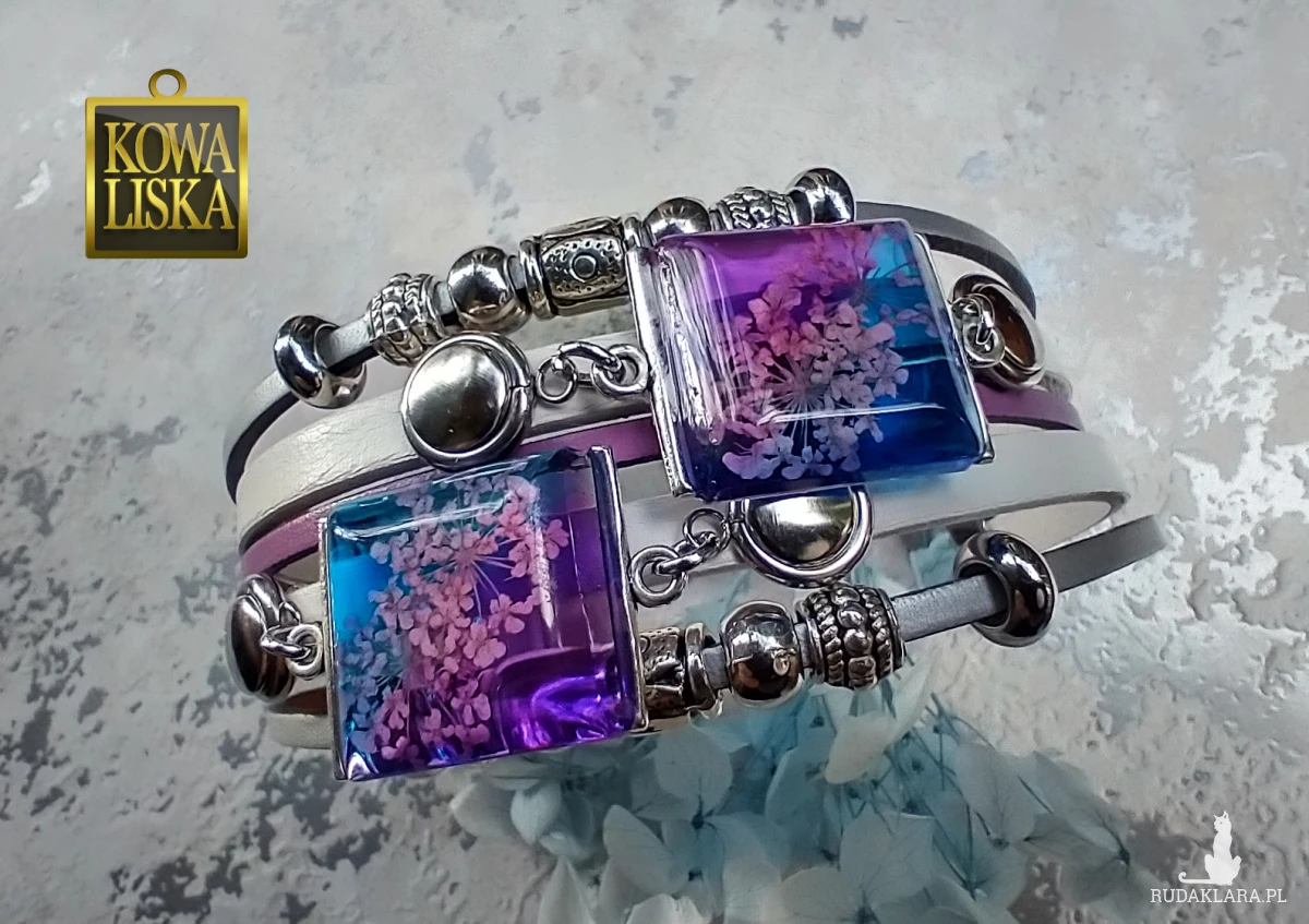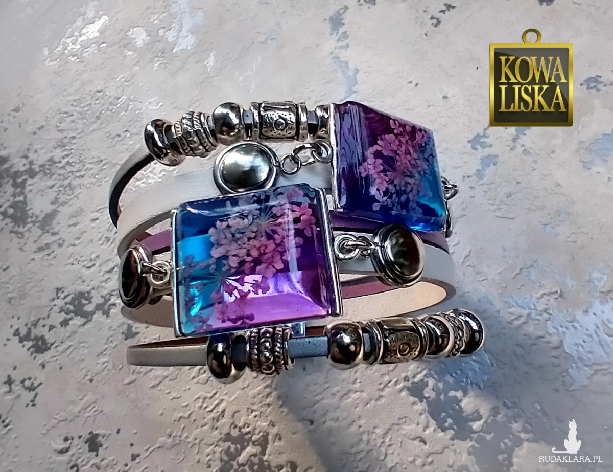 Efektowna, asymetryczna bransoleta, której centralnym elementem są duże, liliowe kwadraty, zamontowane na skórzanych pasach.