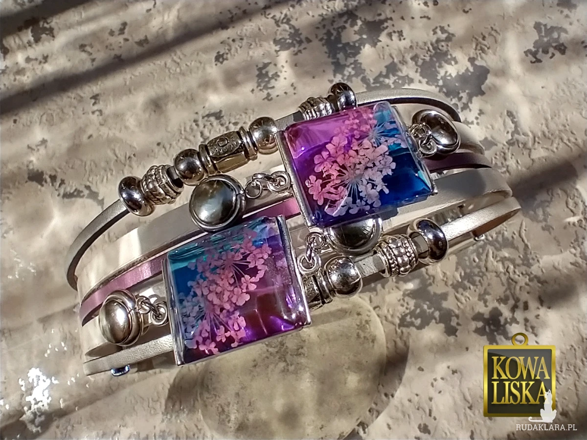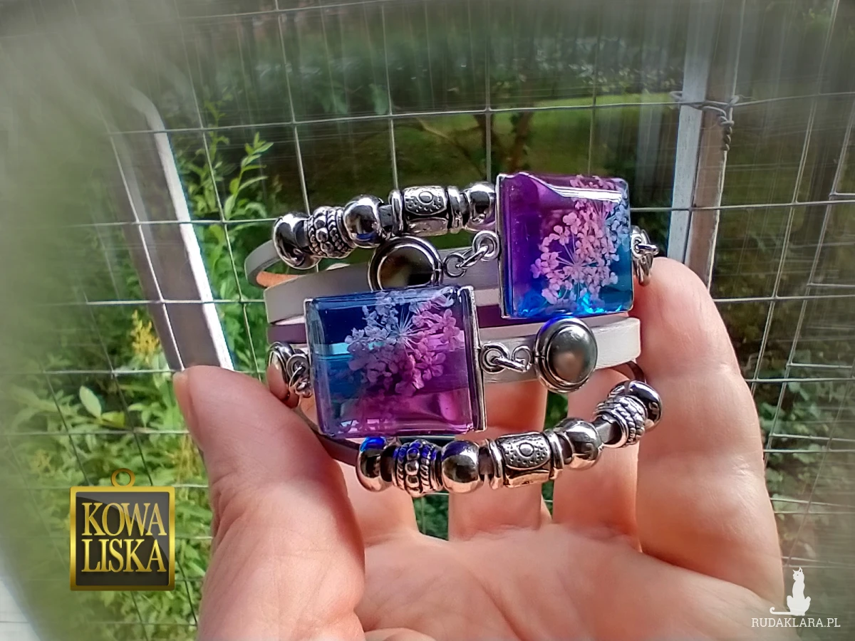 Ciężkość rzemieni i metalu pięknie się uzupełnia z eterycznością żywicy i kwiatów. Bransoleta bardzo dobrze leży i pięknie odbija światło, jest widoczna z daleka. Słońce wydobywa z niej ciepły, słoneczny blask, idealna na lato.