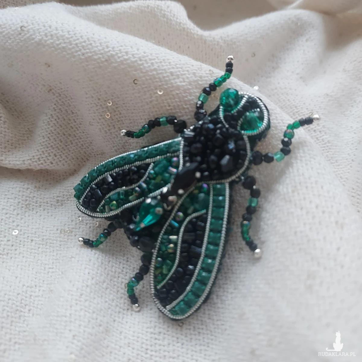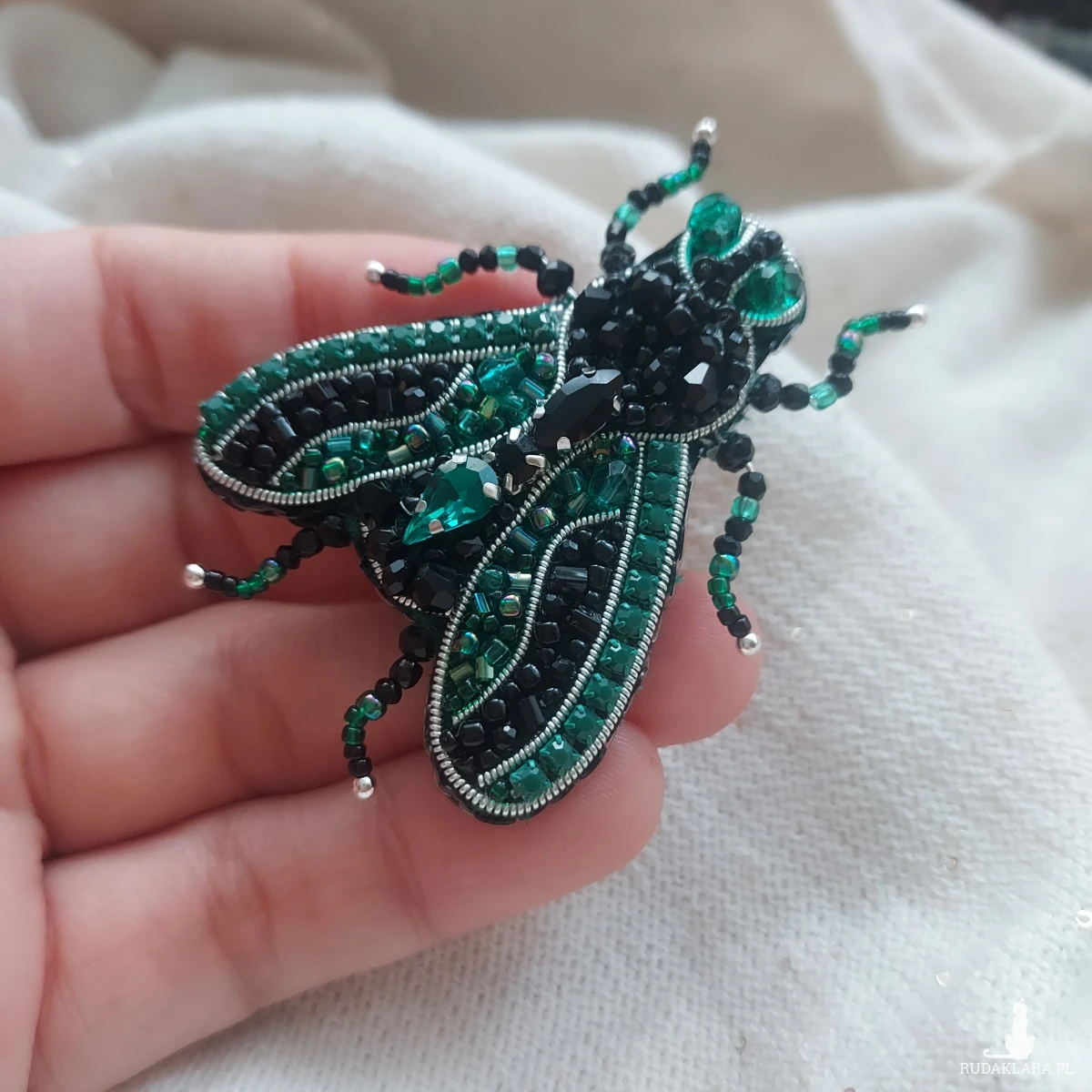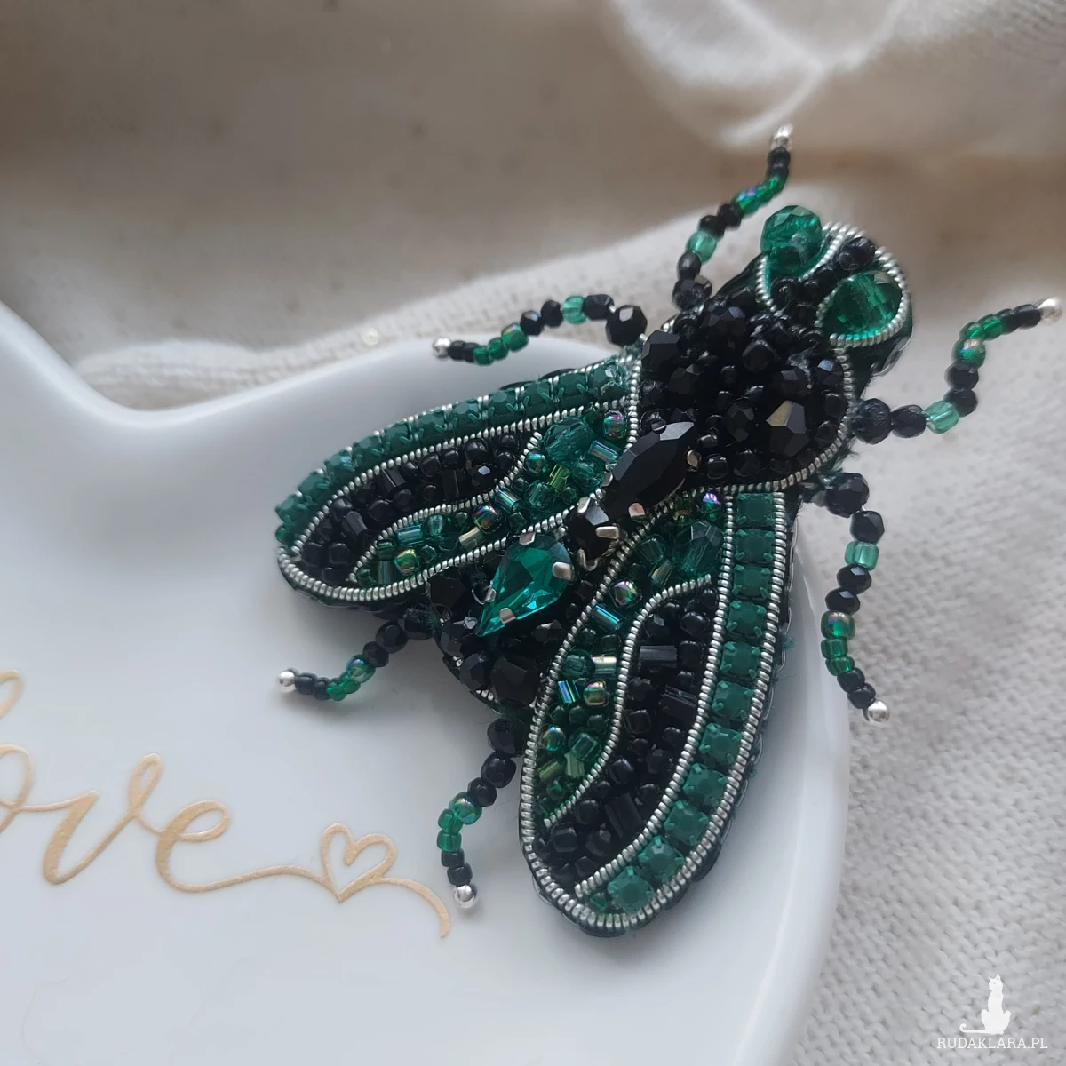 Odkryj piękno natury z wyjątkową broszką cza-szmaragdowo-czarną broszką w kształcie muchy.
