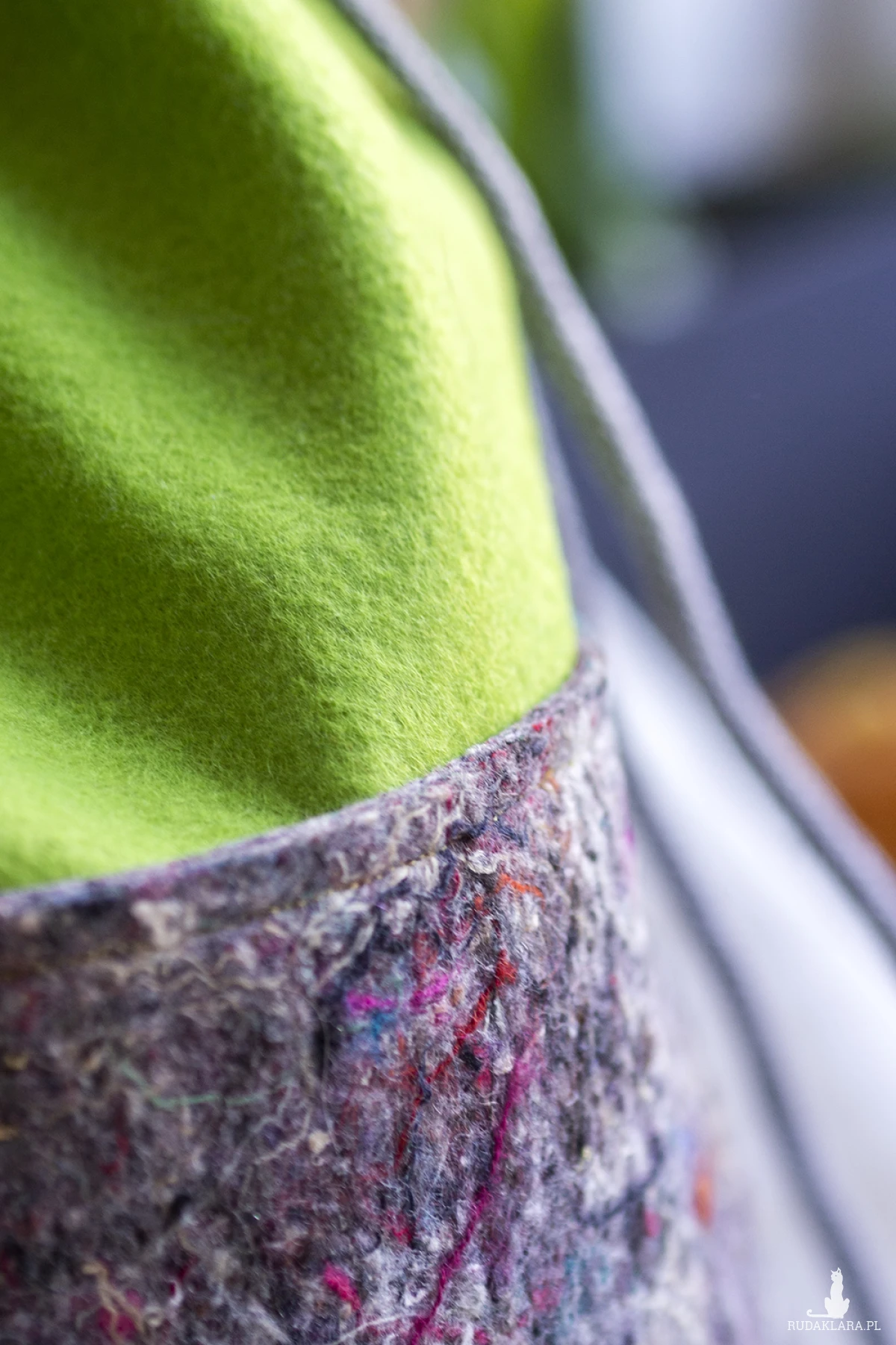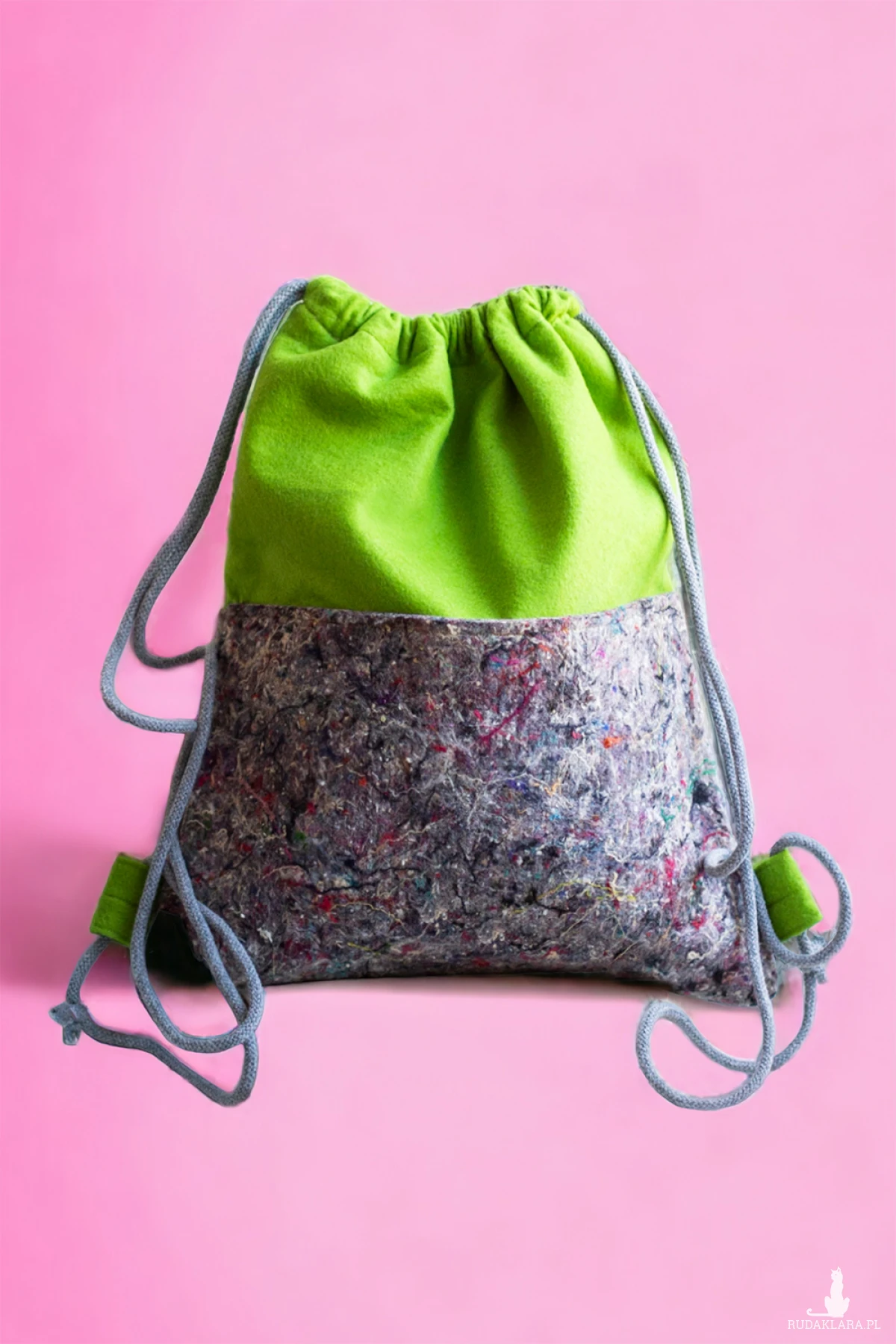 Plecak worek wykonany z filcu w kolorze zielonym w połączeniu z filcem technicznym.