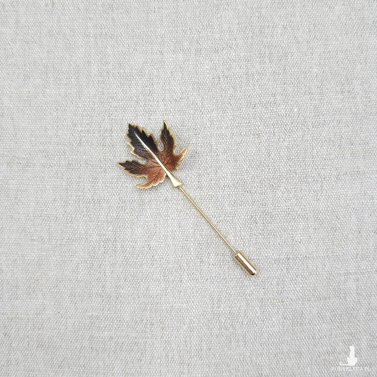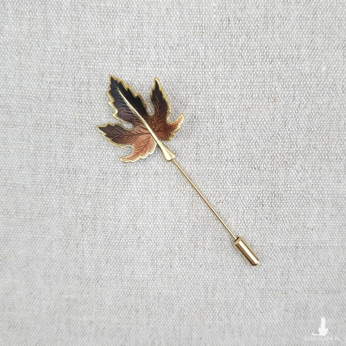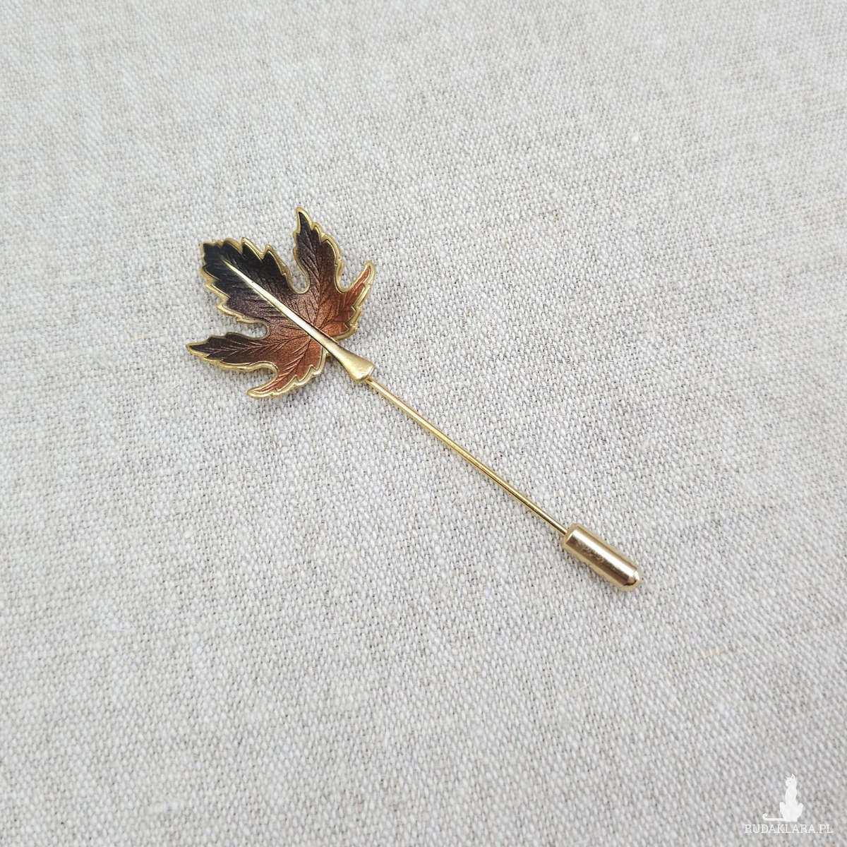 Szpilka z dekoracją w kształcie liścia klonu w odcieniach brązu z pozłacanymi krawędziami.