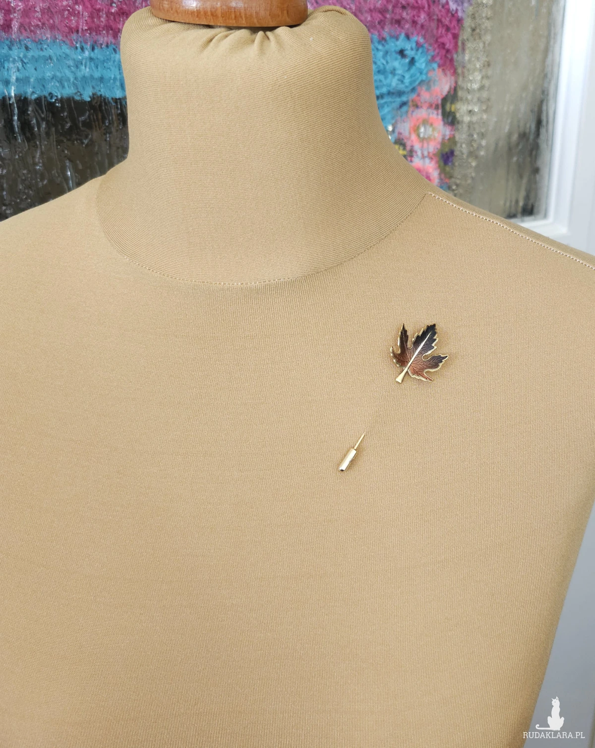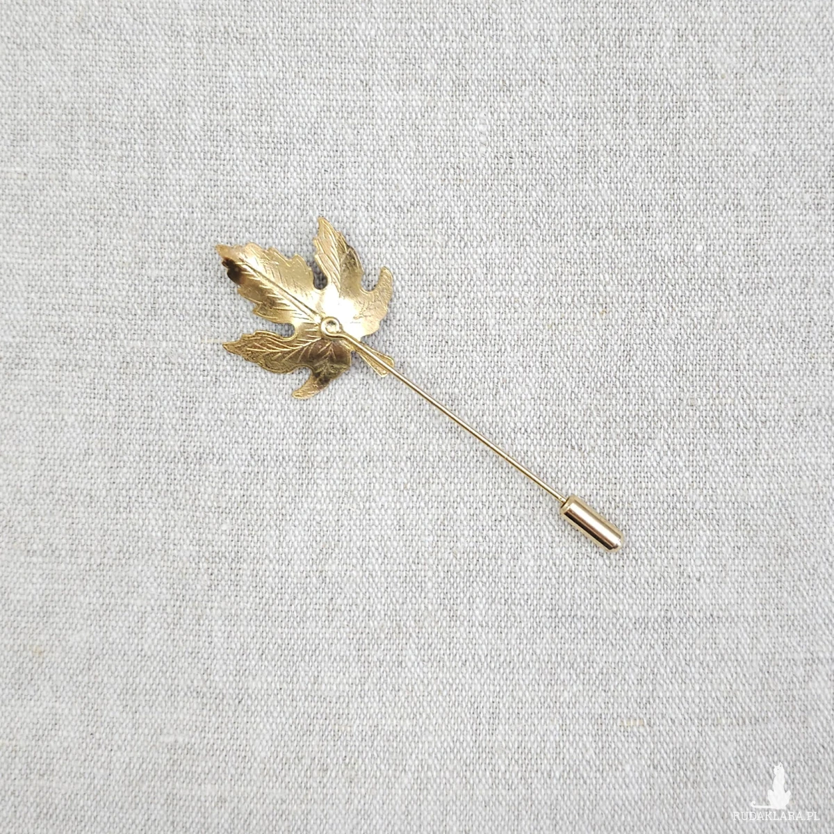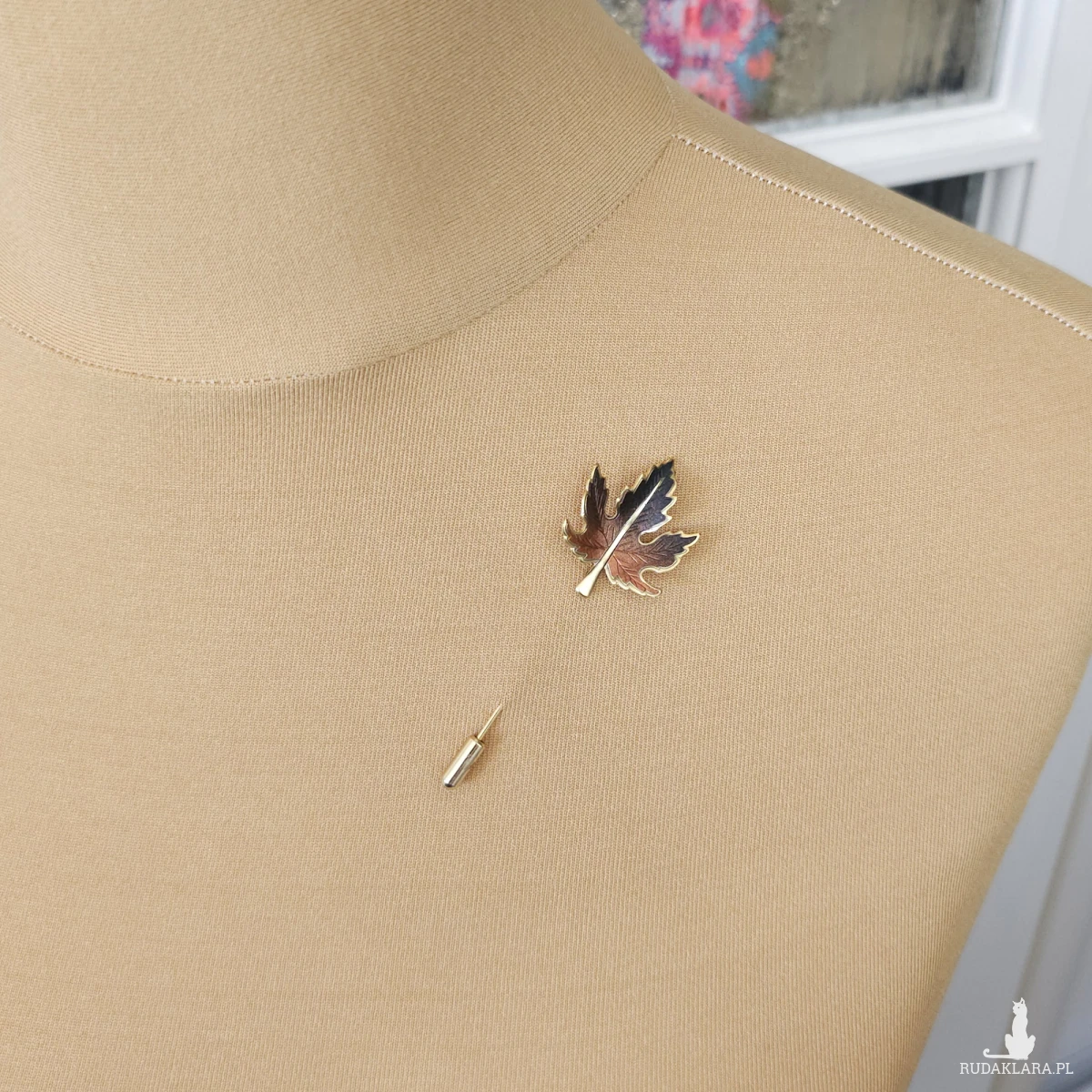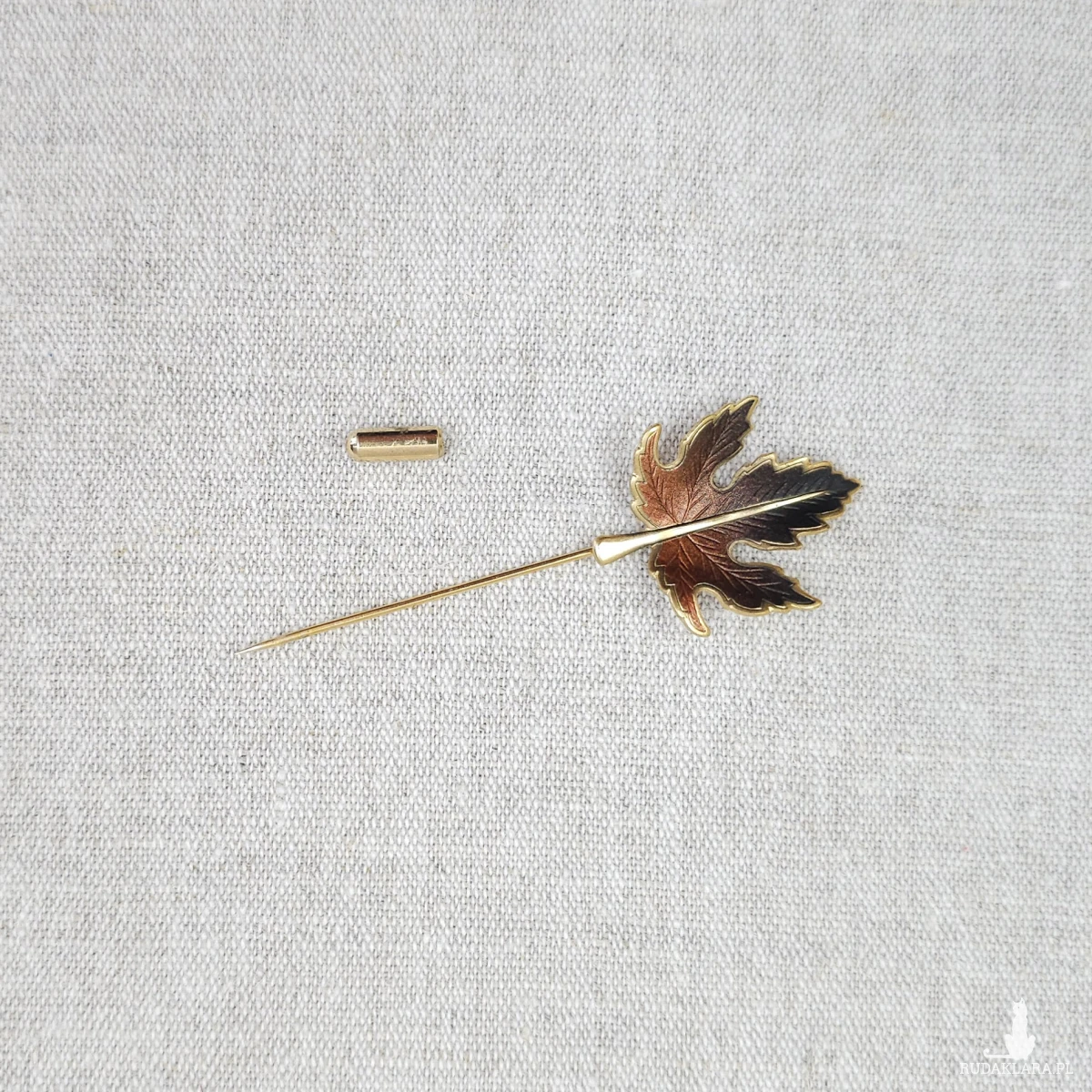 Szpilka z dekoracją w kształcie liścia klonu w odcieniach brązu z pozłacanymi krawędziami.