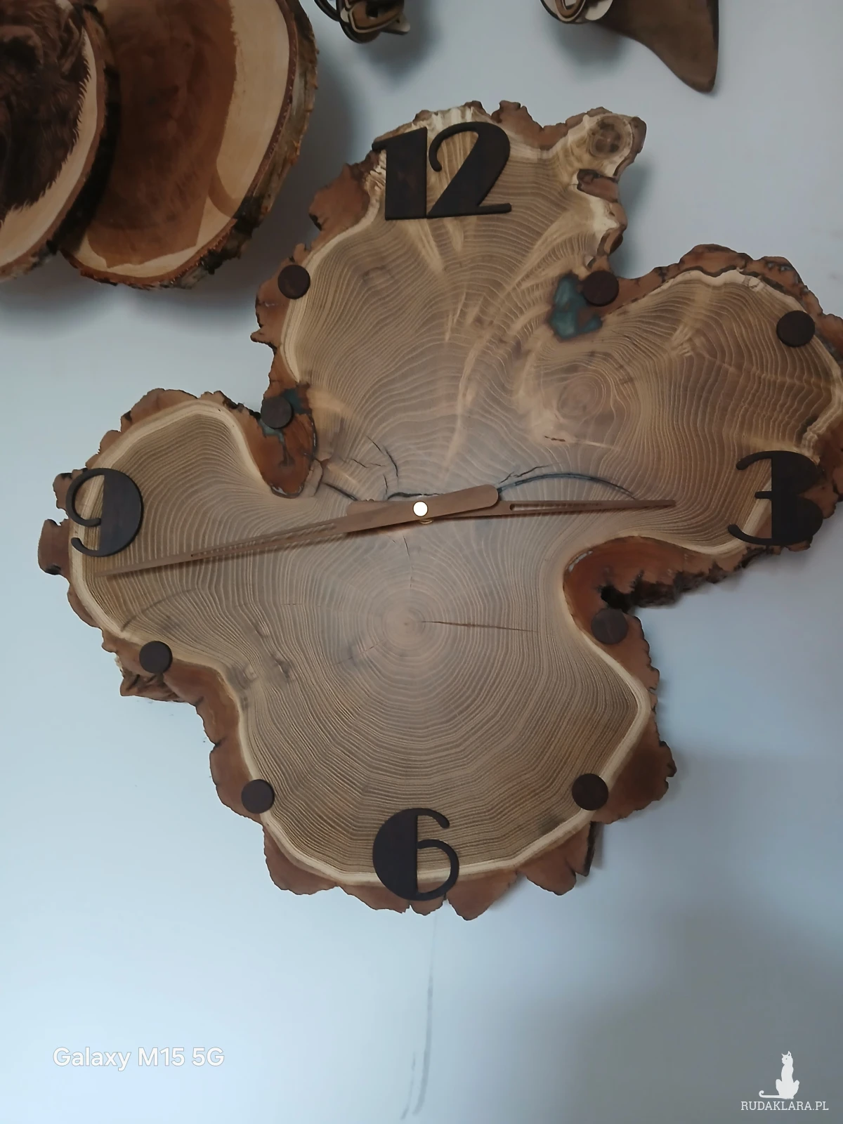 Zegar wykonany na plastrze akacji, z cichym mechanizmem, bez sekundowej wskazówki. Woskowany ,wymiary:49 cmx49cm.Kora zabezpieczona lakierem akrylowym .