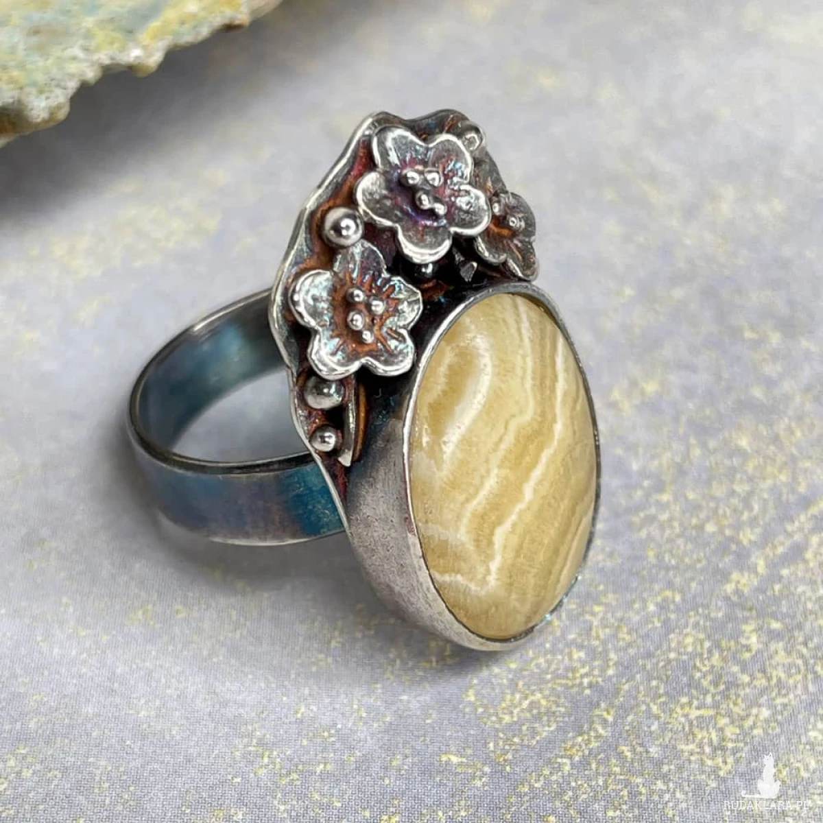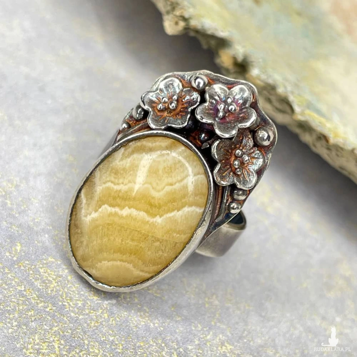 Kalcyt osadzony w zdobionej, srebrnej oprawie przyciąga uwagę subtelną grą barw i naturalnym rysunkiem, który przywodzi na myśl słoneczne pejzaże. Ręcznie wykonana oprawa ze srebra próby 925, ozdobiona delikatnym motywem florystycznym, nadaje pierścionkowi romantyczny, lekko secesyjny charakter. Oksydowane i przecierane srebro podkreśla detale oraz nadaje całości nieco artystycznej surowości. To idealna propozycja dla osób, które szukają biżuterii z duszą – eleganckiej, ale inspirowanej naturą. Pierścionek pięknie uzupełni zarówno codzienne, jak i bardziej wyrafinowane stylizacje, pozostając niepowtarzalnym akcentem każdej z nich.