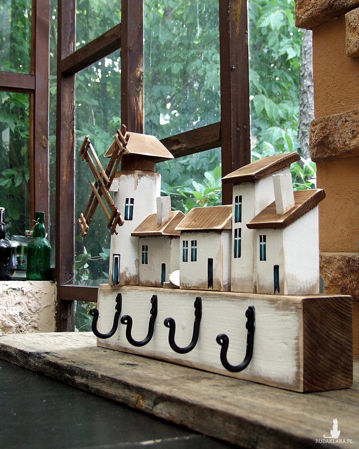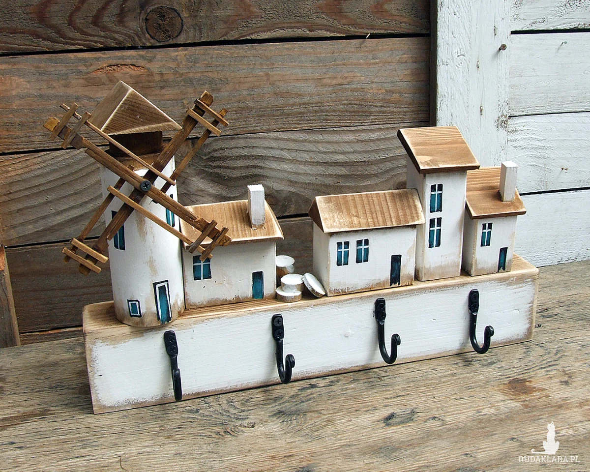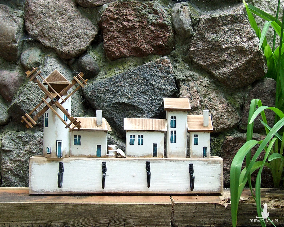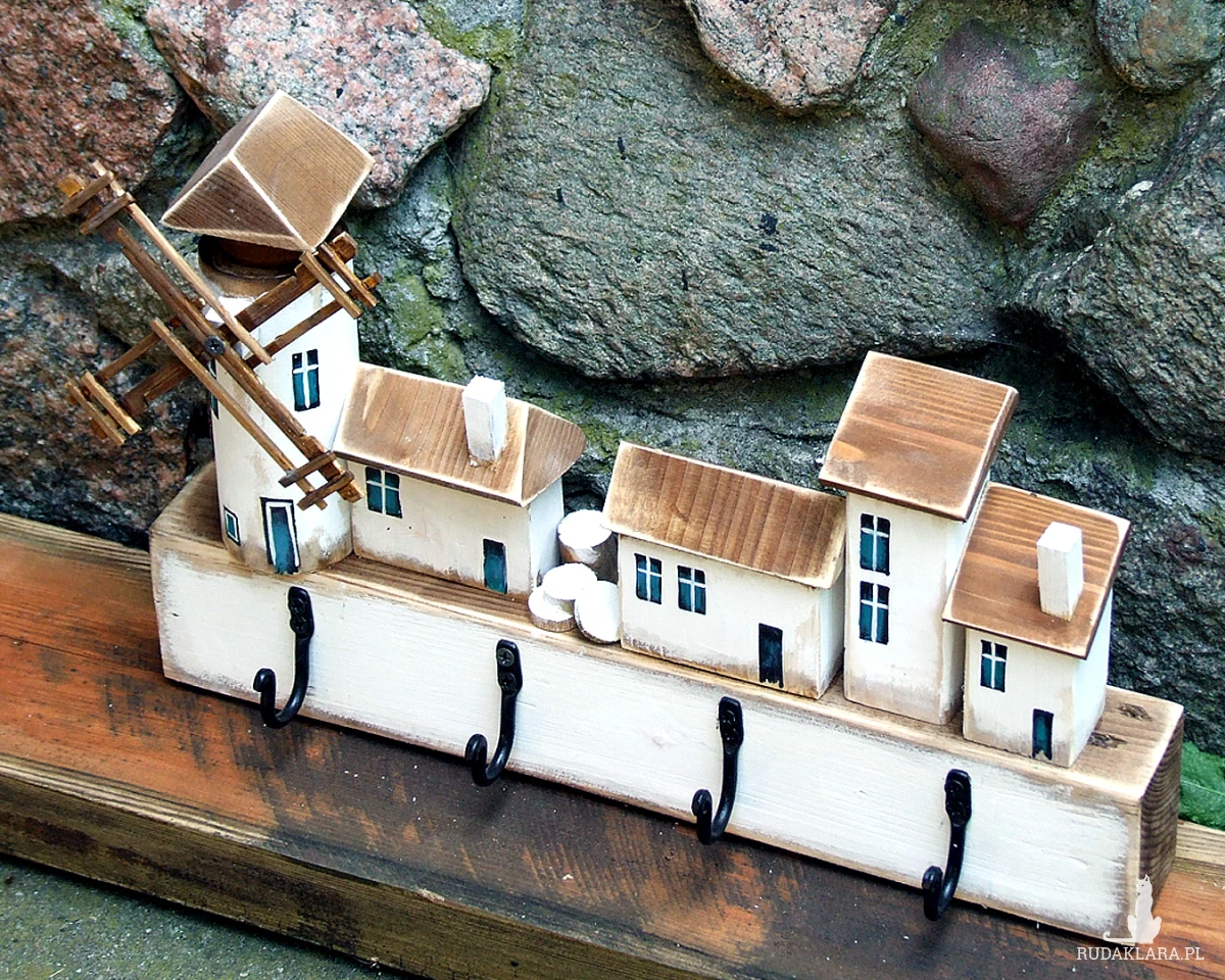 Do budowy tego wieszaka wykorzystaliśmy starą sosnową belkę, która ma ślady wcześniejszego użytkowania - rysy i małe otworki po gwoździach. Domki i latarnia zostały ręcznie docięte i poskładane, lekko przeszlifowane, przetarte białą farbą i zabezpieczone lakierem akrylowym. Jedyny dodatkowy kolor to szmaragdowa zieleń w okienkach i czarne obrysy.