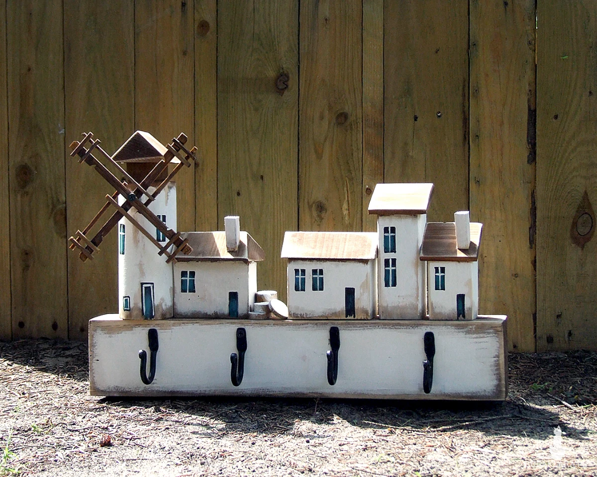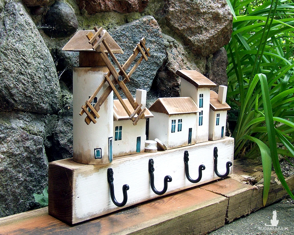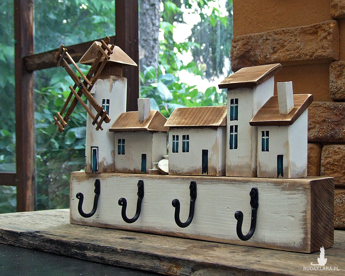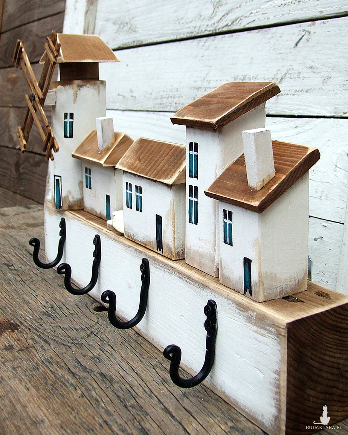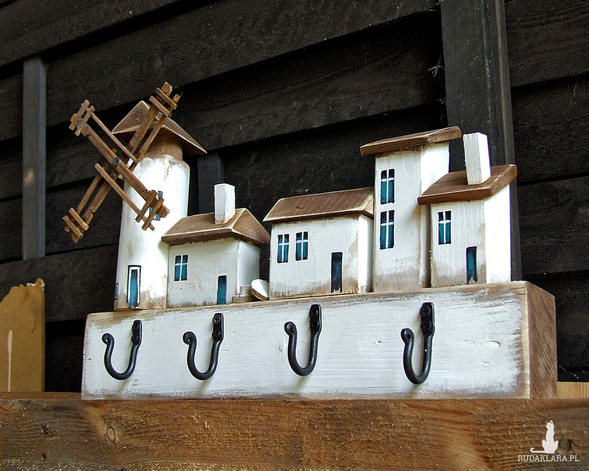 Do budowy tego wieszaka wykorzystaliśmy starą sosnową belkę, która ma ślady wcześniejszego użytkowania - rysy i małe otworki po gwoździach. Domki i latarnia zostały ręcznie docięte i poskładane, lekko przeszlifowane, przetarte białą farbą i zabezpieczone lakierem akrylowym. Jedyny dodatkowy kolor to szmaragdowa zieleń w okienkach i czarne obrysy.