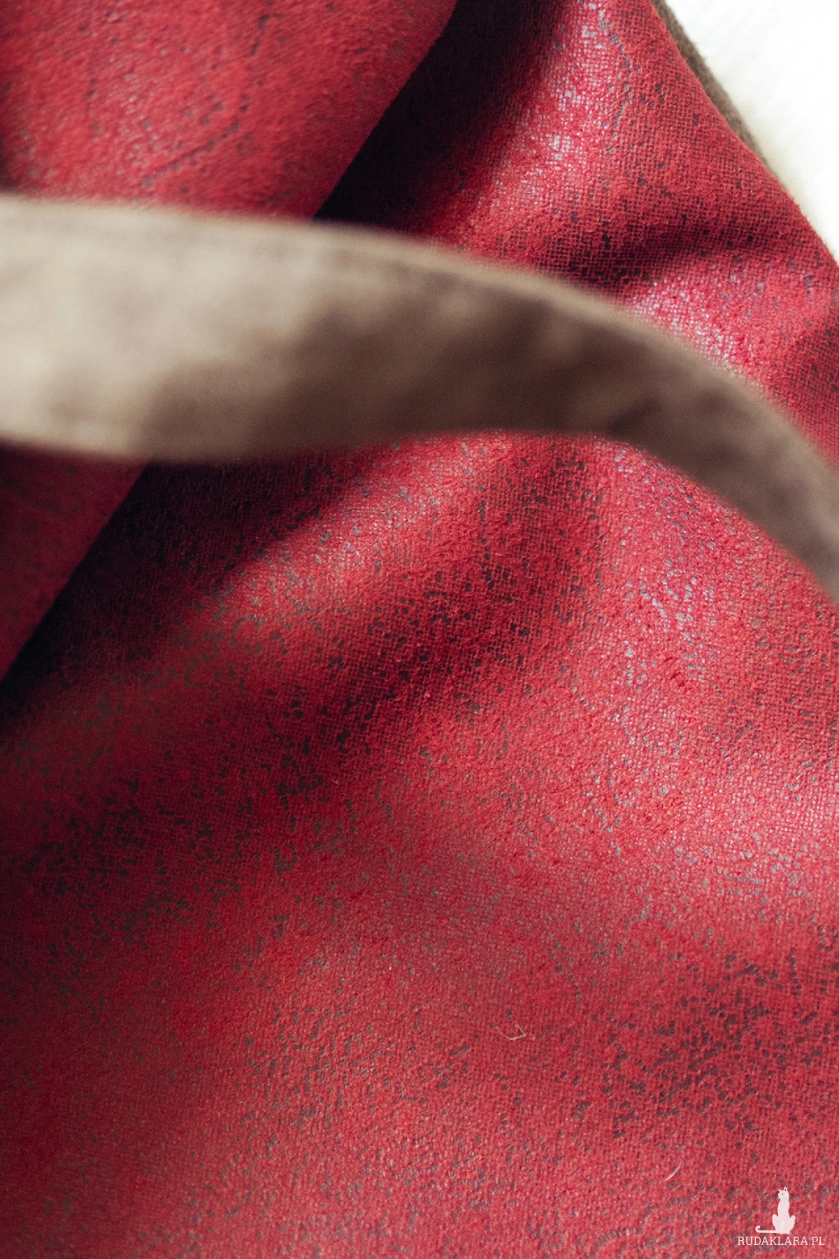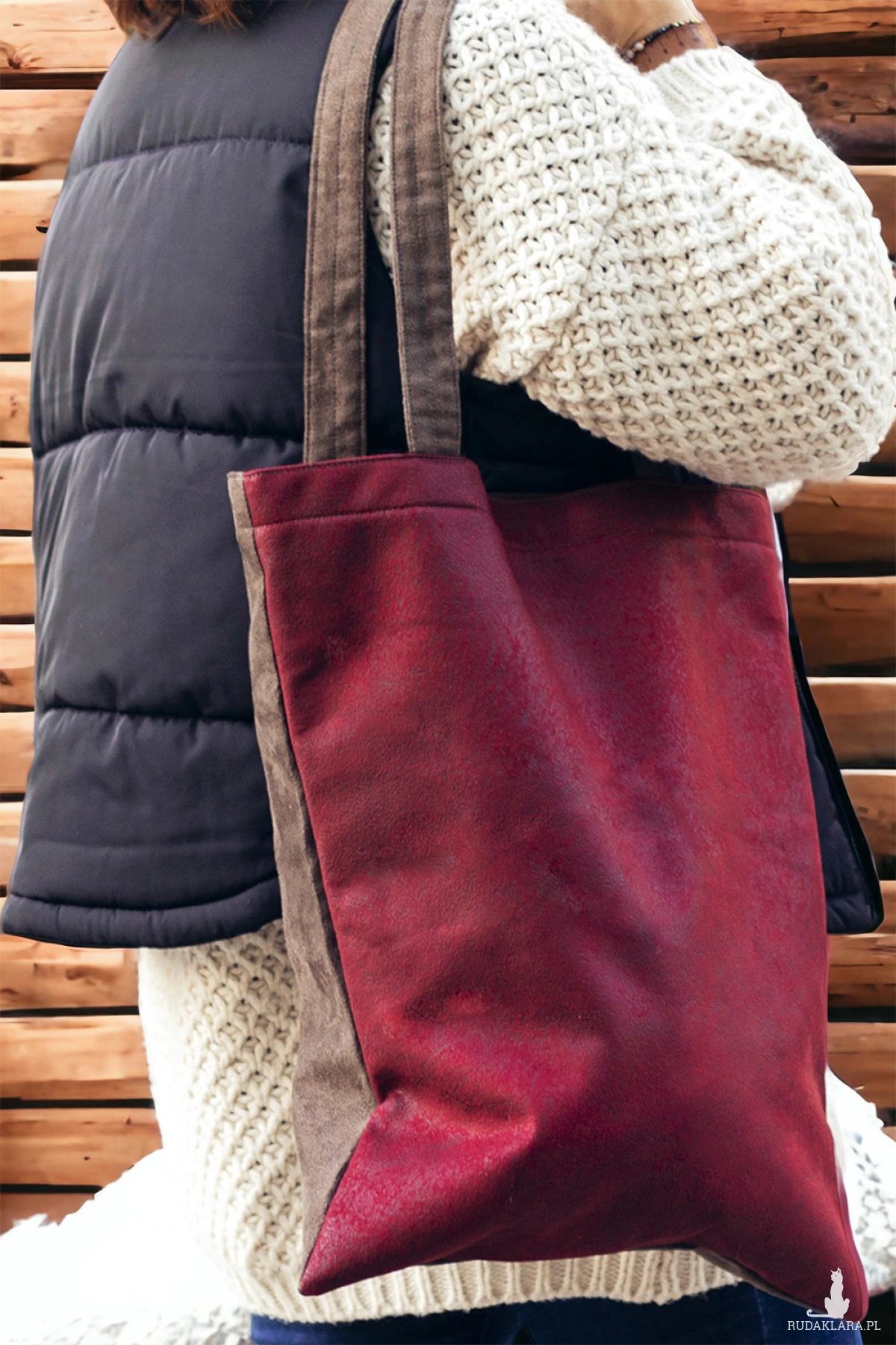 Duża torba na ramię typu shopper wykonana z bordowej tkaniny imitującej ekoskórę oraz brązowego nubuku.