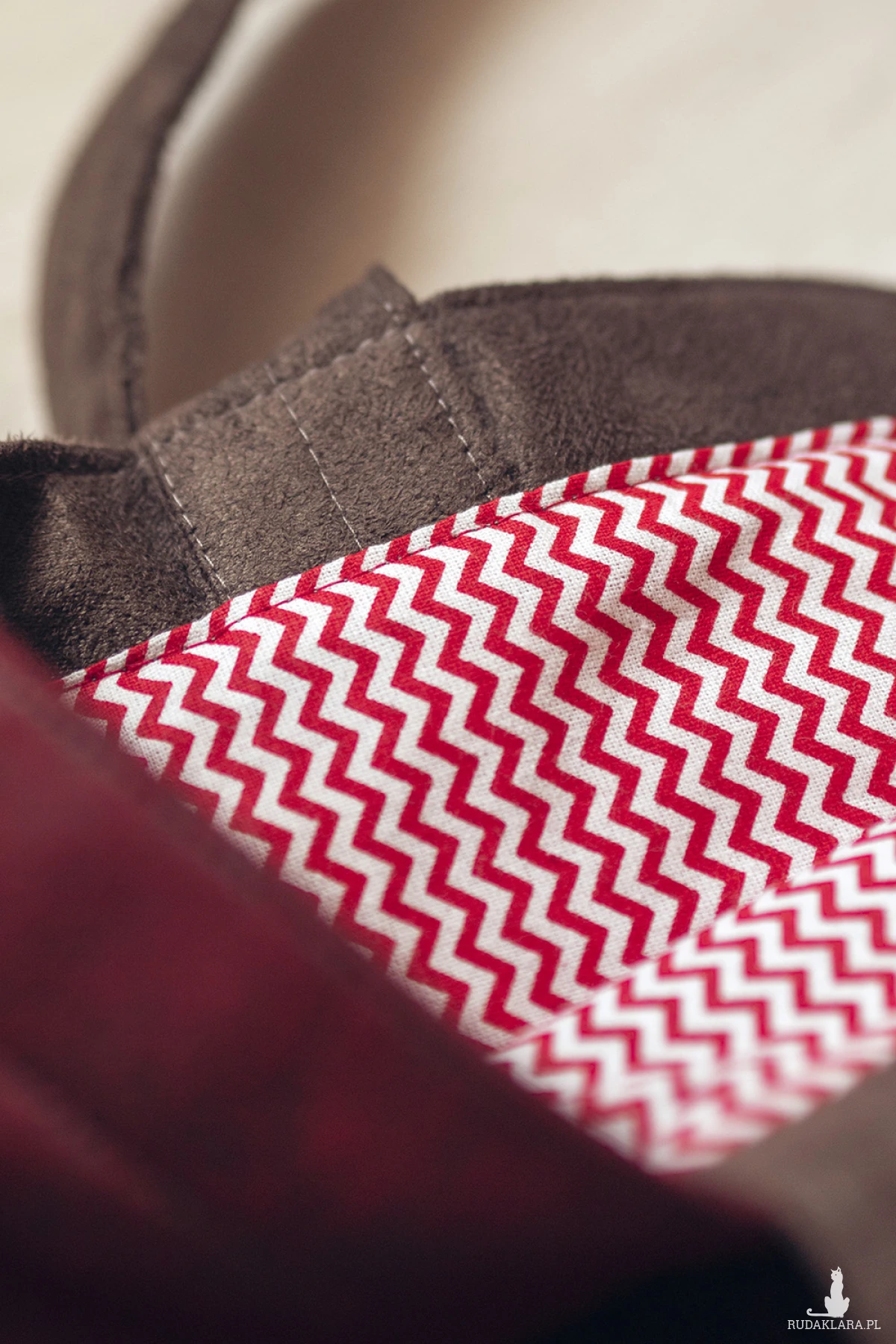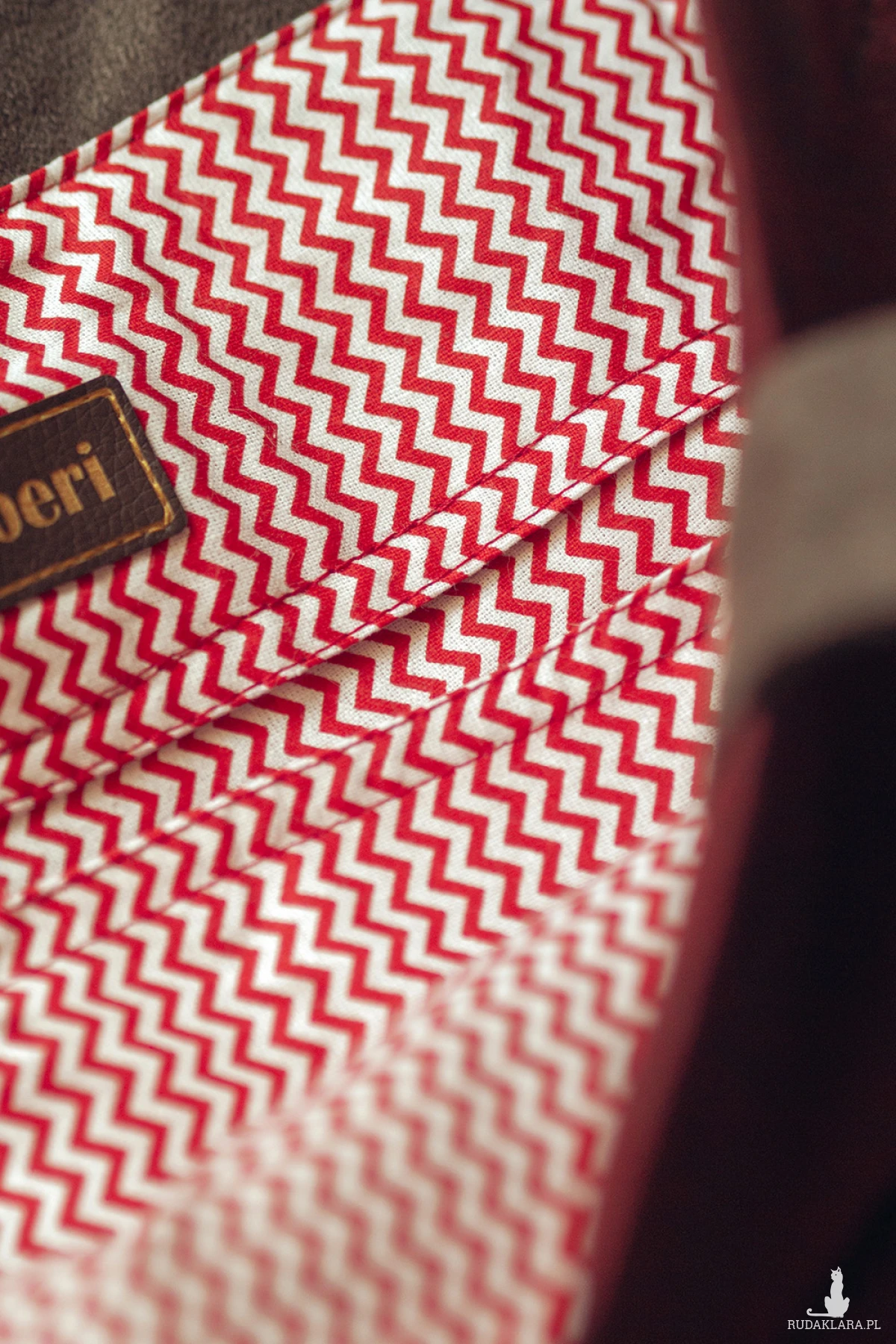 Torebka posiada bawełnianą podszewkę w zygzaki, a w środku kieszeń. Z tyłu torby znajduje się dodatkowa kieszonka zapinana na suwak.