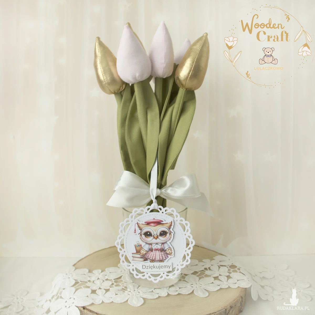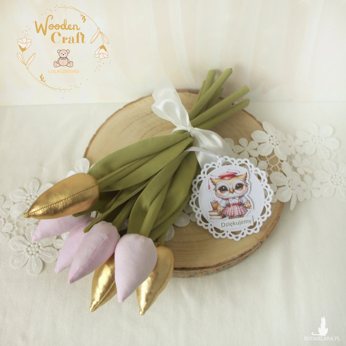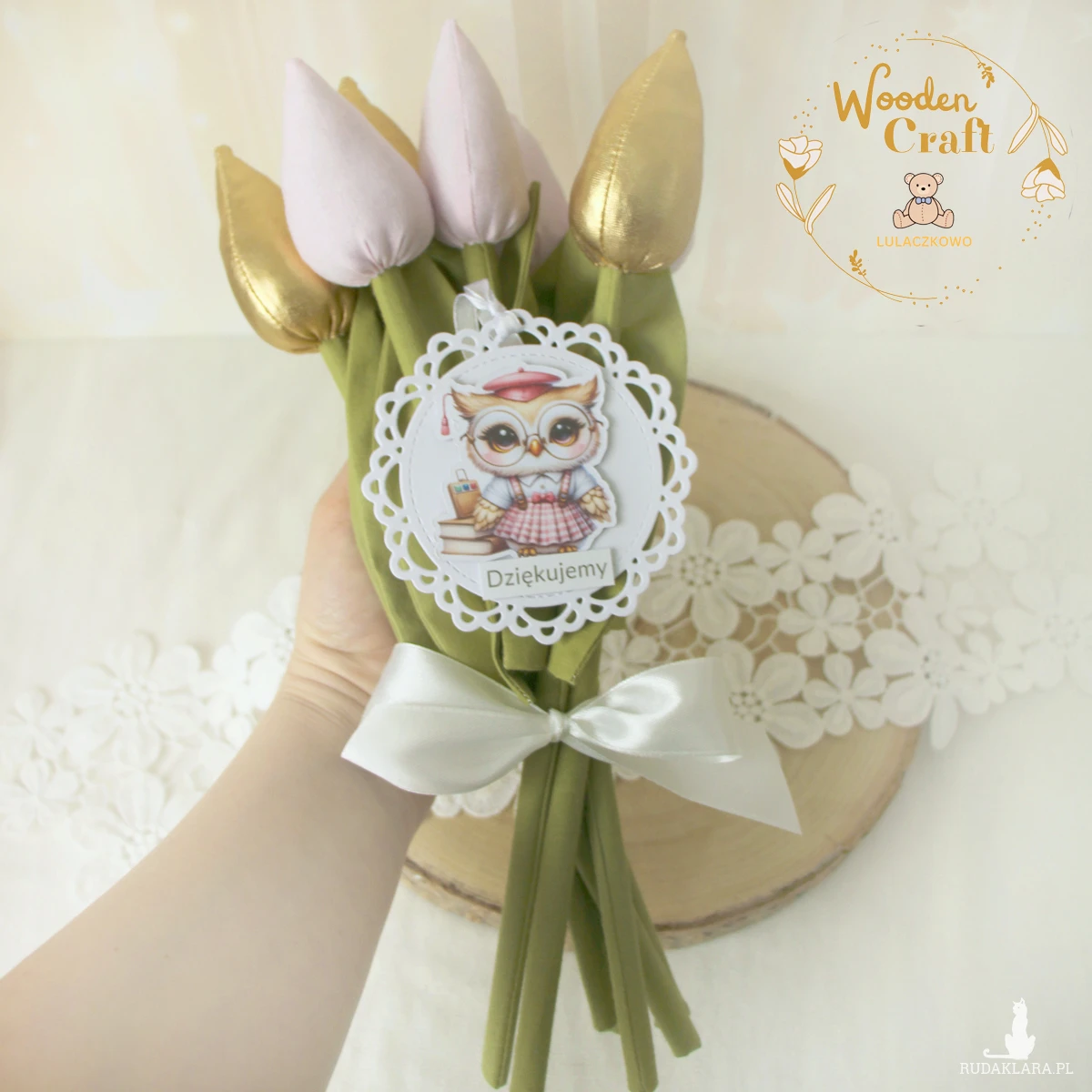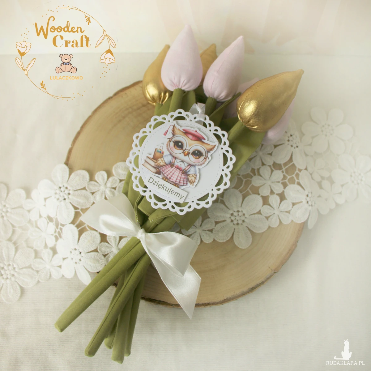 Śliczne, ręcznie szyte materiałowe tulipany, idealne jako prezent na zakończenie roku szkolnego dla nauczyciela, wychowawcy. Bukiet ma dołączony bilecik z uroczą sową oraz napisem "Dziękujemy" na odwrocie mogę również umieścić dowolną dedykację.
