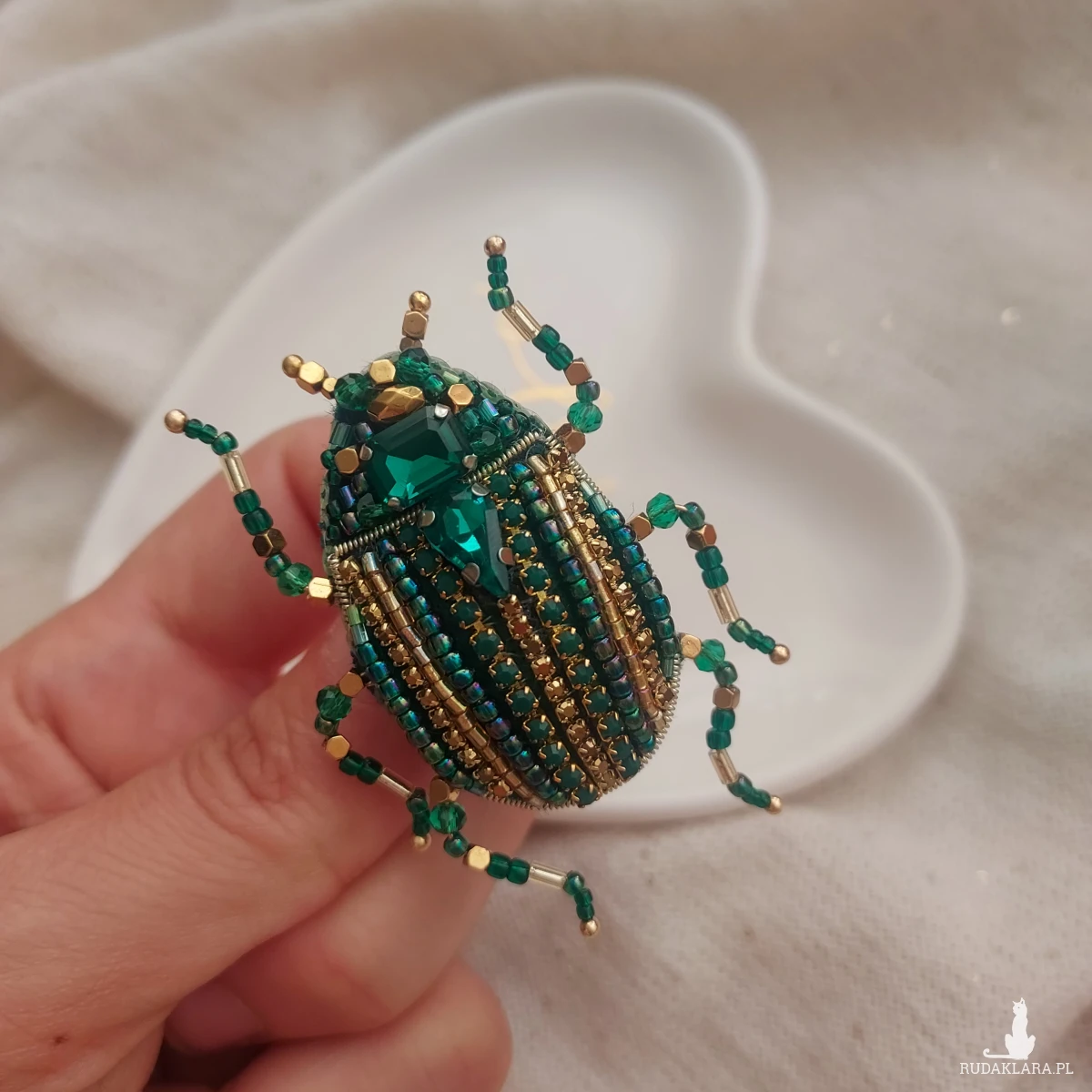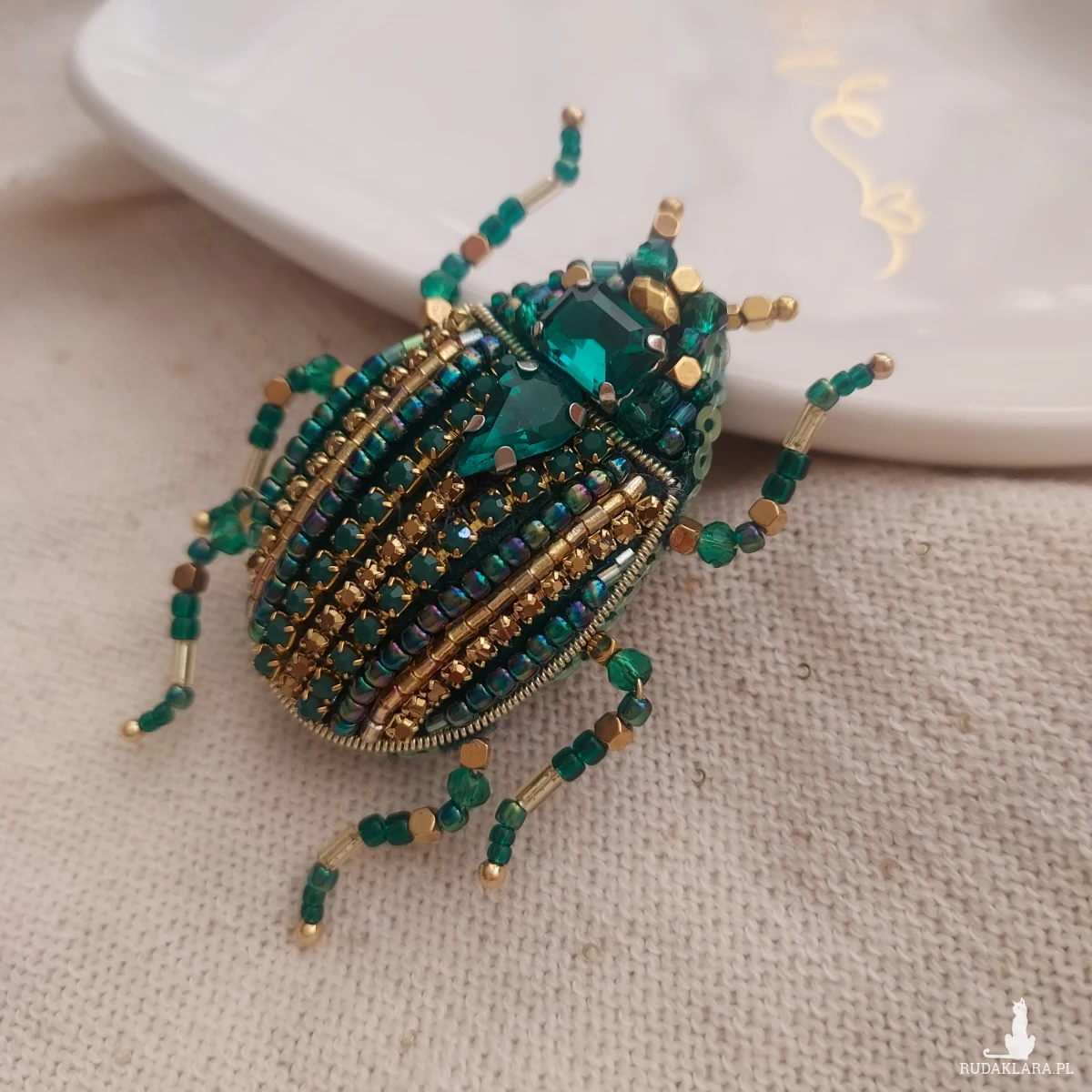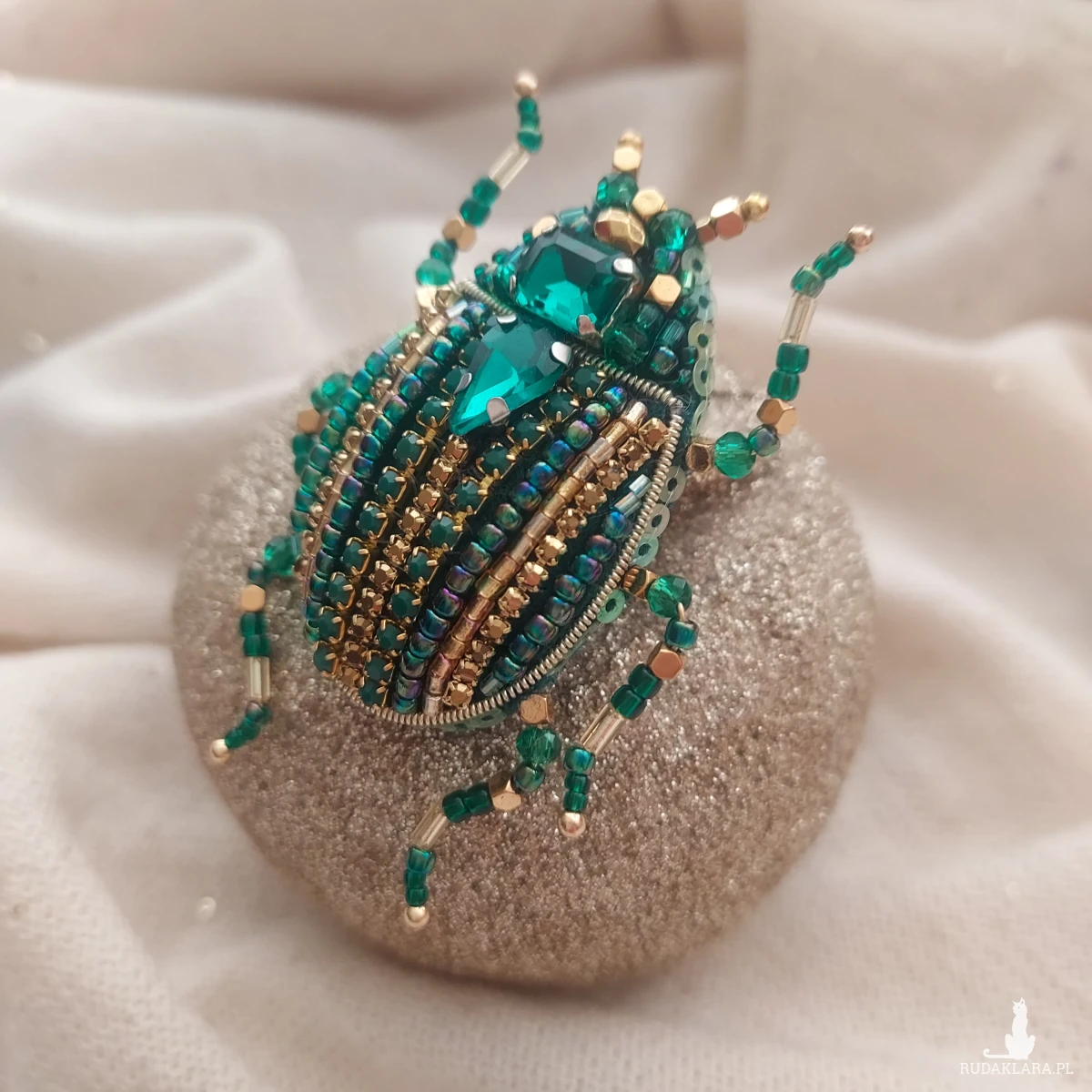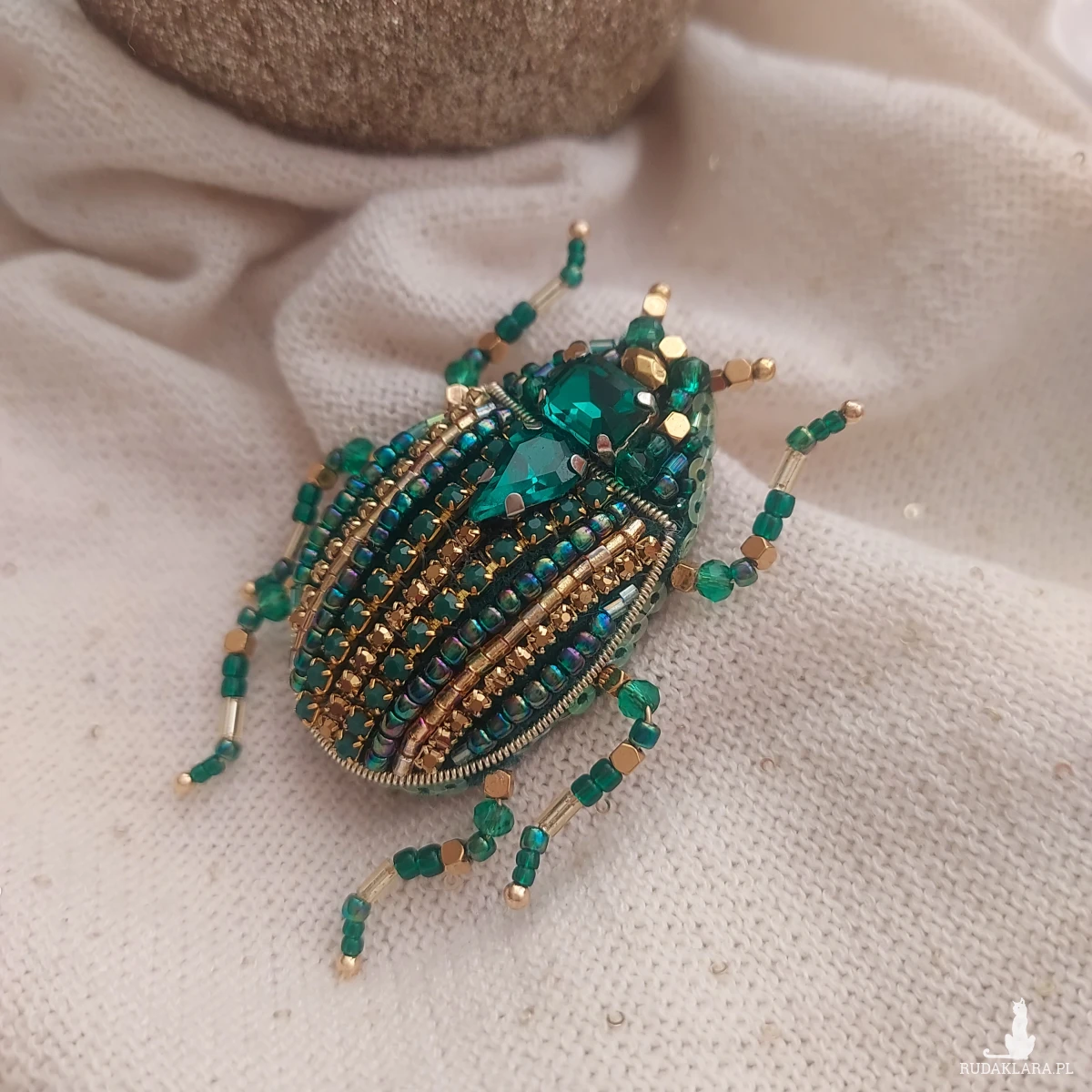 Wiosenno-letnia broszka żuczek w kolorze szmaragdowo-złotym powstała techniką haftu koralikowego.